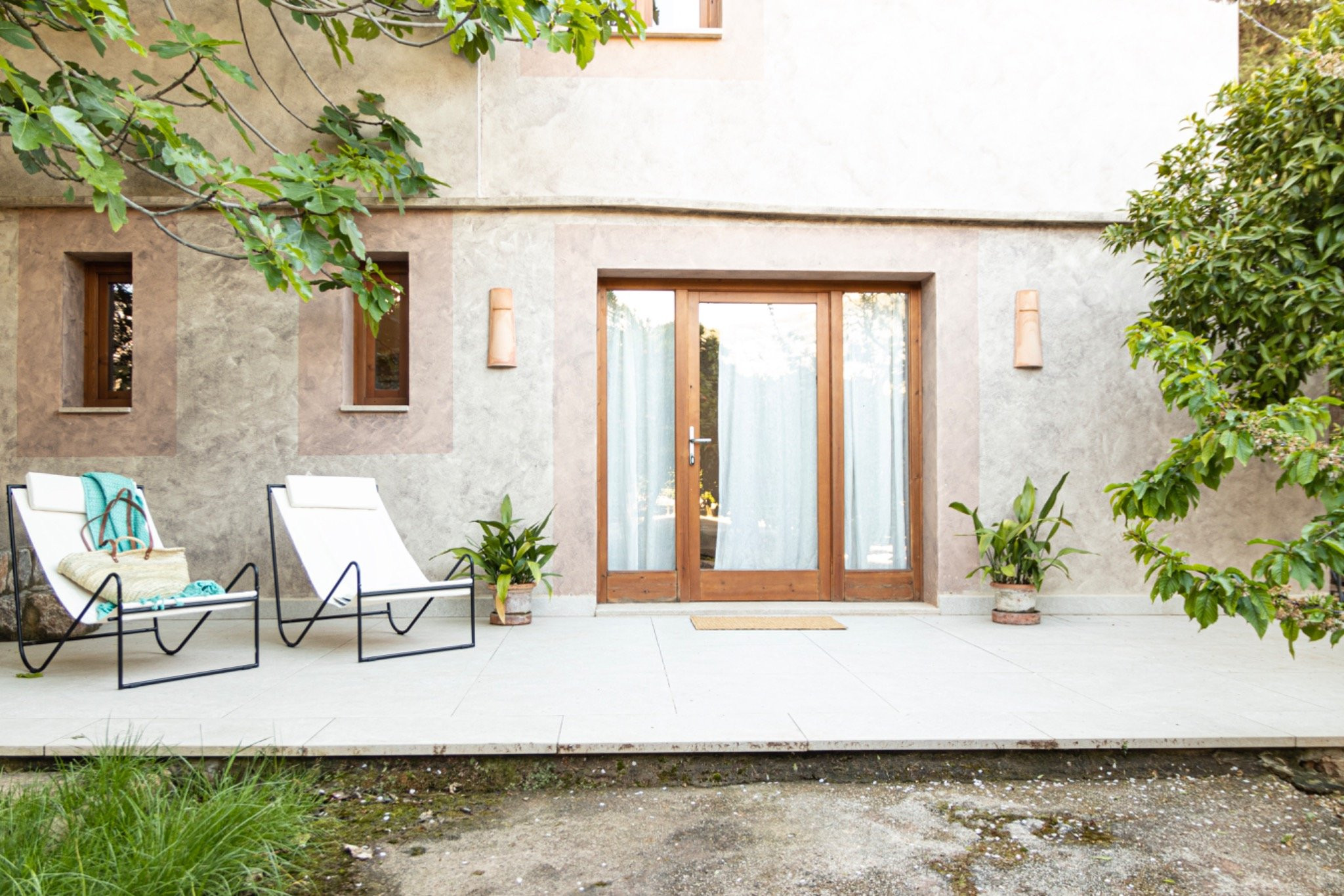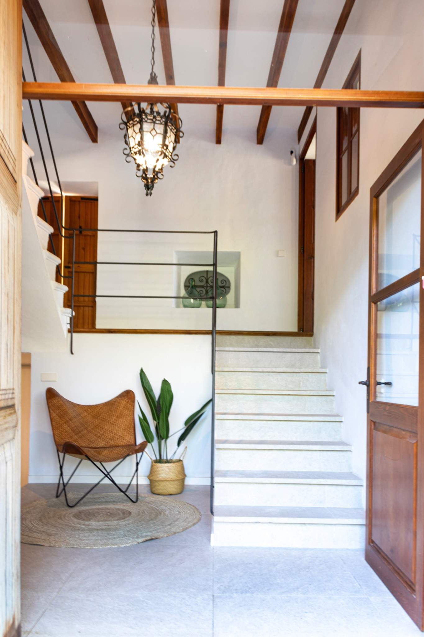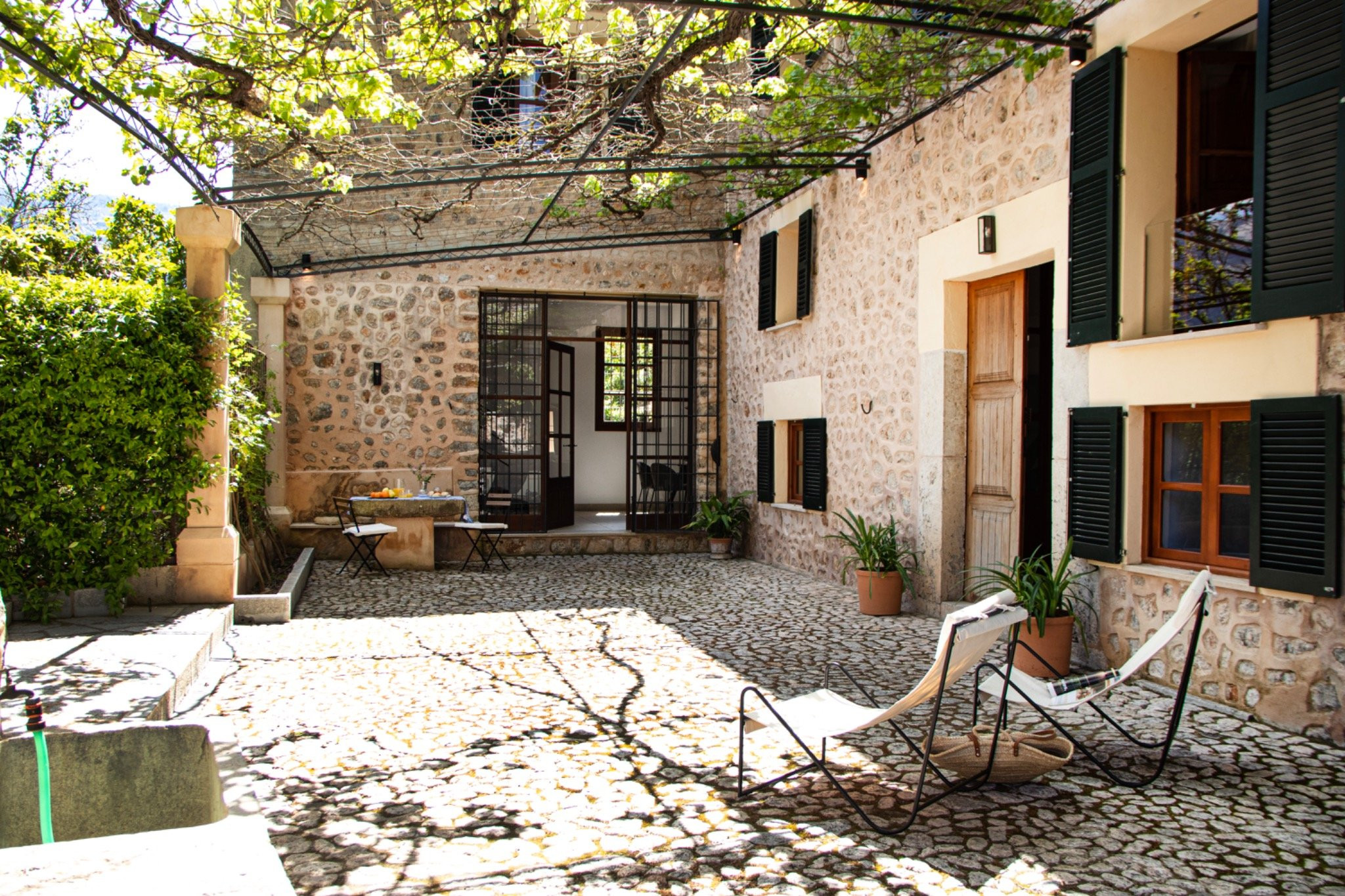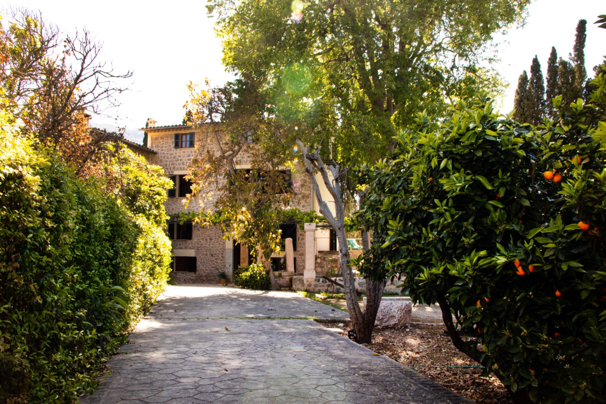 Die Villa zeichnet sich durch eine harmonische Kombination aus traditioneller mallorquinischer Architektur und einem modernen, einladenden Stil aus. Der Eingang erfolgt durch eine reizvolle Pergola, umgeben von Obstbäumen, vorbei an einer alten Wassermühle und einem Teich - authentische Elemente, die den Charakter dieses Anwesens unterstreichen und ihm einen echten mediterranen Charme verleihen.