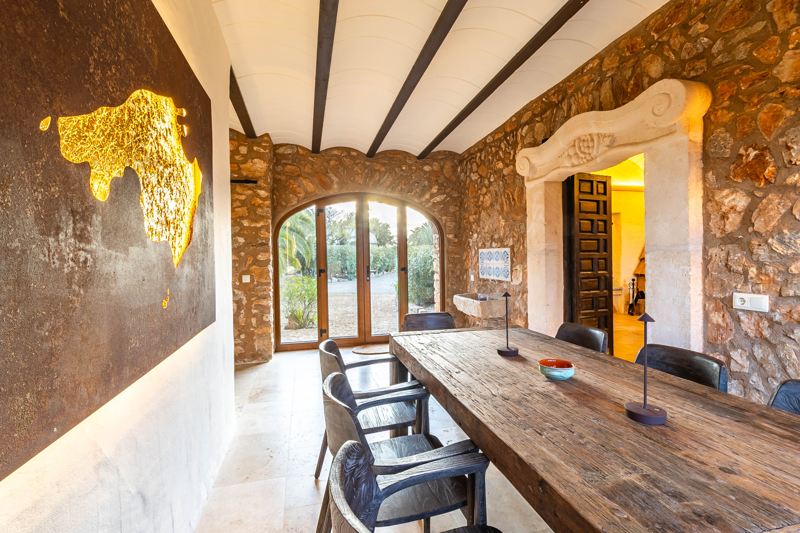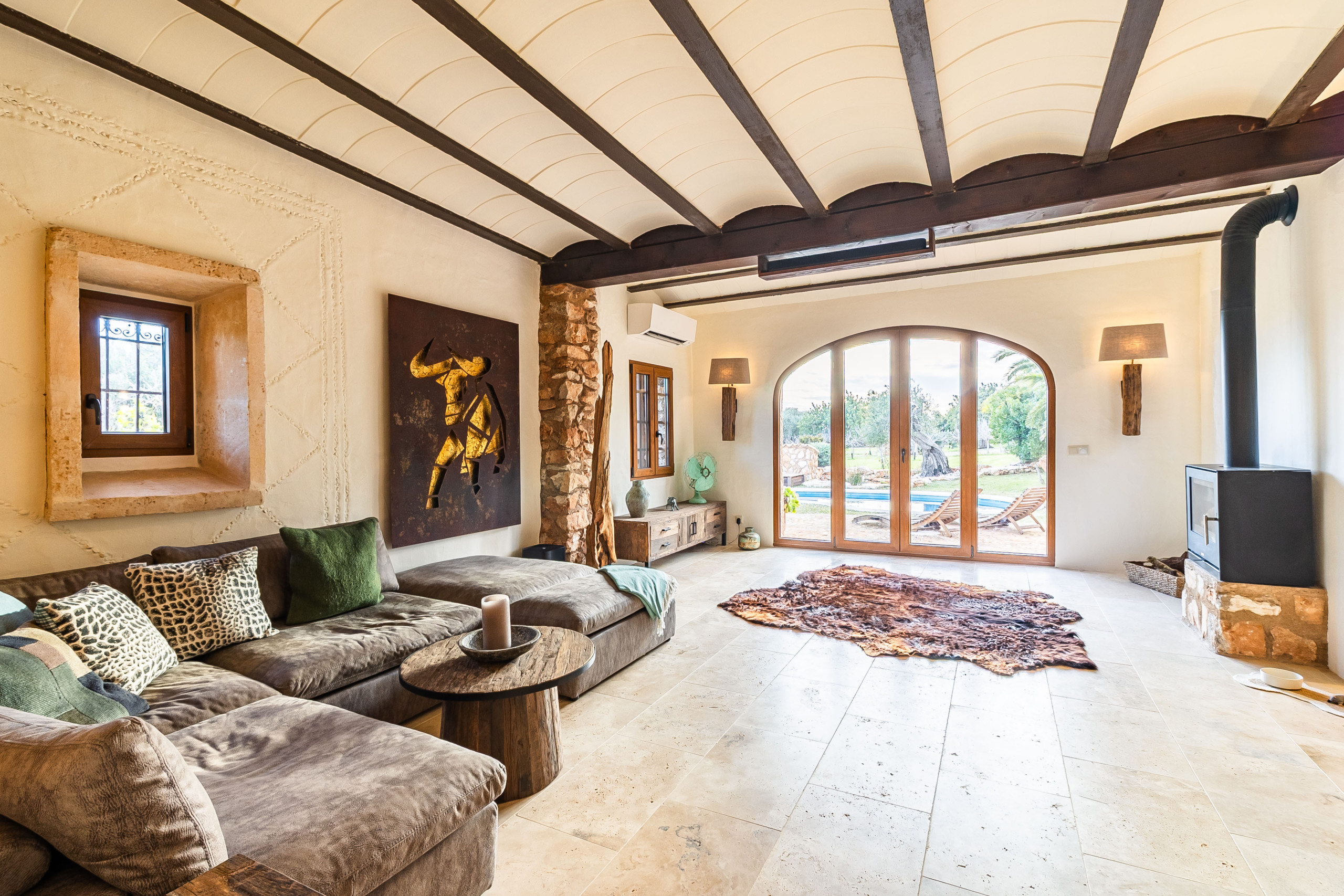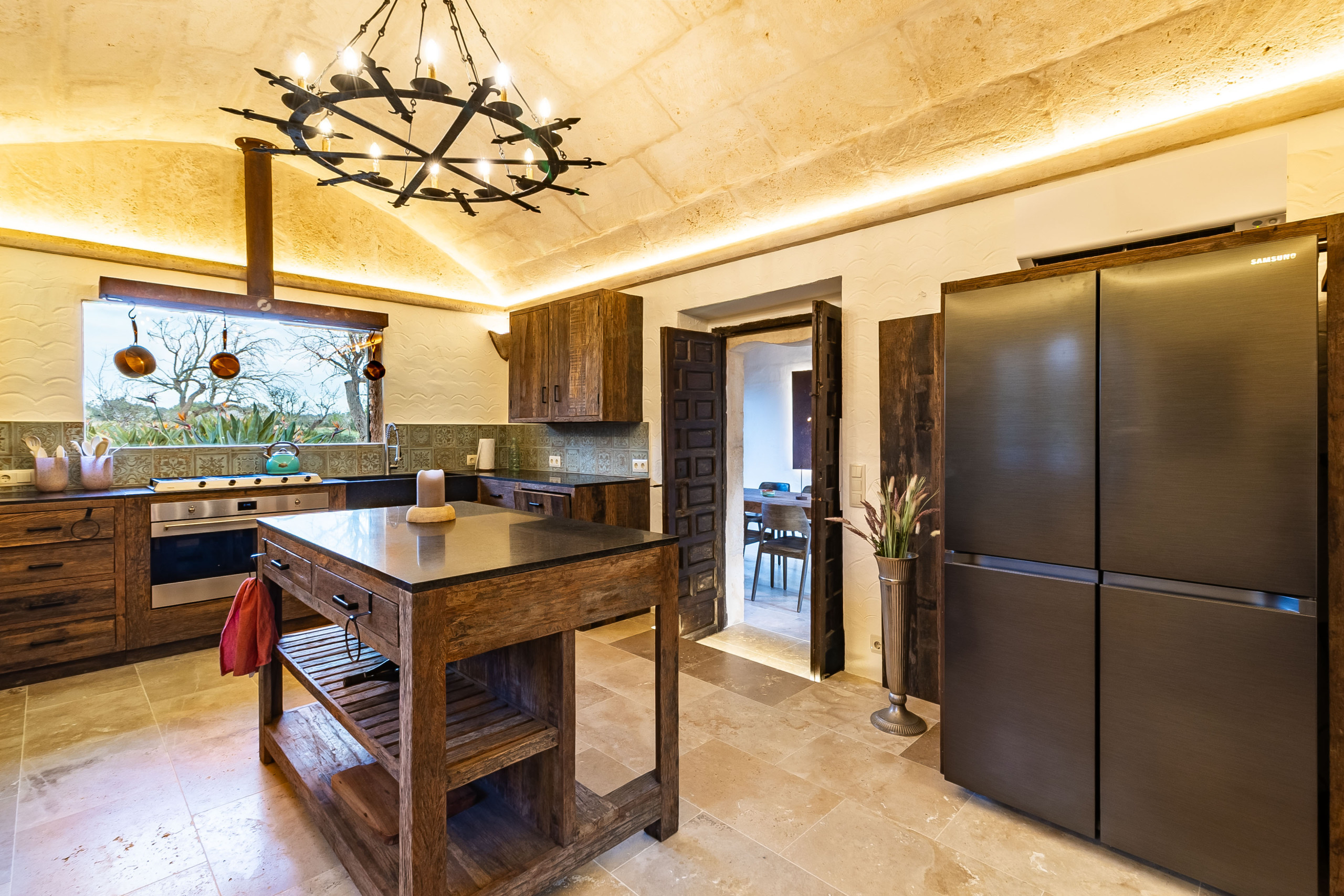 Das Herzstück der Finca ist der gemütlich eingerichtete Wohnbereich mit Heizkamin, der eine warme und einladende Atmosphäre schafft. Große Fenster eröffnen einen schönen Blick in den Garten und auf den Pool und verbinden den Innen- und Außenbereich auf harmonische Weise. Der angrenzende Essbereich lädt zu geselligen Abenden ein, während die separate Küche mit ihrem charmanten Design und ihrer funktionalen Ausstattung ideal für genussvolle Stunden mit Familie und Freunden ist.