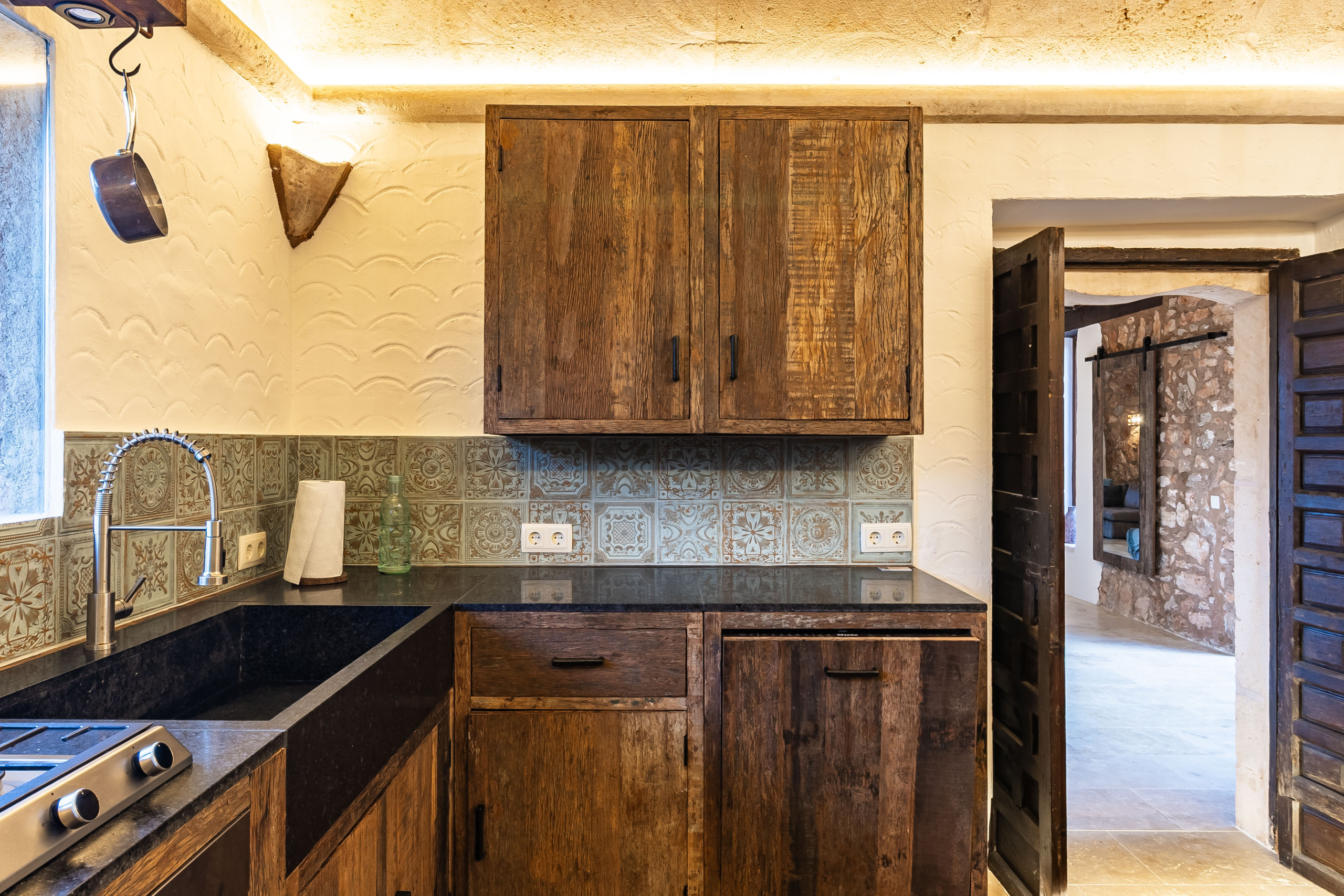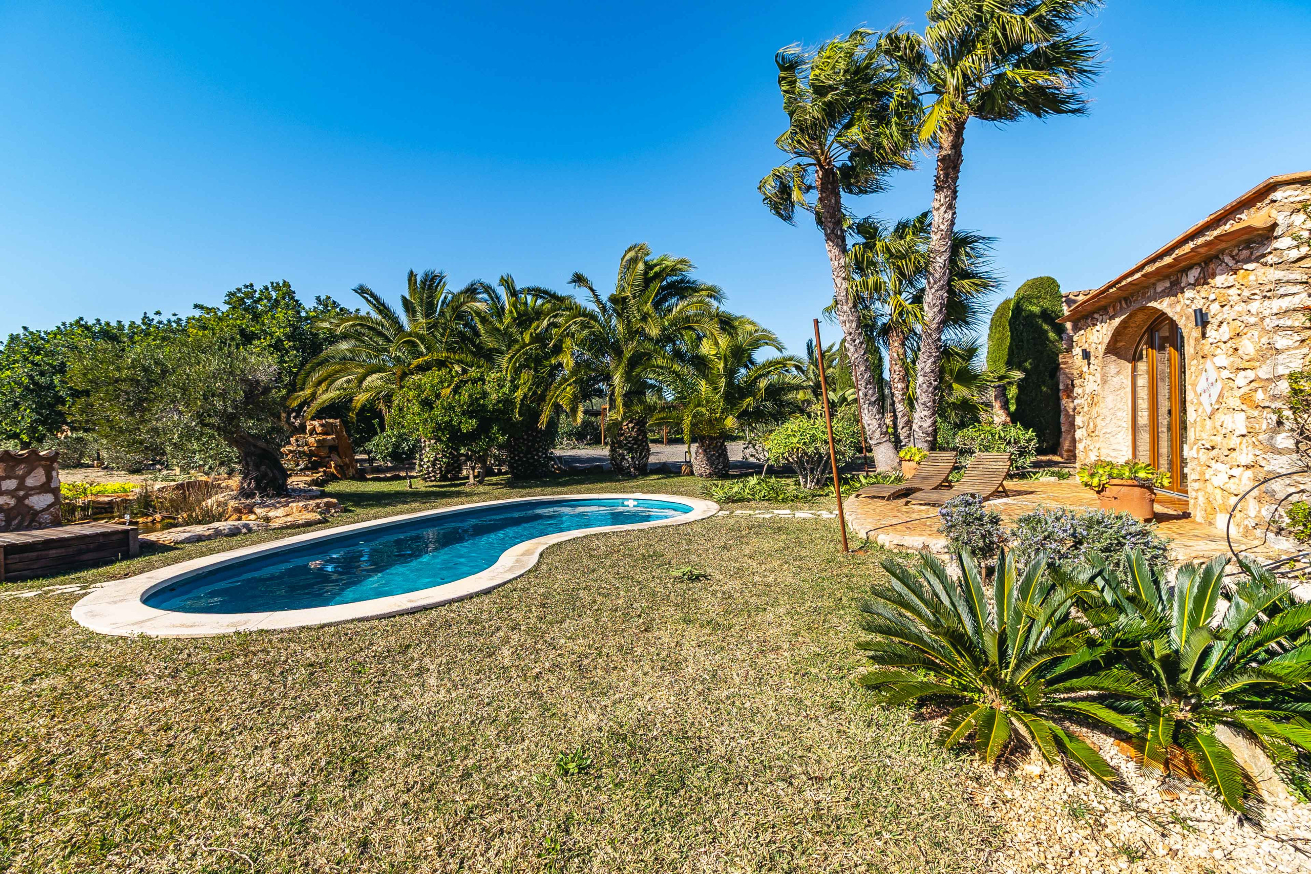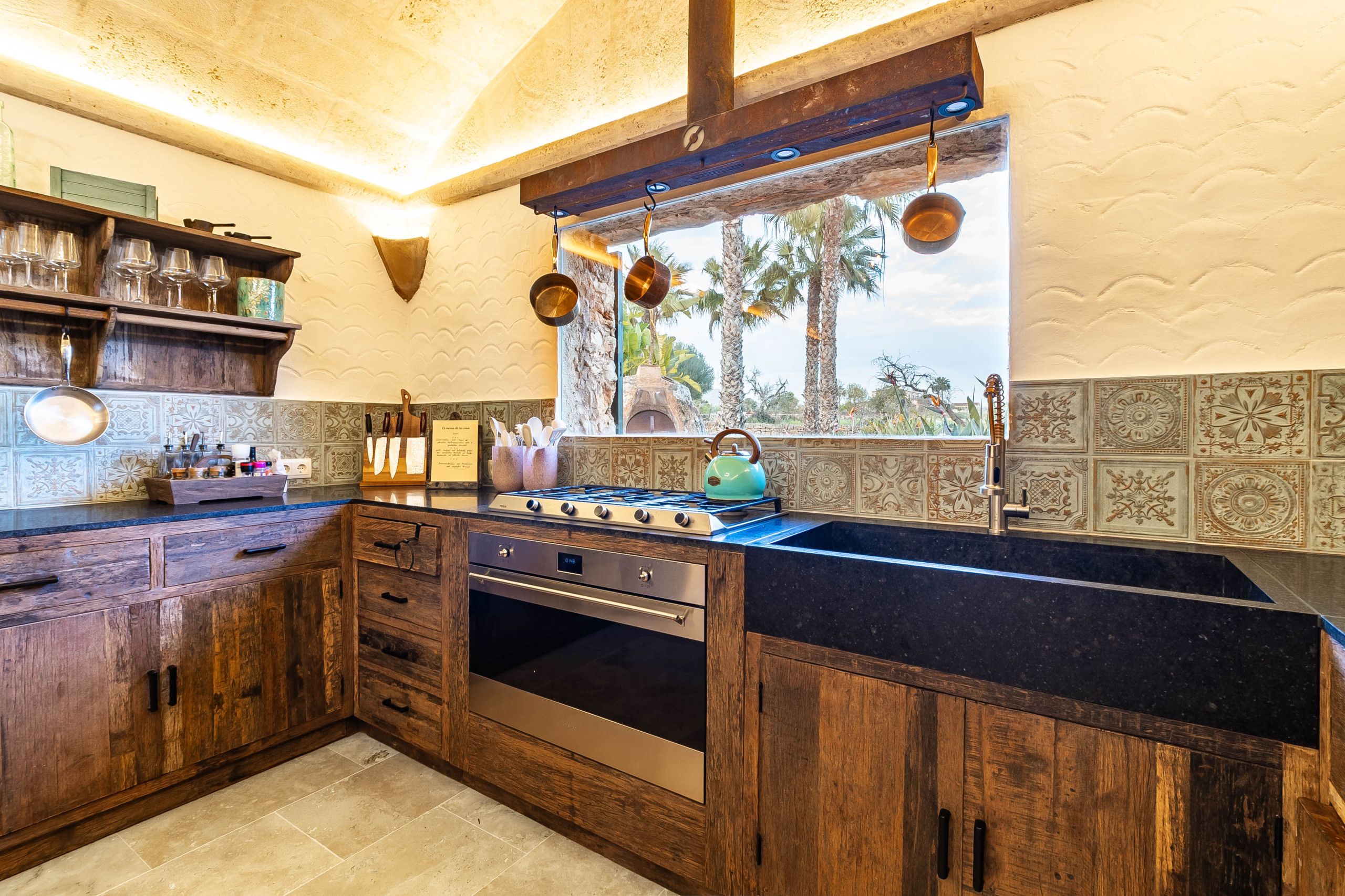 Das Herzstück der Finca ist der gemütlich eingerichtete Wohnbereich mit Heizkamin, der eine warme und einladende Atmosphäre schafft. Große Fenster eröffnen einen schönen Blick in den Garten und auf den Pool und verbinden den Innen- und Außenbereich auf harmonische Weise. Der angrenzende Essbereich lädt zu geselligen Abenden ein, während die separate Küche mit ihrem charmanten Design und ihrer funktionalen Ausstattung ideal für genussvolle Stunden mit Familie und Freunden ist.
