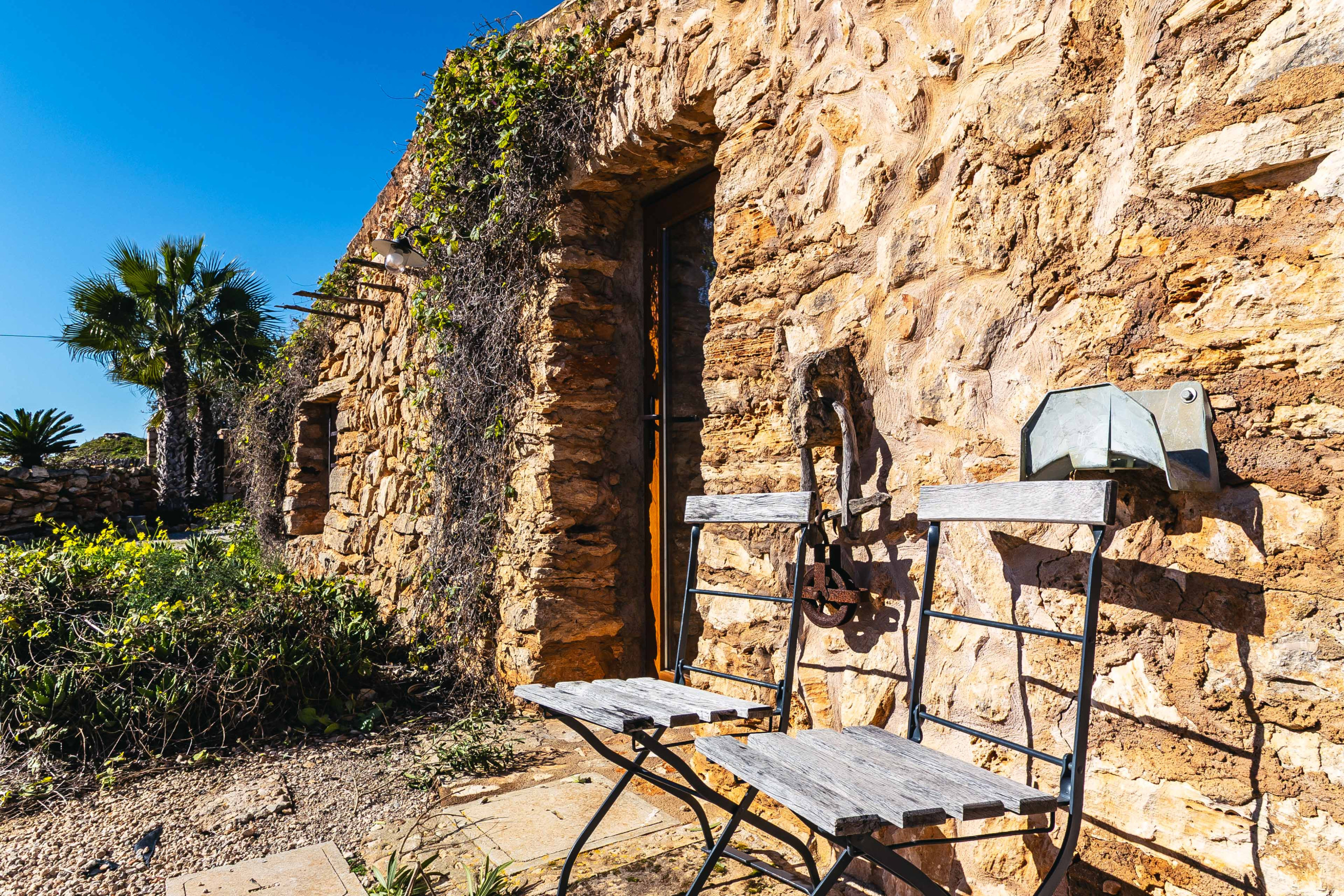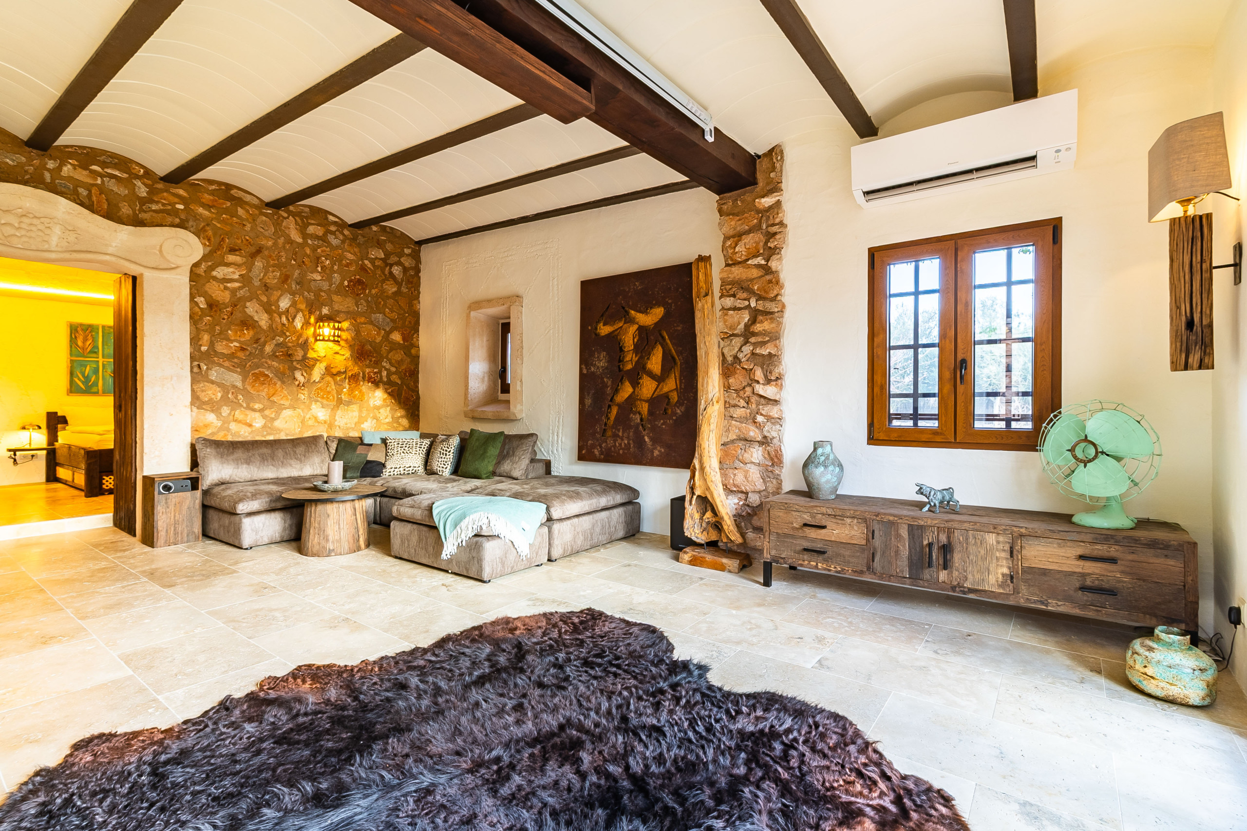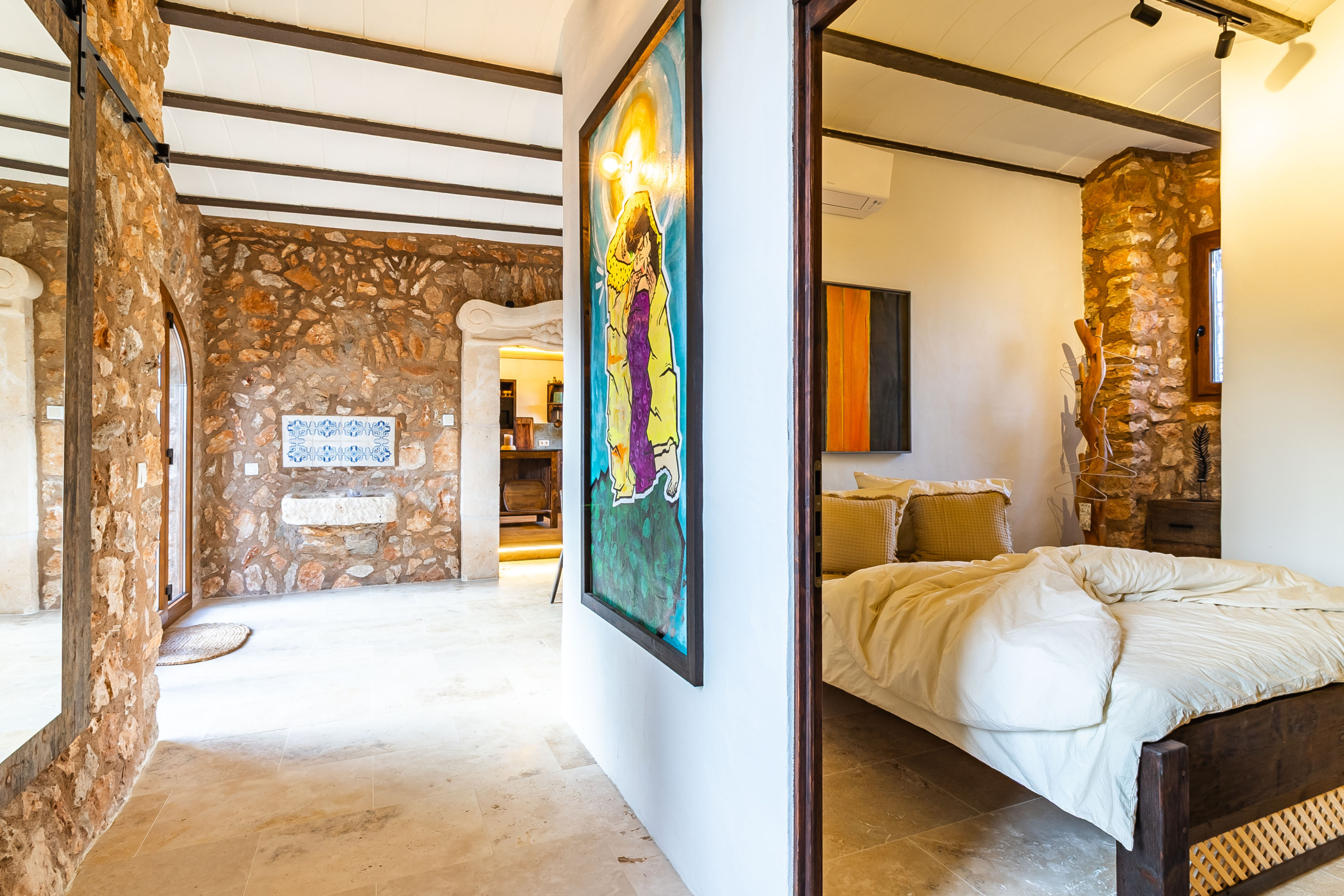 Auf ca. 175 m² Wohnfläche erwarten Sie außerdem zwei komfortable Schlafzimmer mit Doppelbett und jeweils eigenem Bad en suite. Das Hauptschlafzimmer verfügt über ein großzügiges Badezimmer mit Dusche und Badewanne, während das zweite Badezimmer mit Dusche und WC ausgestattet ist. Naturstein-Elemente, Gewölbedecken und warme Materialien verleihen der Finca ihren unverwechselbaren mediterranen Charakter. Ein Hauswirtschaftsraum sorgt zusätzlich für praktischen Komfort im Alltag.