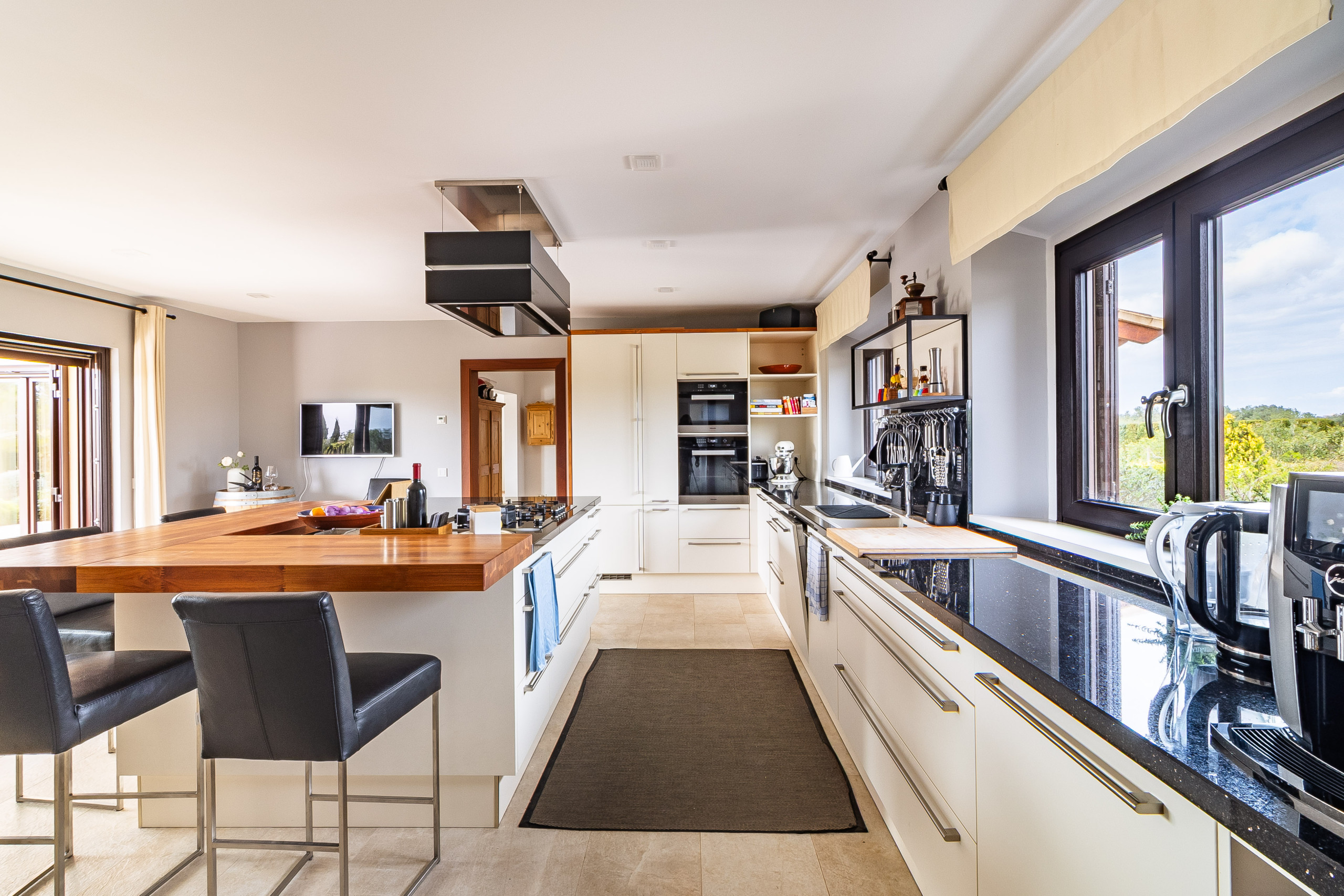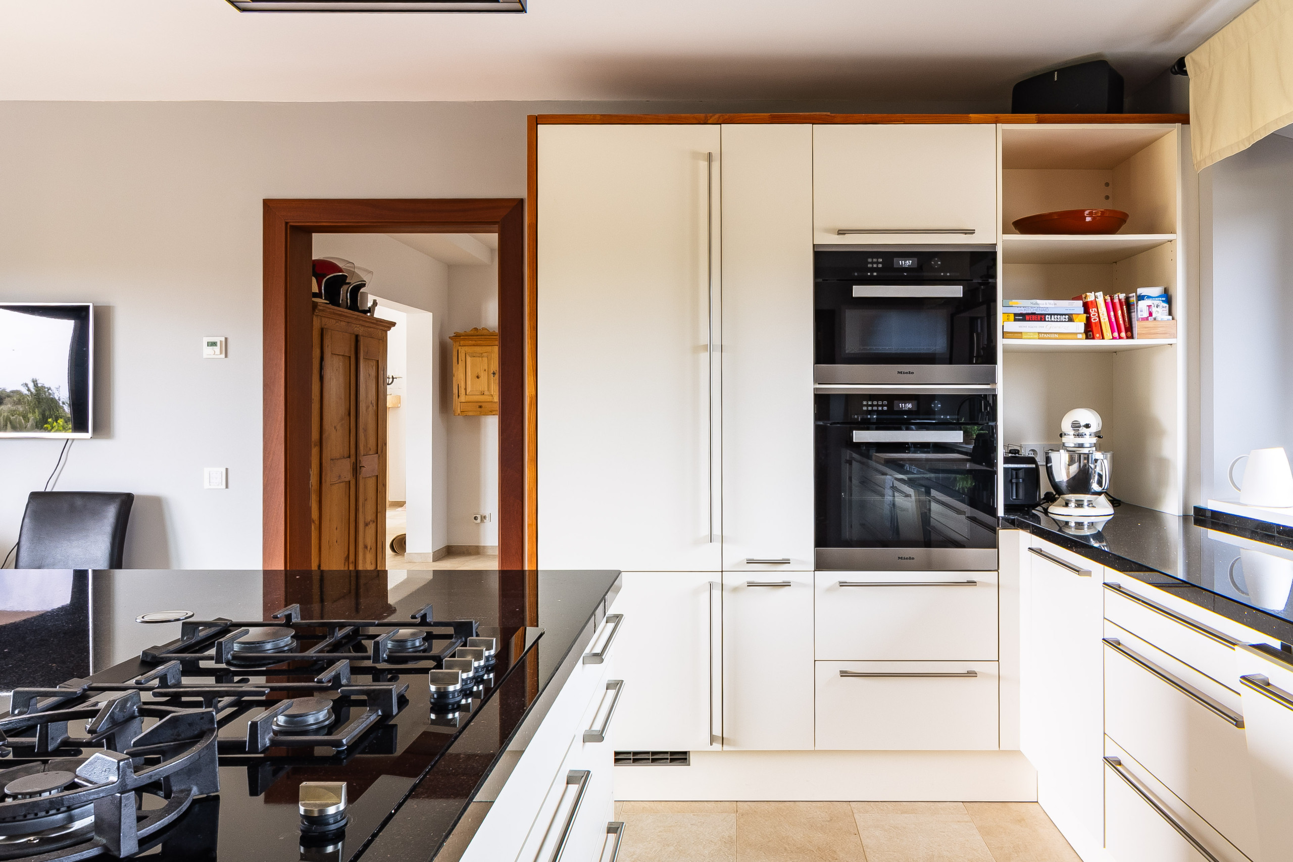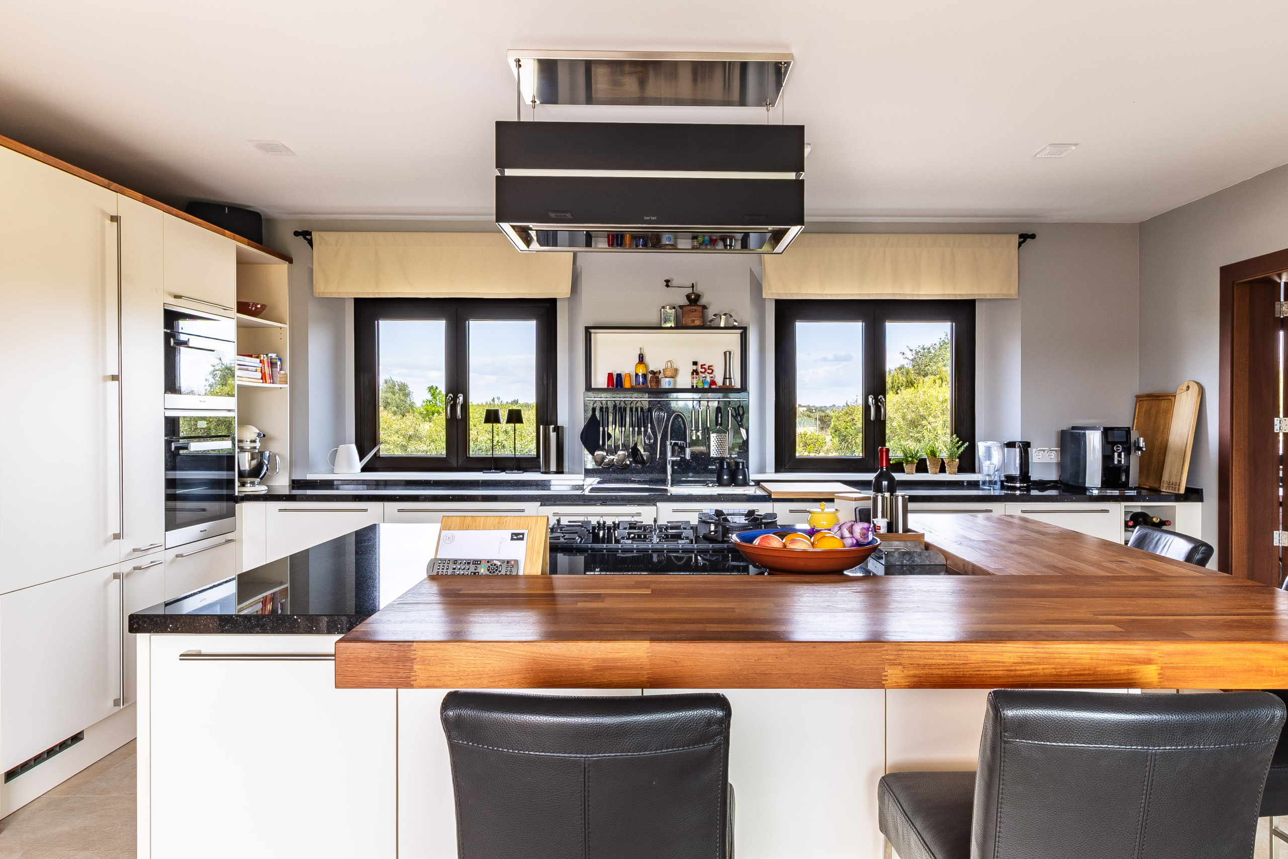 Bereits beim Betreten des Hauses entsteht ein Gefühl von Weite und Ankommen. Der offene Eingangsbereich mit Galerie schafft eine einladende Atmosphäre und führt direkt in den großzügigen Wohn- und Essbereich mit Kamin, der das Herzstück der Finca bildet. Große Fensterflächen sorgen für viel Tageslicht und schaffen eine harmonische Verbindung zwischen Innen- und Außenbereich. Die angrenzende, voll ausgestattete Küche mit großem Gasherd bietet viel Raum für gemeinsames Kochen und wird durch eine separate Speisekammer beziehungsweise einen Hauswirtschaftsraum ergänzt. Auf dieser Ebene befindet sich zudem ein Schlafzimmer mit eigenem Badezimmer en suite, ideal für Gäste oder als unabhängiger Rückzugsort. Ein zusätzliches Gäste-WC rundet das Raumangebot im Erdgeschoss ab.