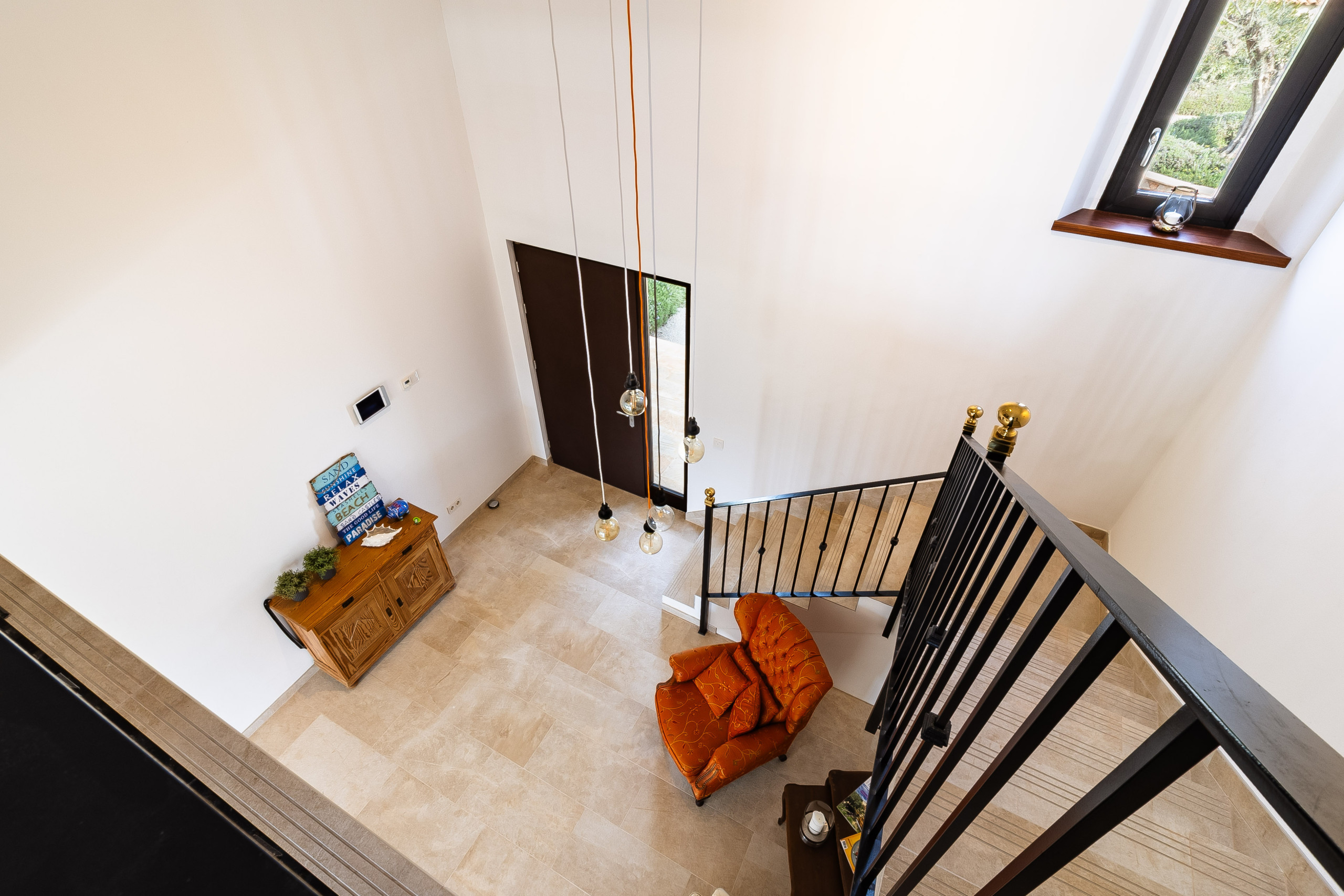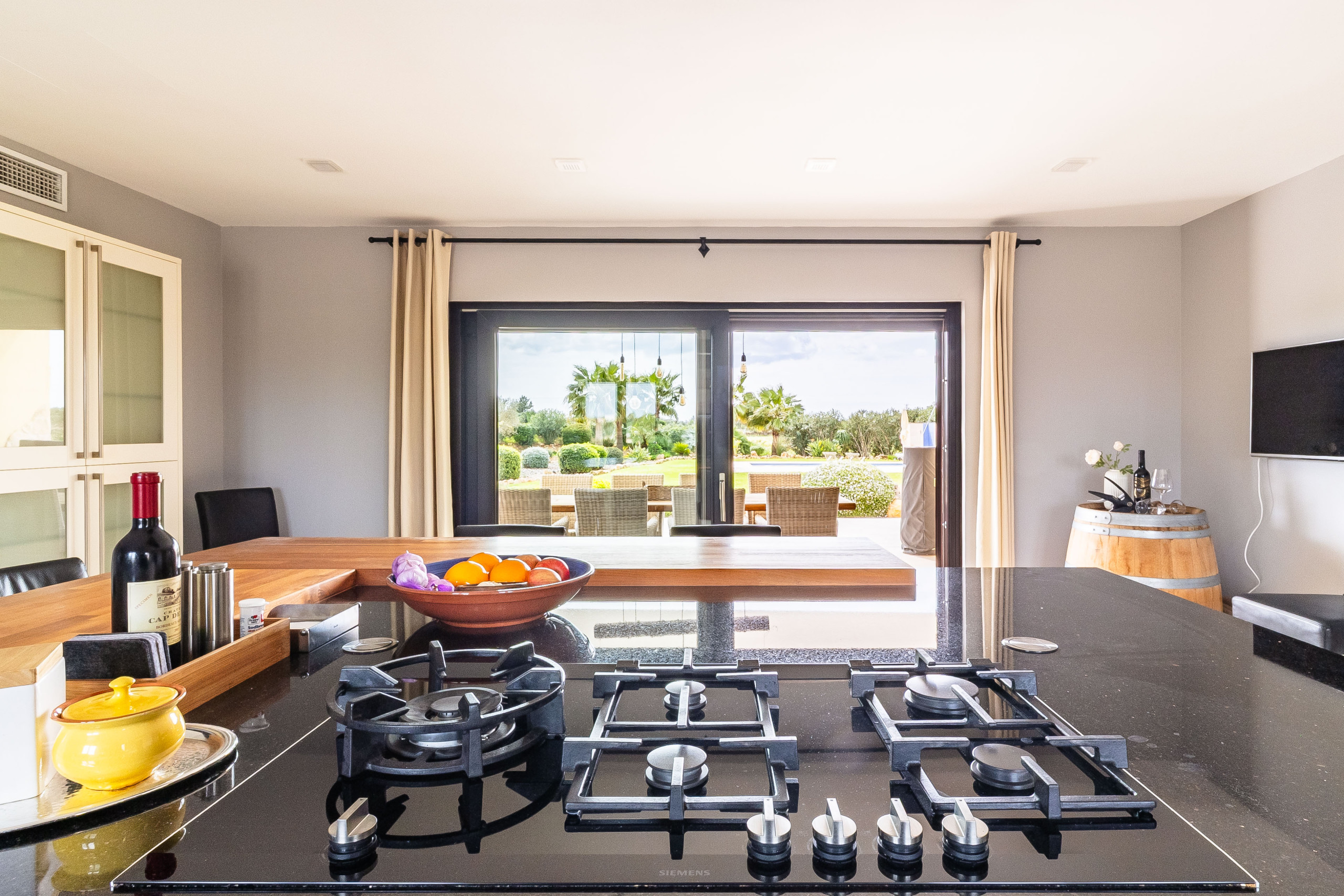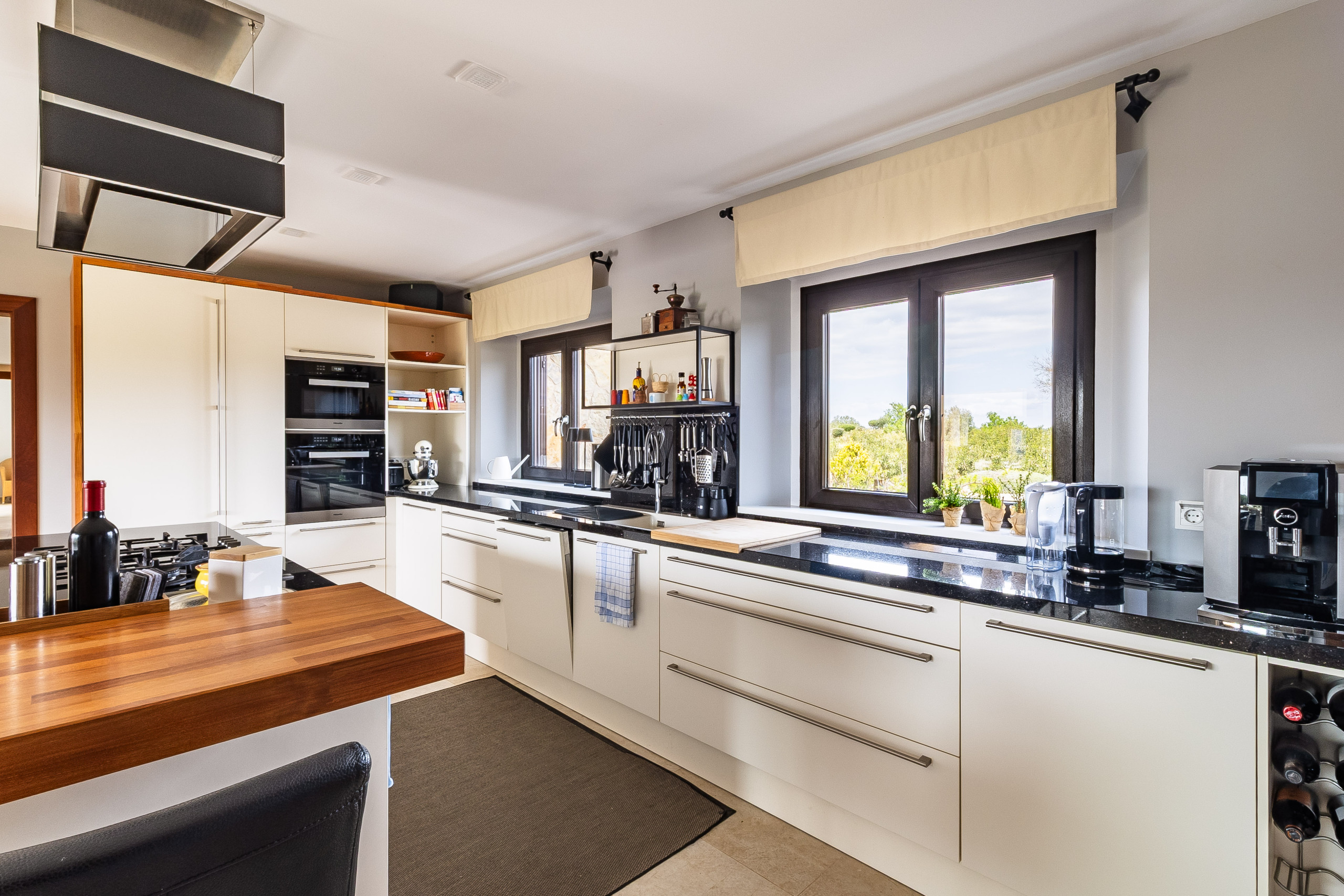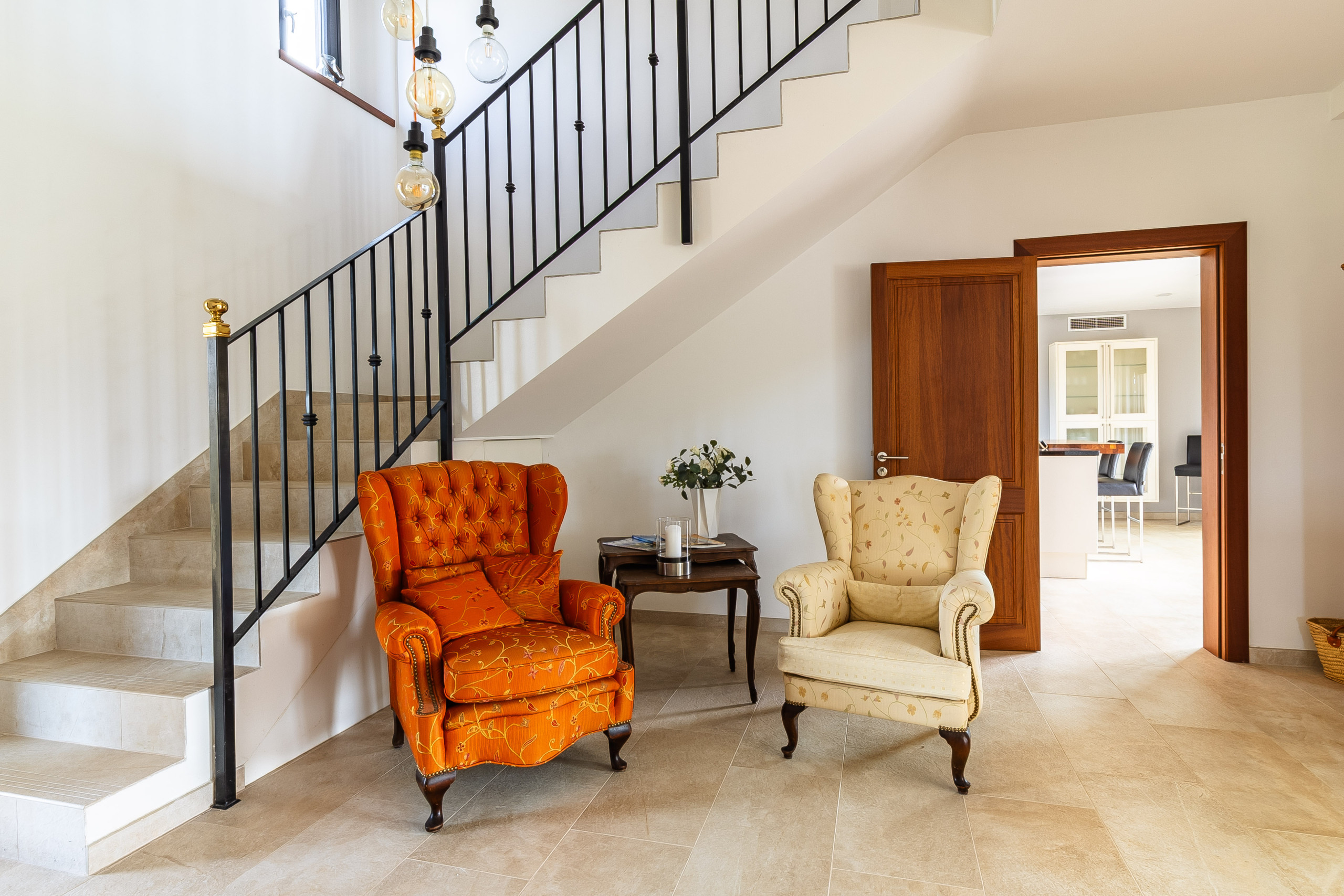 Bereits beim Betreten des Hauses entsteht ein Gefühl von Weite und Ankommen. Der offene Eingangsbereich mit Galerie schafft eine einladende Atmosphäre und führt direkt in den großzügigen Wohn- und Essbereich mit Kamin, der das Herzstück der Finca bildet. Große Fensterflächen sorgen für viel Tageslicht und schaffen eine harmonische Verbindung zwischen Innen- und Außenbereich. Die angrenzende, voll ausgestattete Küche mit großem Gasherd bietet viel Raum für gemeinsames Kochen und wird durch eine separate Speisekammer beziehungsweise einen Hauswirtschaftsraum ergänzt. Auf dieser Ebene befindet sich zudem ein Schlafzimmer mit eigenem Badezimmer en suite, ideal für Gäste oder als unabhängiger Rückzugsort. Ein zusätzliches Gäste-WC rundet das Raumangebot im Erdgeschoss ab.