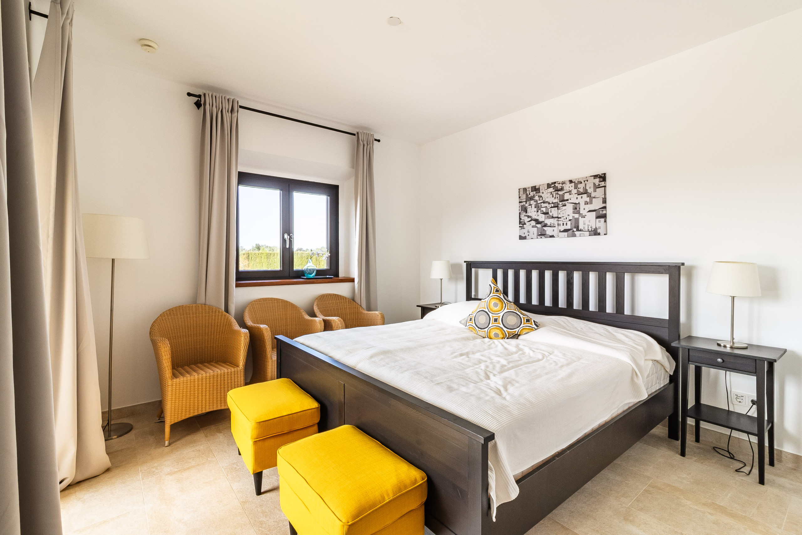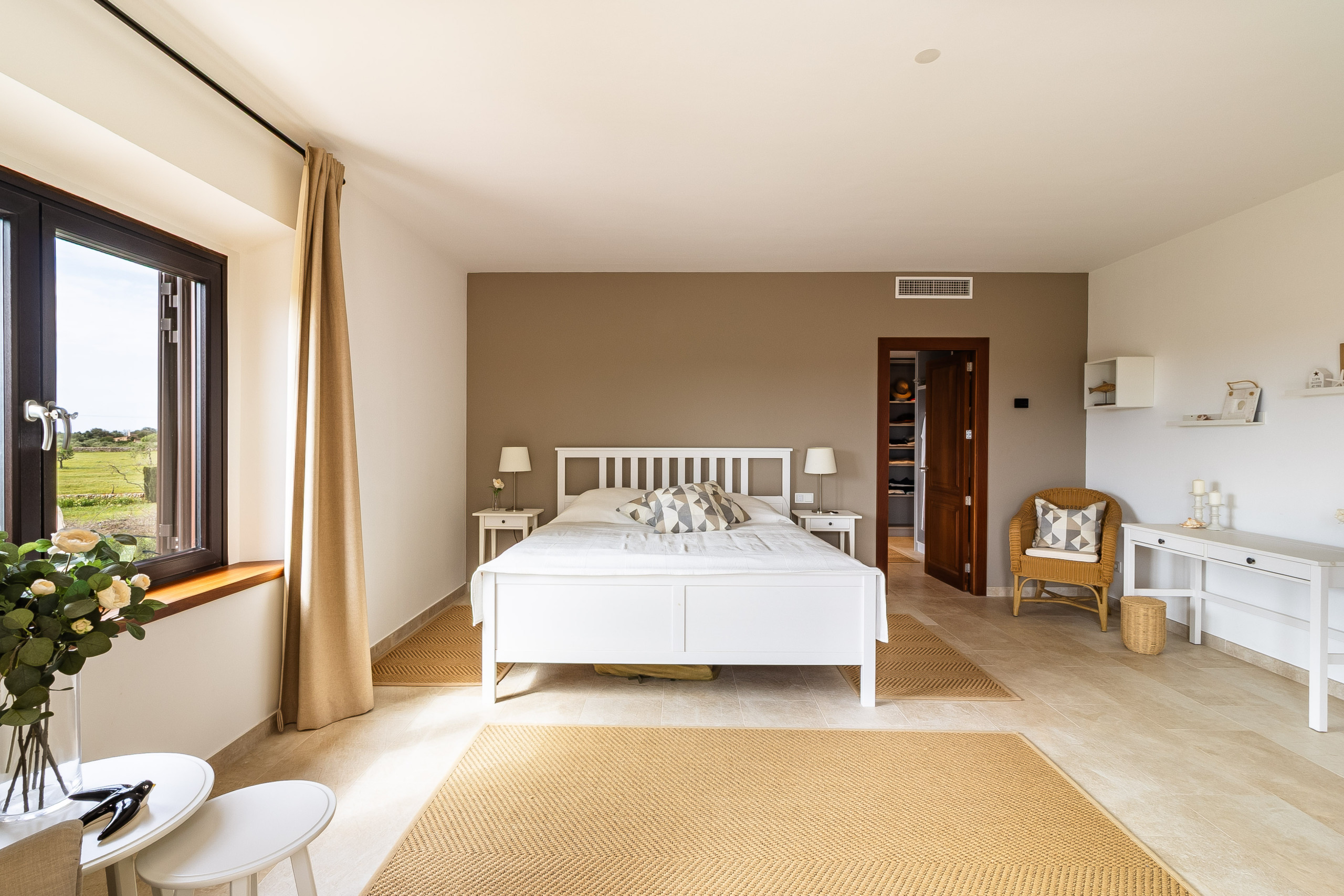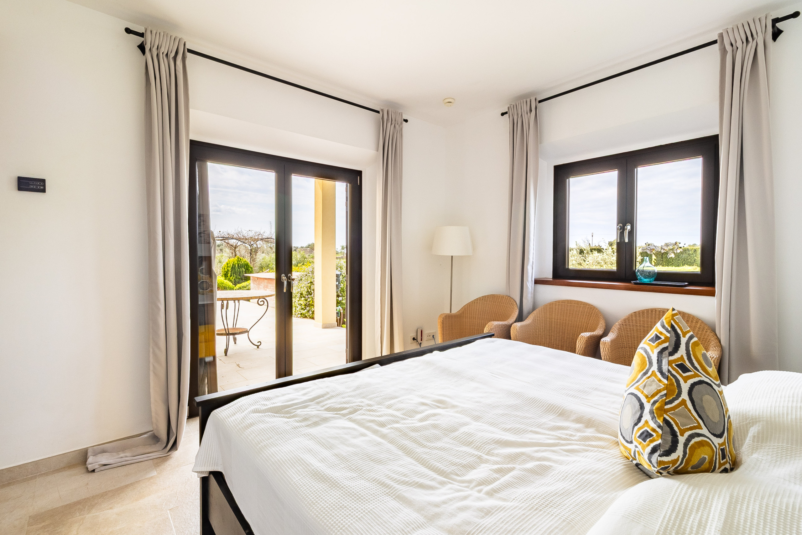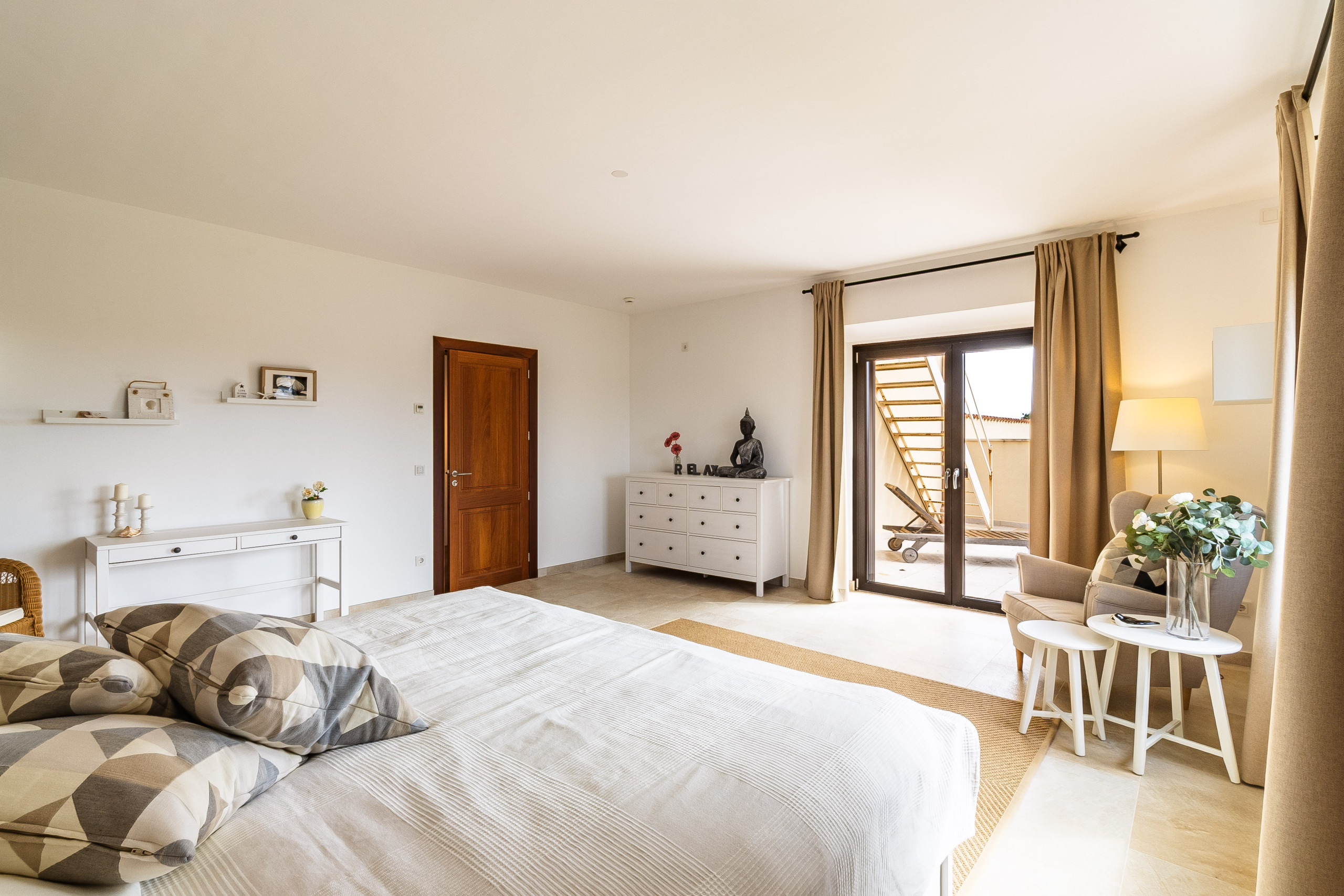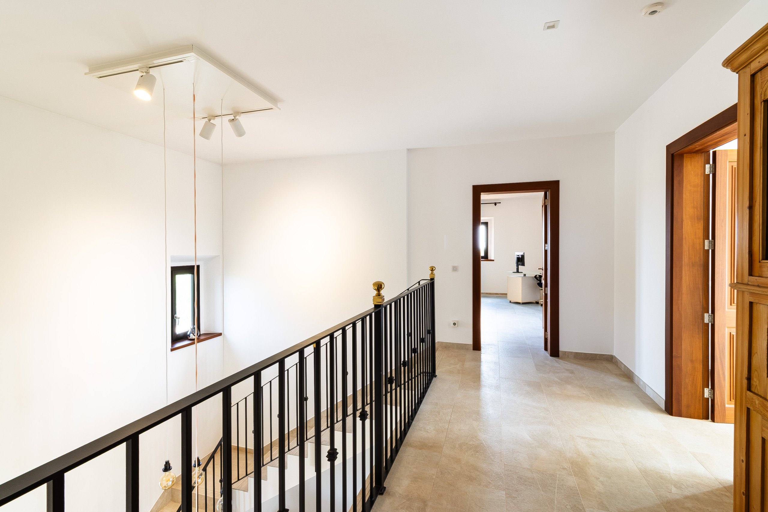 Im Obergeschoss entfaltet sich die private Rückzugsebene der Finca. Der Masterbereich beeindruckt durch seine außergewöhnige Größe und Großzügigkeit und bietet vielseitige Gestaltungsmöglichkeiten, die weit über ein klassisches Schlafzimmer hinausgehen. Ergänzt wird dieser durch ein Ankleidezimmer sowie ein großzügiges Badezimmer mit Badewanne. Ein weiteres Schlafzimmer auf dieser Etage verfügt ebenfalls über ein eigenes Badezimmer en suite. Zusätzlich befindet sich hier ein Büro, das flexibel auch als weiteres Schlafzimmer genutzt werden kann. Alle Räume sind mit Einbauschränken ausgestattet und bieten Zugang zu Balkonen mit Blick in die umliegende Natur.