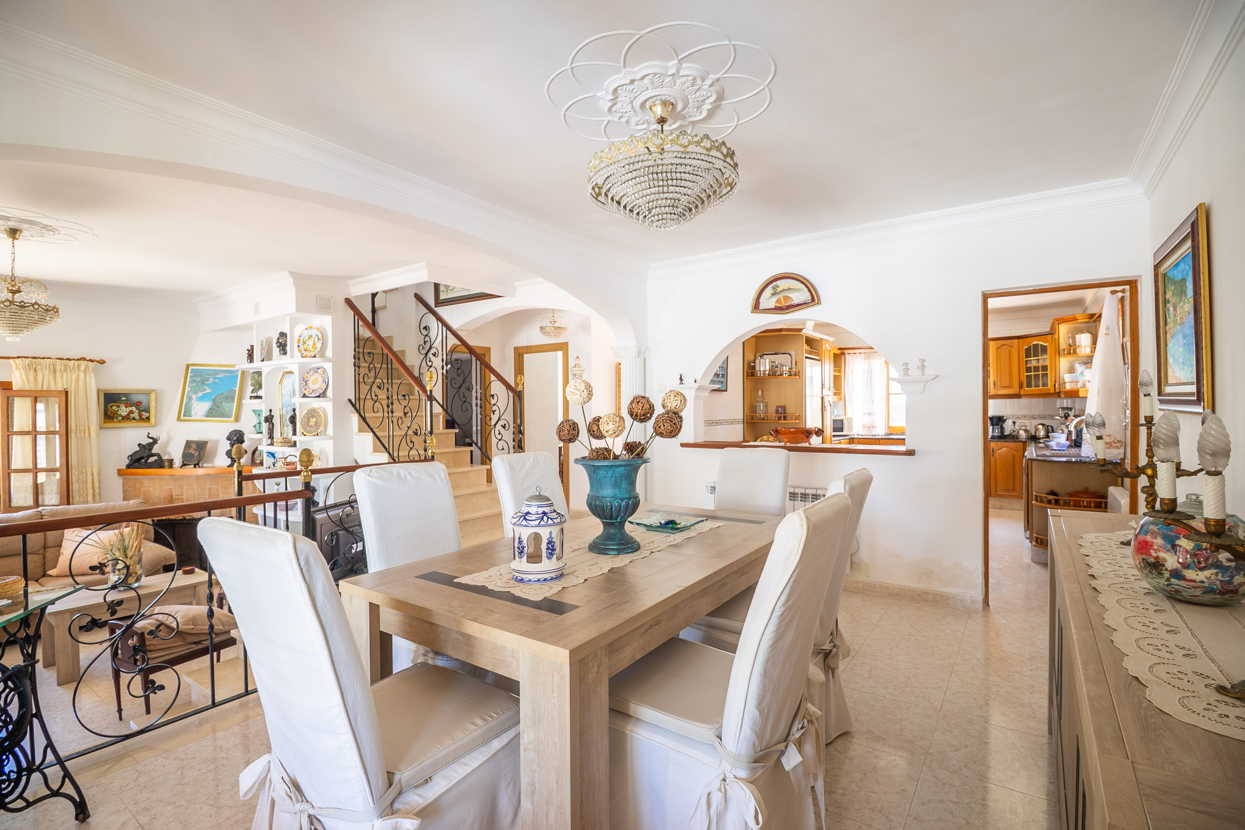 Im Erdgeschoss befindet sich ein großzügiger Wohn- und Essbereich mit direktem Zugang zur Terrasse sowie eine große, vollständig ausgestattete Küche mit zusätzlichem Essplatz. Zudem gibt es ein Badezimmer mit Dusche und einen kleineren Raum, der sich gut als Arbeitszimmer, Lesebereich oder privater Rückzugsort eignet. Die überdachte Terrasse erweitert den Wohnraum nach draußen und bietet zu jeder Tageszeit angenehme Sitzmöglichkeiten.