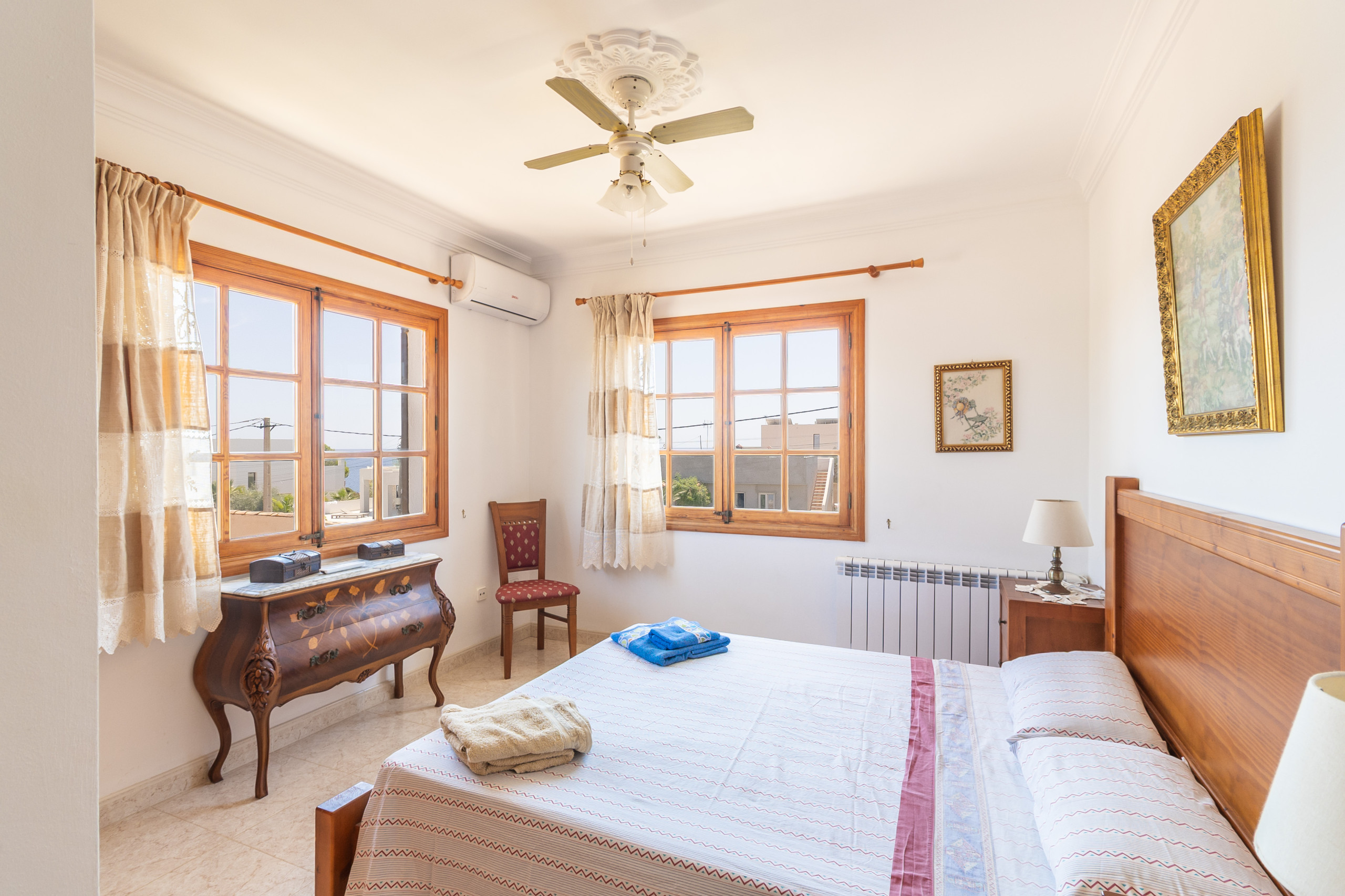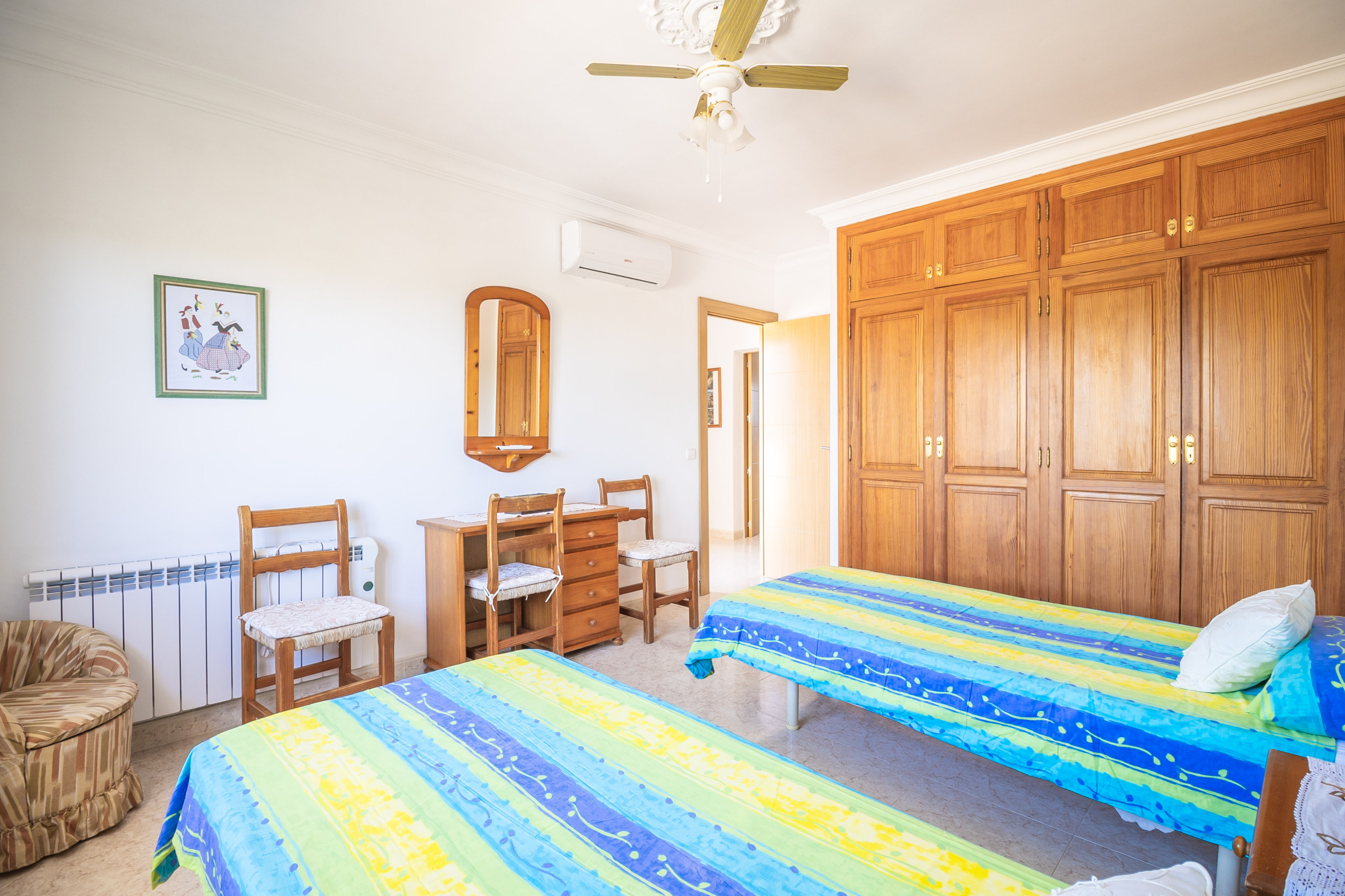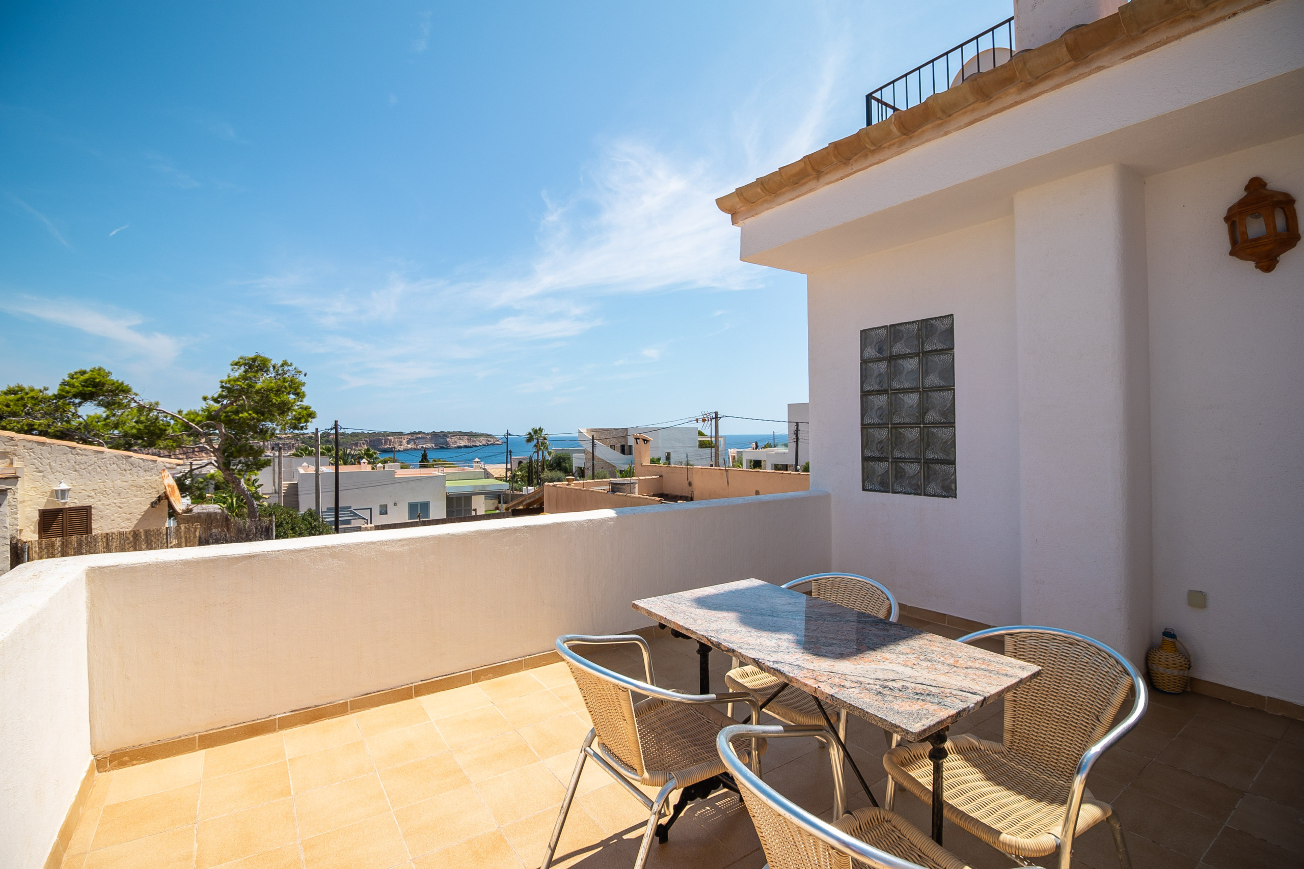 Im Obergeschoss stehen drei helle, klimatisierte Schlafzimmer zur Verfügung: zwei Zimmer mit Doppelbett sowie ein weiteres mit zwei Einzelbetten. Ein zweites Badezimmer mit Dusche befindet sich ebenfalls auf dieser Etage. Vom Balkon aus genießen Sie einen schönen Meerblick. Auch die Dachterrasse bietet einen weiten Ausblick über die Küste und lädt dazu ein, die Umgebung und das mediterrane Licht in Ruhe zu genießen.