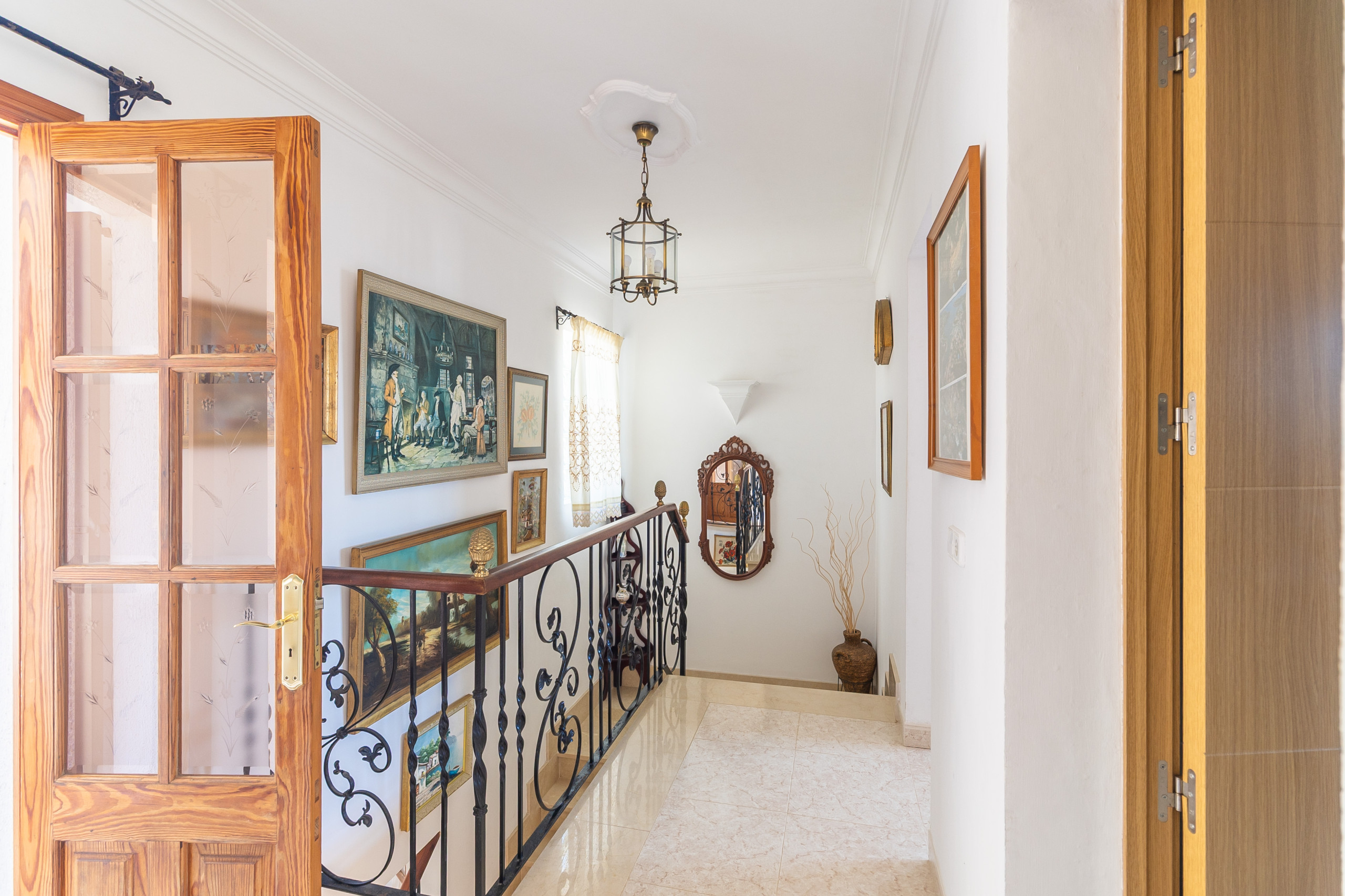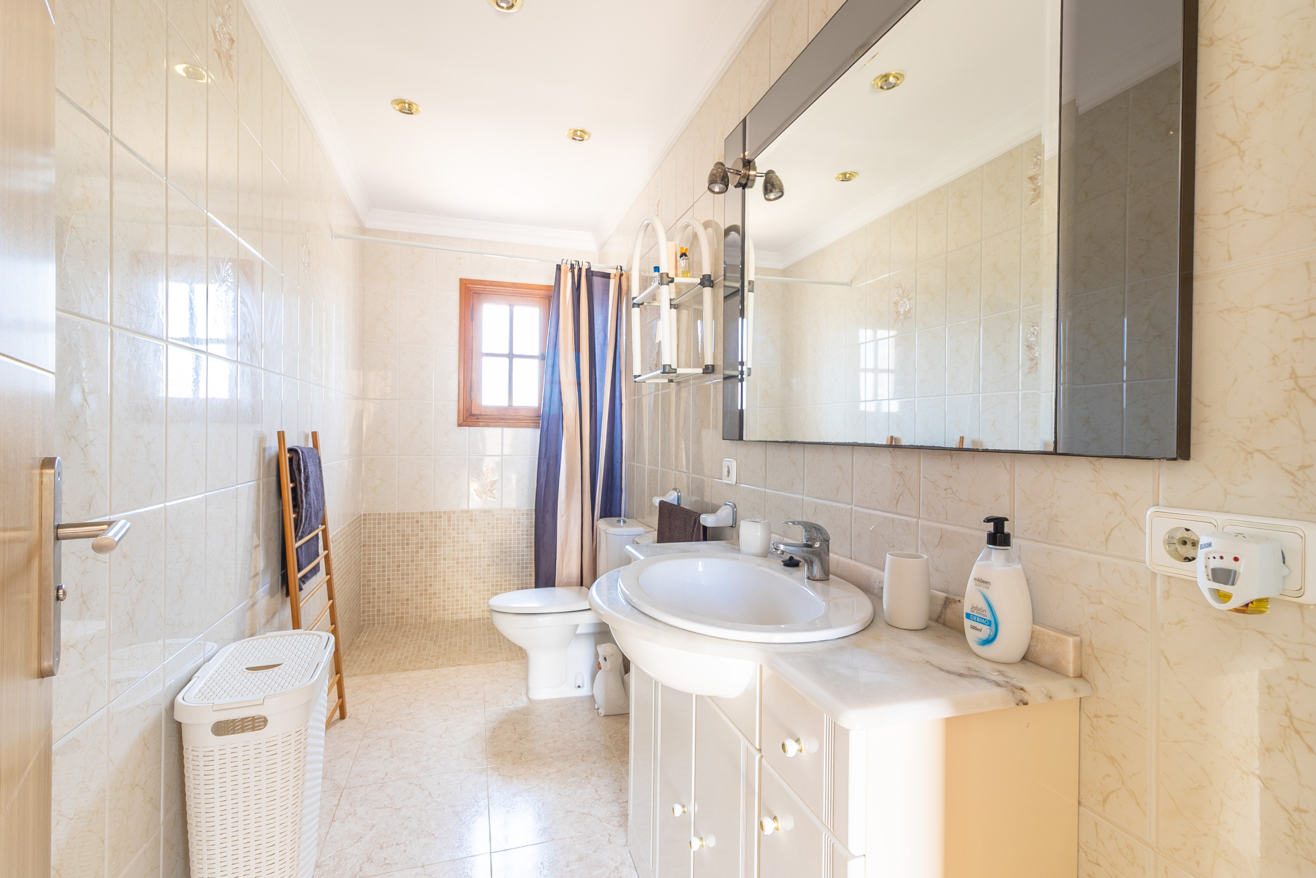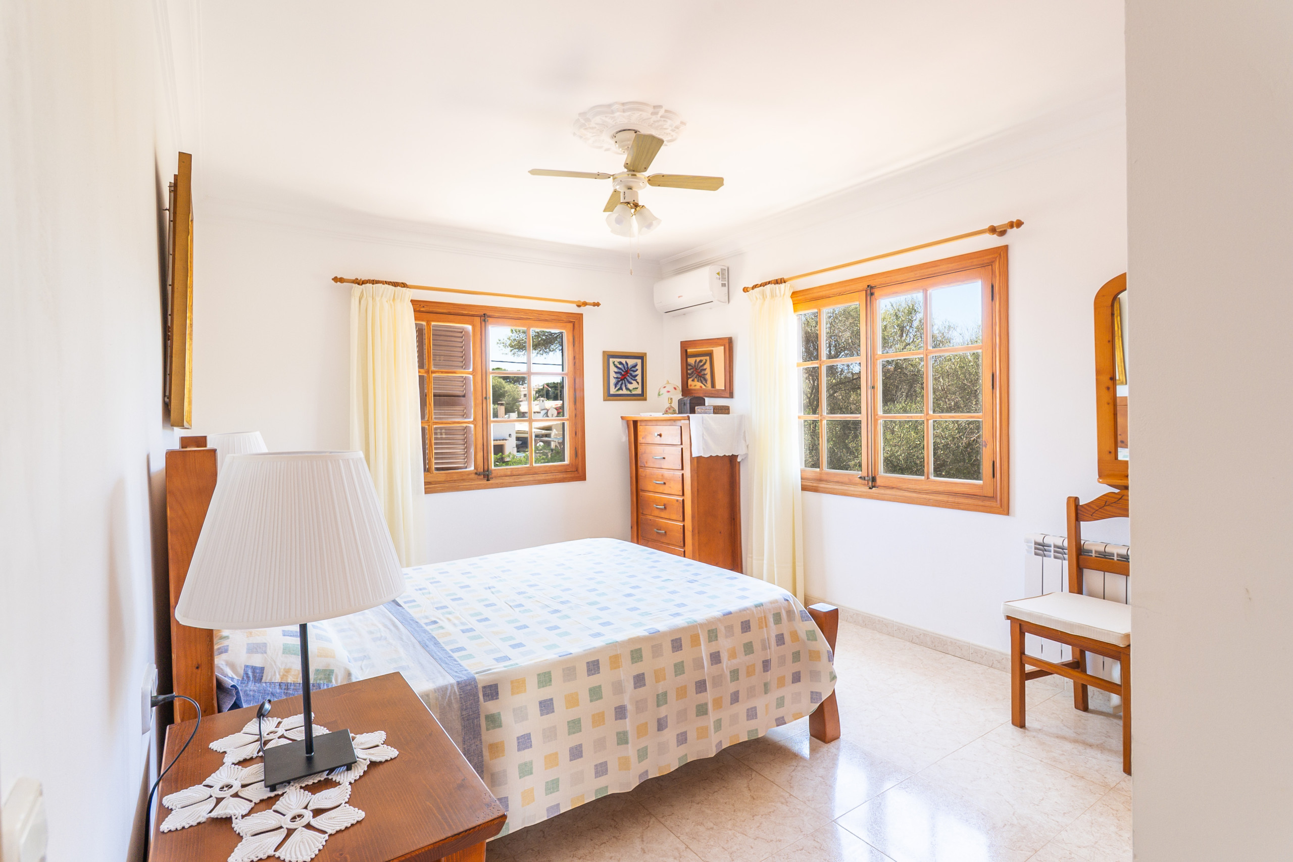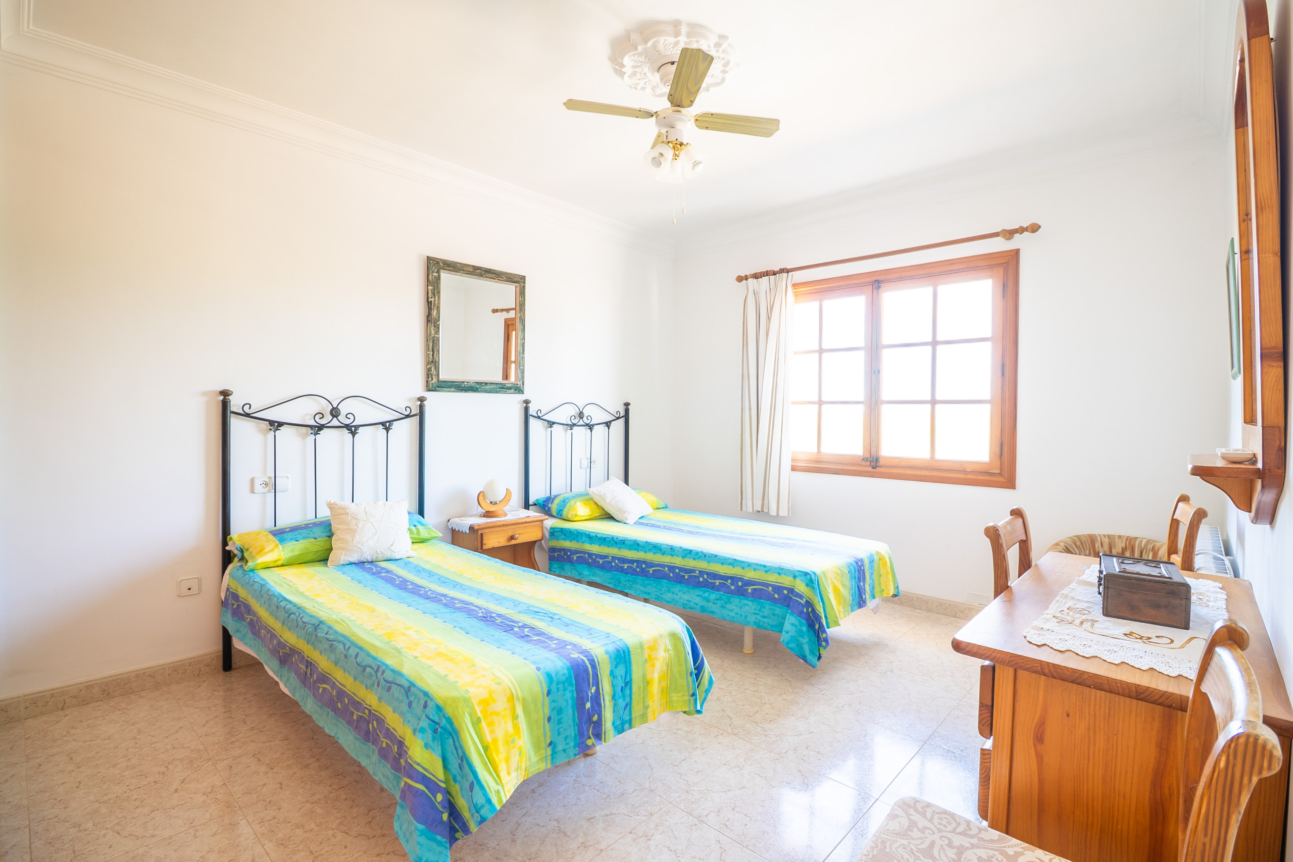 Im Obergeschoss stehen drei helle, klimatisierte Schlafzimmer zur Verfügung: zwei Zimmer mit Doppelbett sowie ein weiteres mit zwei Einzelbetten. Ein zweites Badezimmer mit Dusche befindet sich ebenfalls auf dieser Etage. Vom Balkon aus genießen Sie einen schönen Meerblick. Auch die Dachterrasse bietet einen weiten Ausblick über die Küste und lädt dazu ein, die Umgebung und das mediterrane Licht in Ruhe zu genießen.
