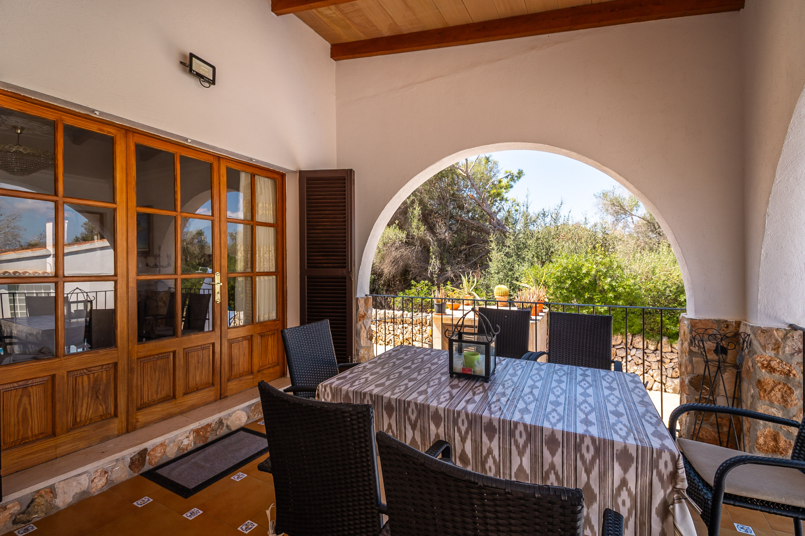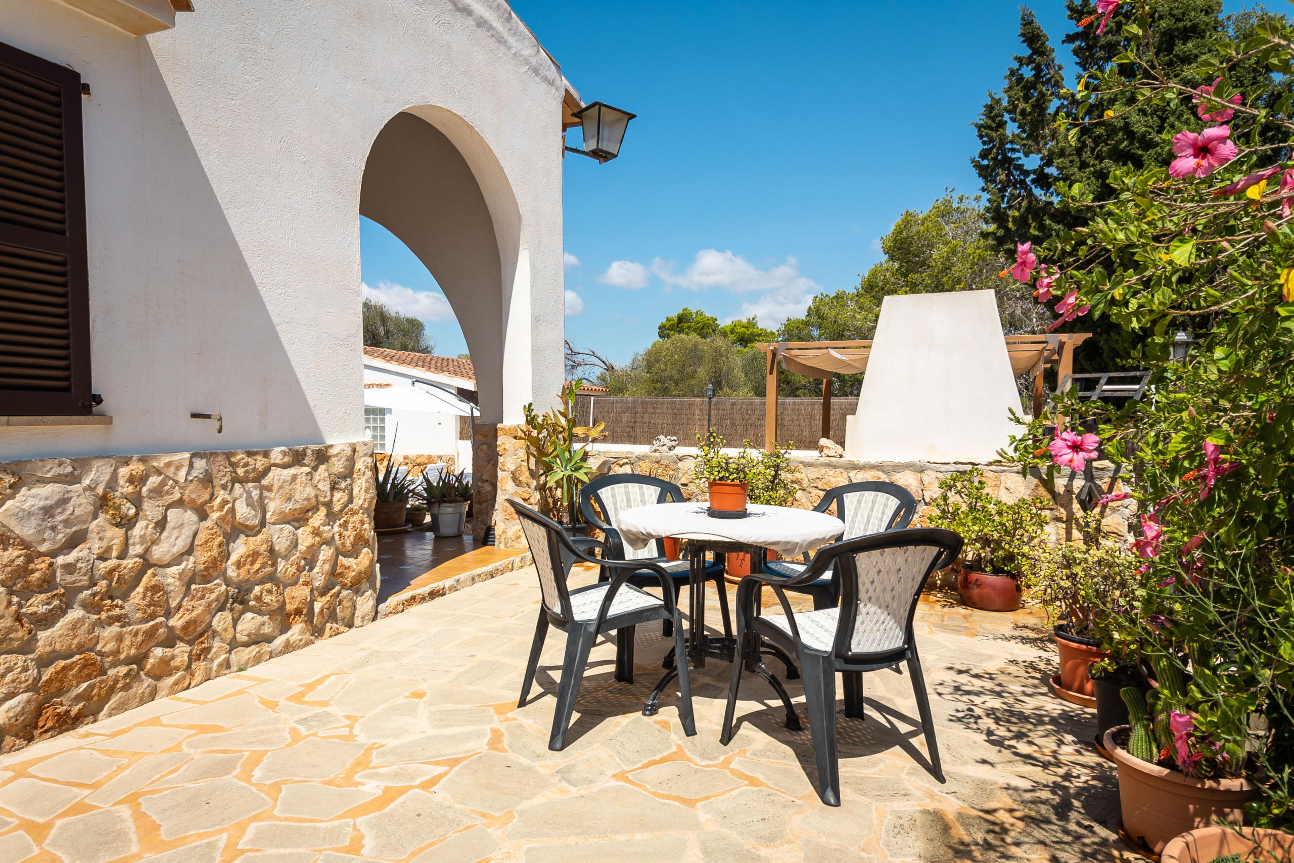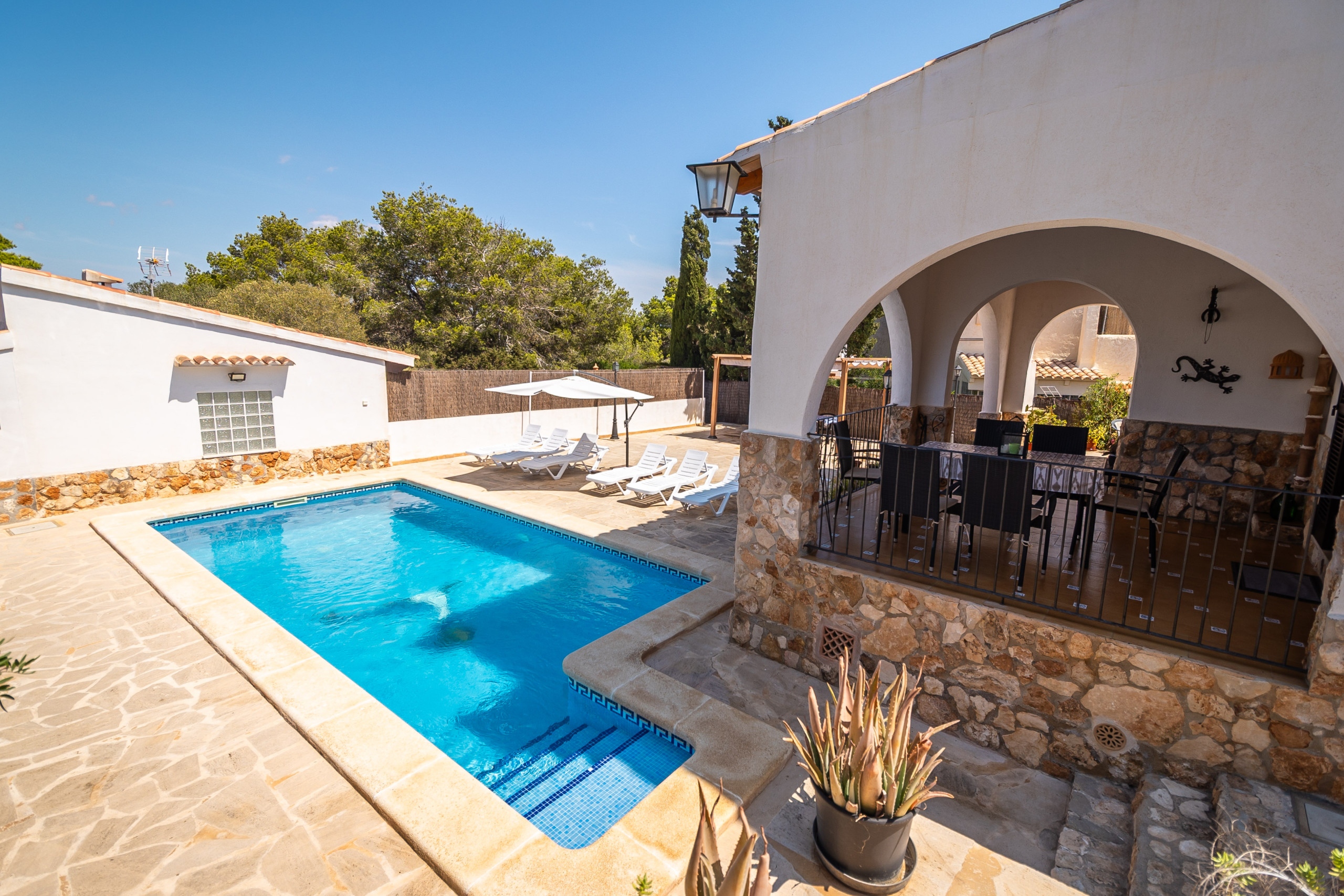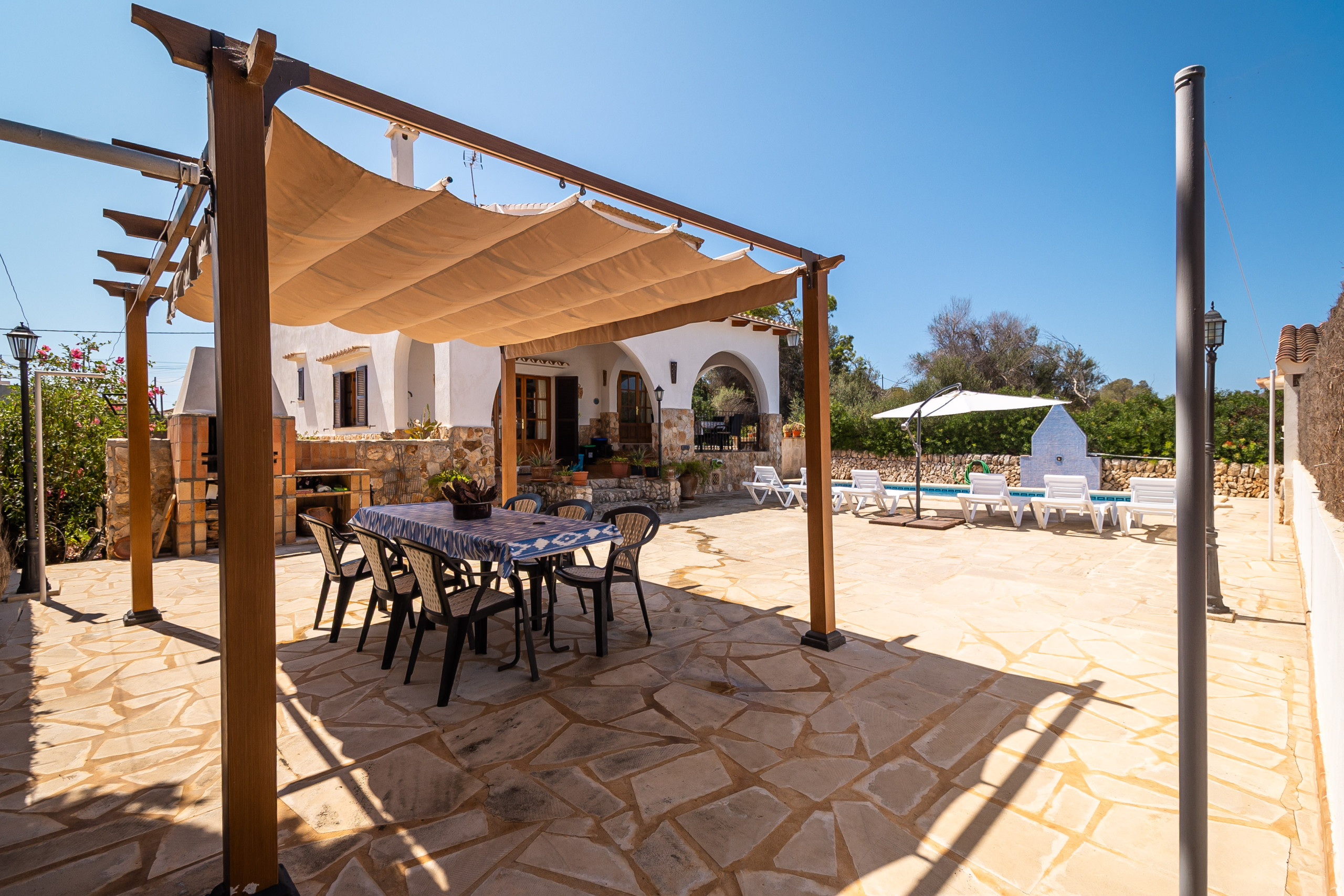 Der Außenbereich von Can Monxu bietet alles, was man für einen entspannten Aufenthalt im Süden Mallorcas benötigt: mehrere sonnige und schattige Terrassen, eine Pergola, einen gemauerten Grillplatz sowie einen privaten Pool (7 × 3,5 m) mit Außendusche. Die verschiedenen Bereiche laden dazu ein, das mediterrane Klima in vollen Zügen zu genießen. Anfang 2026 wird das Ferienhaus zudem mit neuen Klimaanlagen und modernen Isolierglasfenstern ausgestattet, um den Wohnkomfort weiter zu erhöhen.