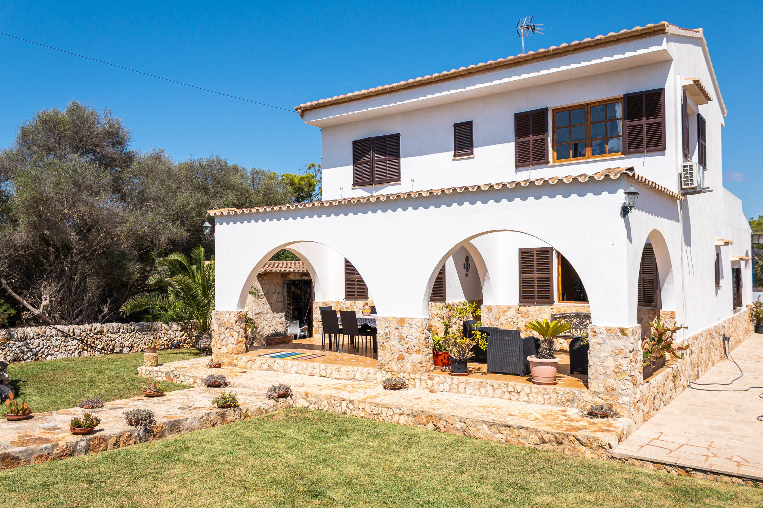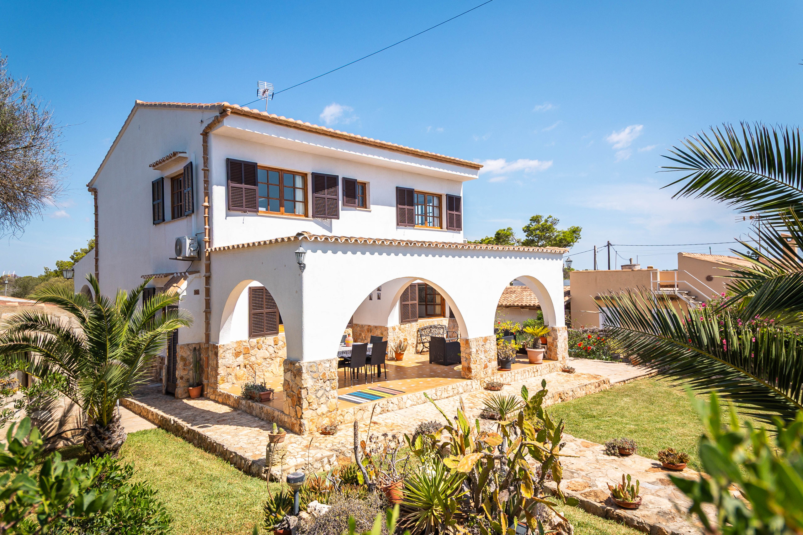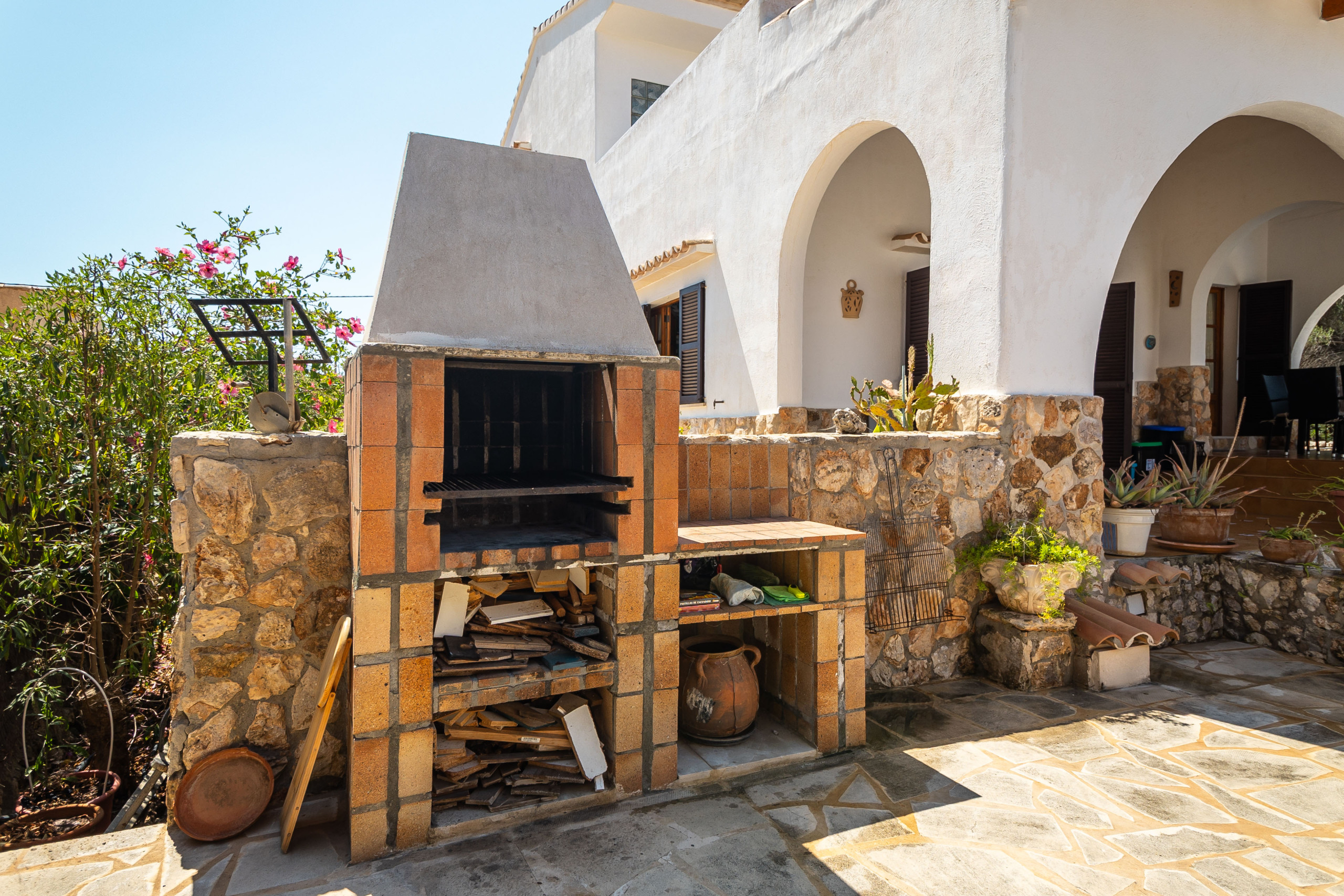 Der Außenbereich von Can Monxu bietet alles, was man für einen entspannten Aufenthalt im Süden Mallorcas benötigt: mehrere sonnige und schattige Terrassen, eine Pergola, einen gemauerten Grillplatz sowie einen privaten Pool (7 × 3,5 m) mit Außendusche. Die verschiedenen Bereiche laden dazu ein, das mediterrane Klima in vollen Zügen zu genießen. Anfang 2026 wird das Ferienhaus zudem mit neuen Klimaanlagen und modernen Isolierglasfenstern ausgestattet, um den Wohnkomfort weiter zu erhöhen.