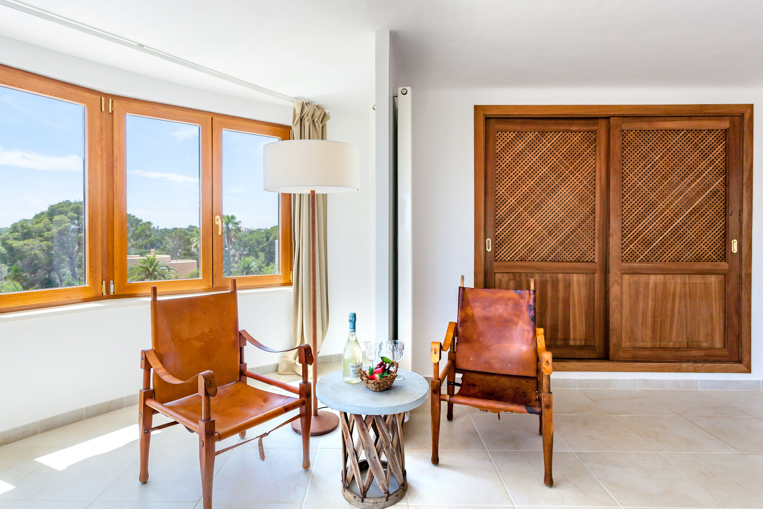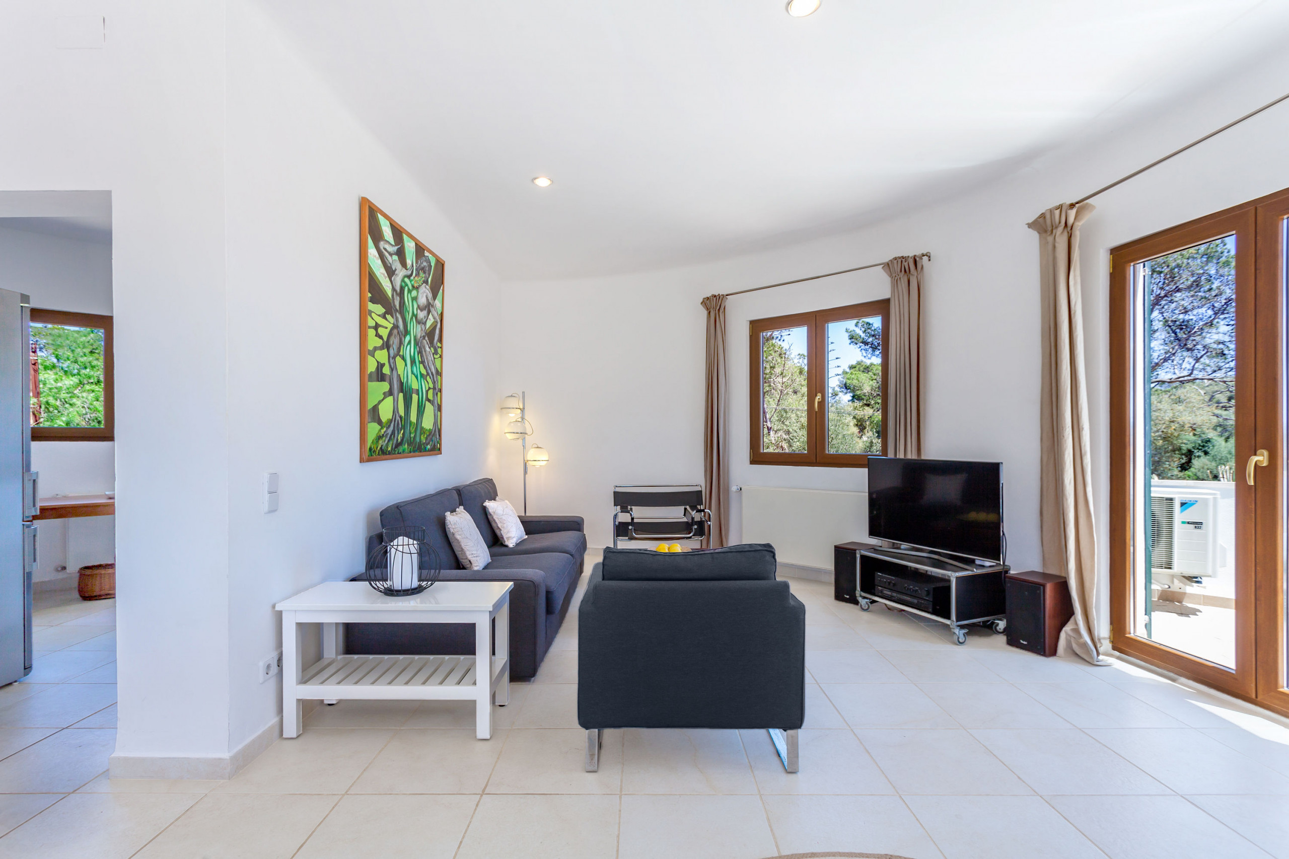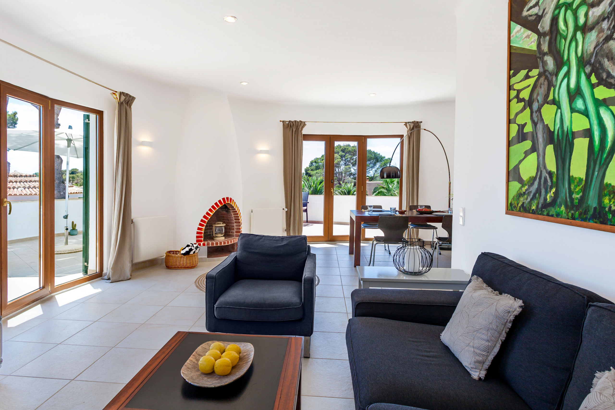 Der offene Wohn-Essbereich ist einladend gestaltet: eine voll ausgestattete Küche, ein gemütliches Sofa, Kamin und TV bieten besten Komfort – perfekt für entspannte Abende nach einem Strandtag. Vom Wohnbereich aus gelangen Sie direkt auf die großzügige Terrasse, die mit einem schönen Essbereich und einer stilvollen Loungeecke ausgestattet ist. Hier genießen Sie das mediterrane Klima – beim Frühstück im Schatten, einem Glas Wein am Abend oder beim Lesen in Ihrem privaten Rückzugsbereich.