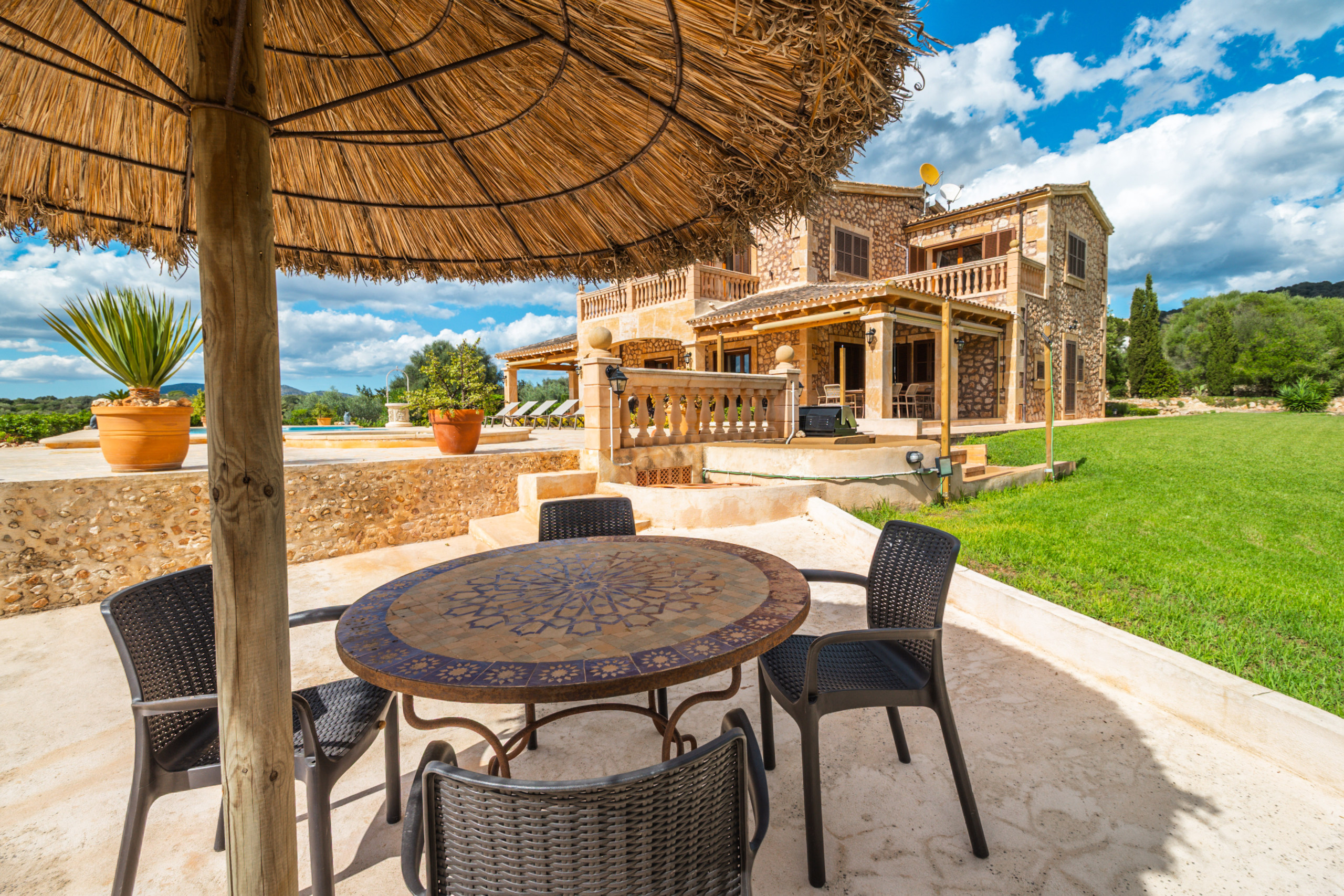 Die Finca bietet rund 290 m² Wohnfläche, ergänzt durch 70 m² überdachte Terrassen und eine kleine Dachterrasse mit herrlichem Ausblick. Mit insgesamt fünf Schlafzimmern und fünf Badezimmern bietet sie Platz für bis zu zehn Personen und ist damit ideal für Familien, befreundete Paare oder kleine Gruppen.