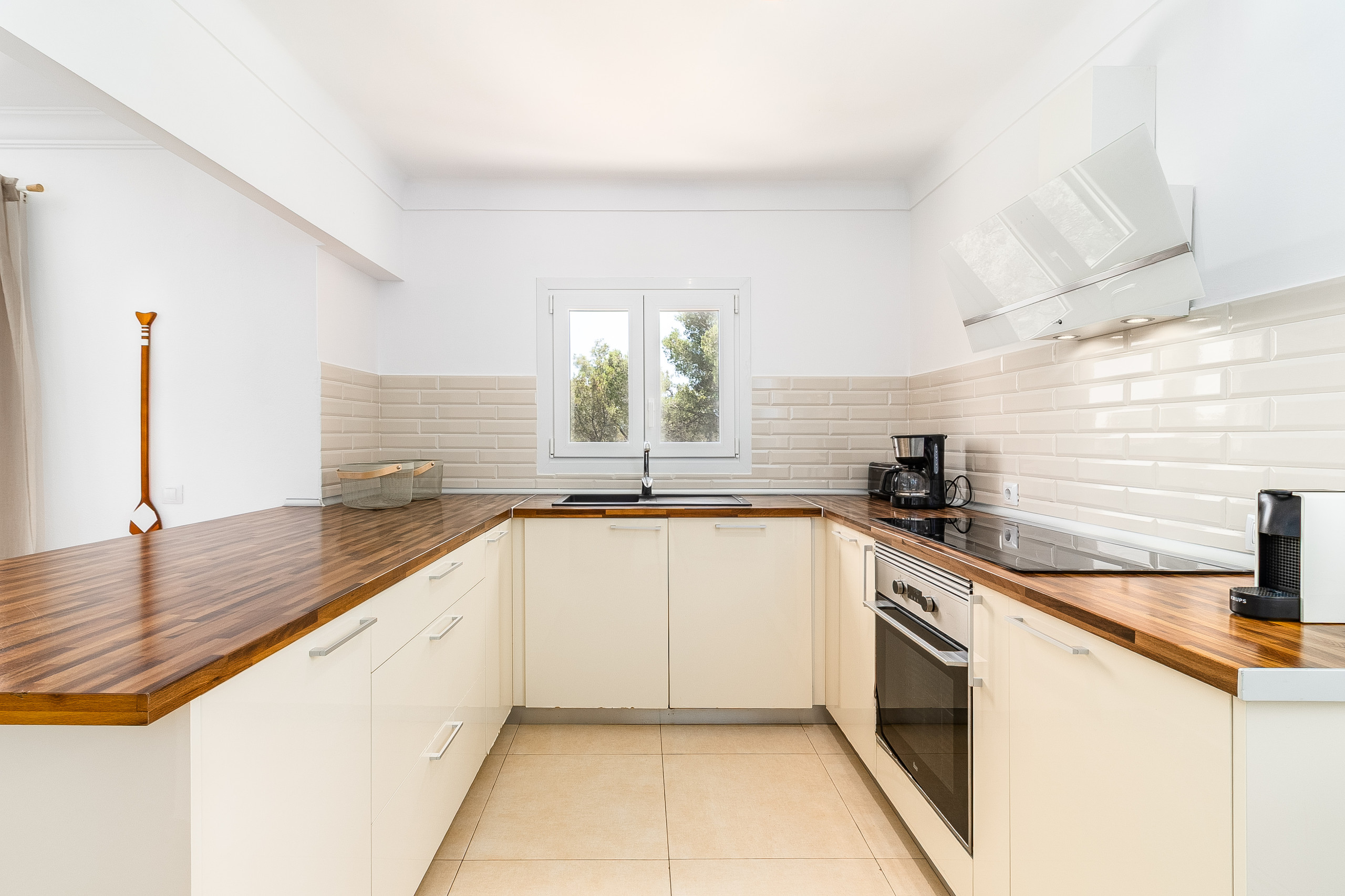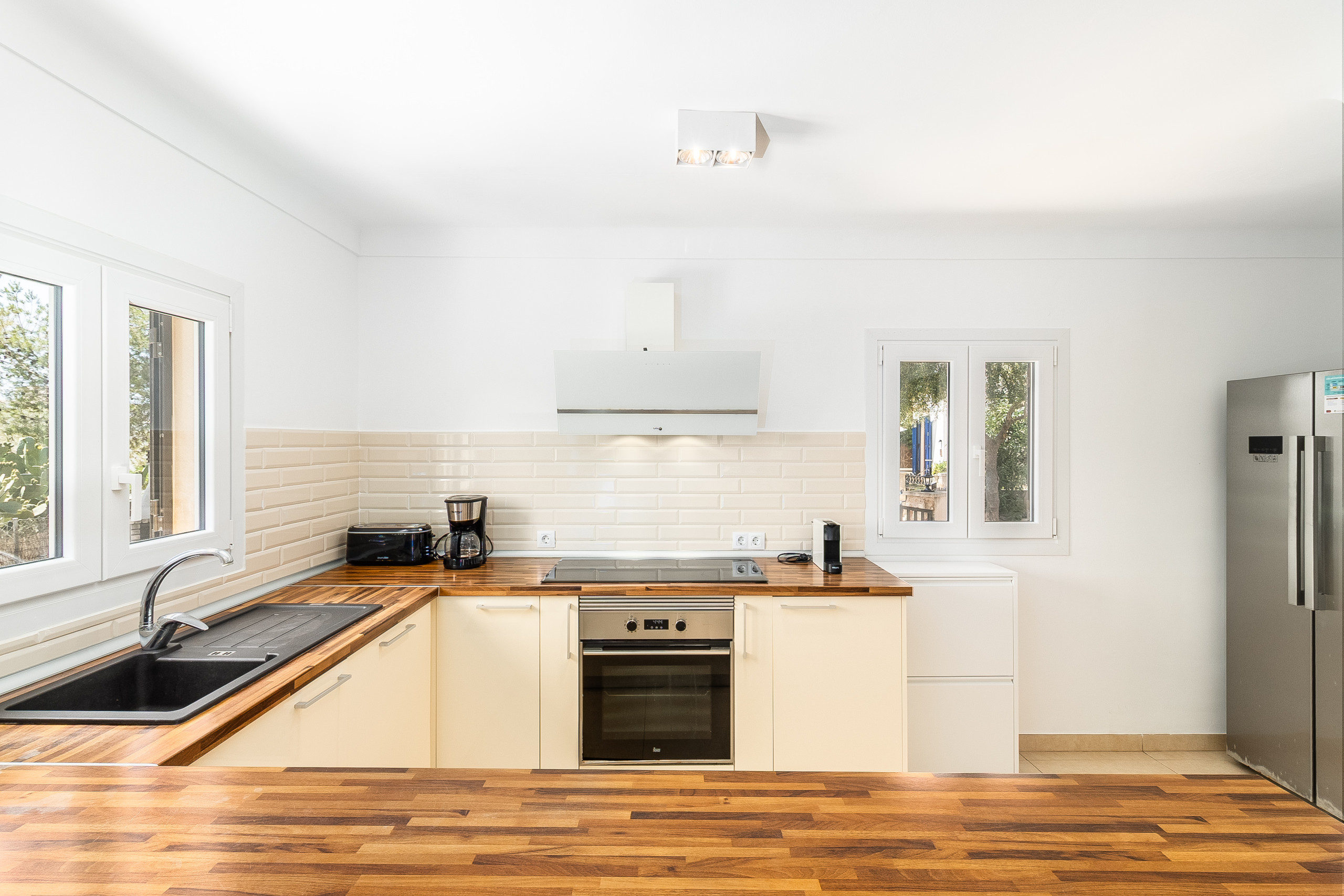 Die Villa besticht durch eine einladende, geschmackvolle Einrichtung, die modernen Komfort mit mediterranem Flair verbindet. Der offene Wohn- und Essbereich ist hell und großzügig gestaltet und schafft eine gemütliche Atmosphäre, die zum Verweilen einlädt. Die voll ausgestattete Küche erfüllt alle Wünsche und bietet die perfekte Ausstattung, um gemeinsame Mahlzeiten zu genießen.
