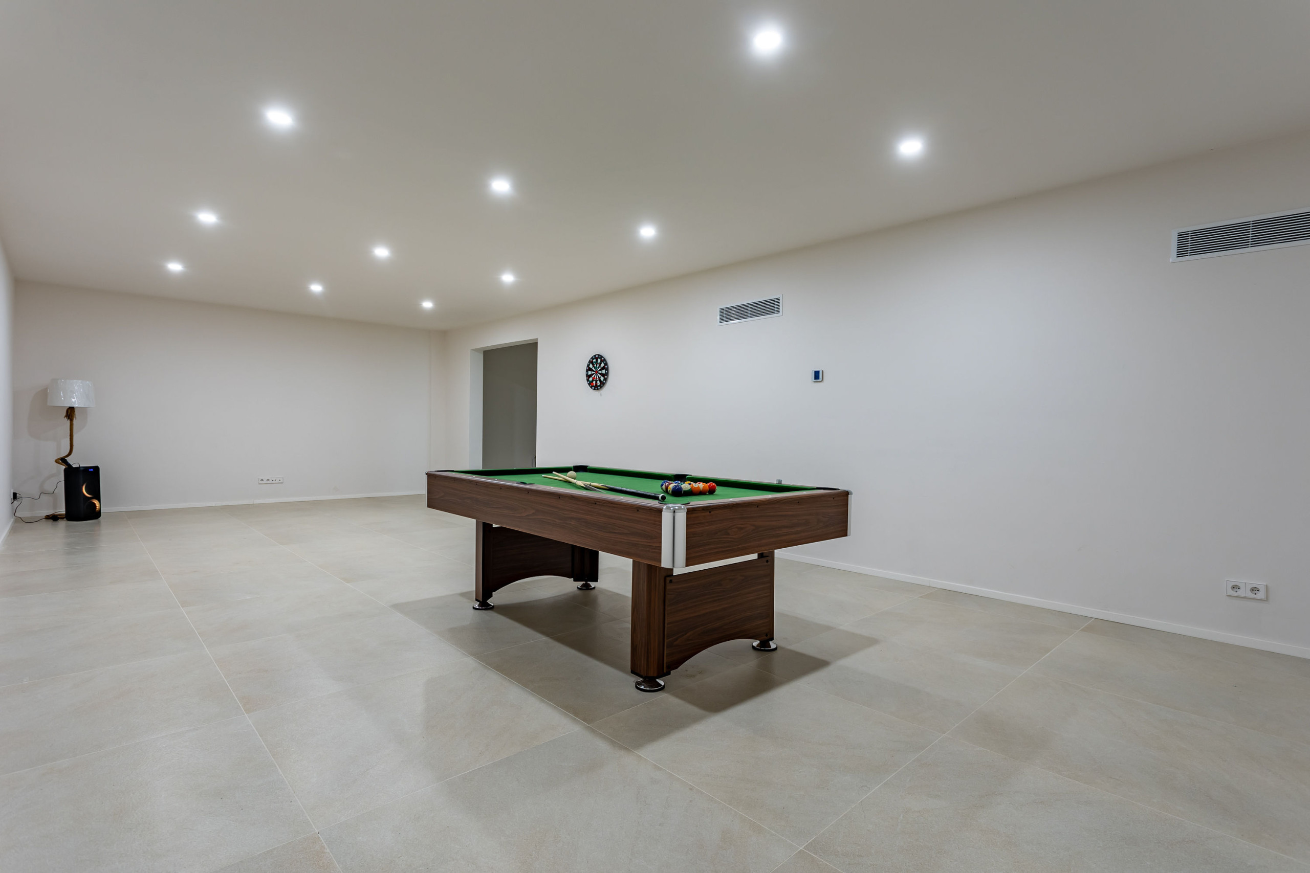 Die Villa verfügt über vier Schlafzimmer mit Doppelbetten in der Größe 180x200 cm, fünf Badezimmer, eine geräumige Aufenthaltszone mit Kamin, eine offene Küche, einen Essbereich und mehrere Ruhezonen. Alle Räume sind mit Klimaanlage, Ventilatoren und Fußbodenheizung ausgestattet. Eine Suite im Erdgeschoss verfügt über ein eigenes Badezimmer mit Badewanne und Ankleidezimmer, die zweite Suite im Obergeschoss bietet Ausblicke auf den Garten, die Berge und den Pool.