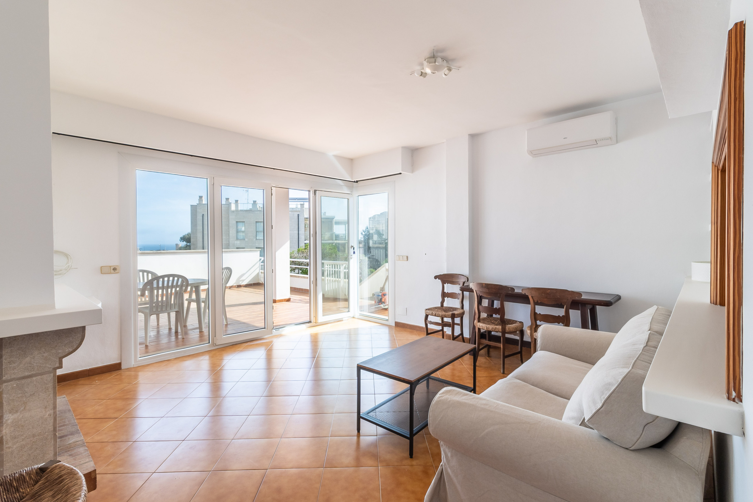 El área de estar con chimenea crea una atmósfera acogedora y ofrece un espacio directo para el día a día. Los aires acondicionados con función de calor y frío garantizan un clima interior agradable durante todo el año. El apartamento cuenta con dos dormitorios y un baño con bañera. Gracias a los sistemas solares existentes, la propiedad se beneficia además de un uso más eficiente energéticamente.