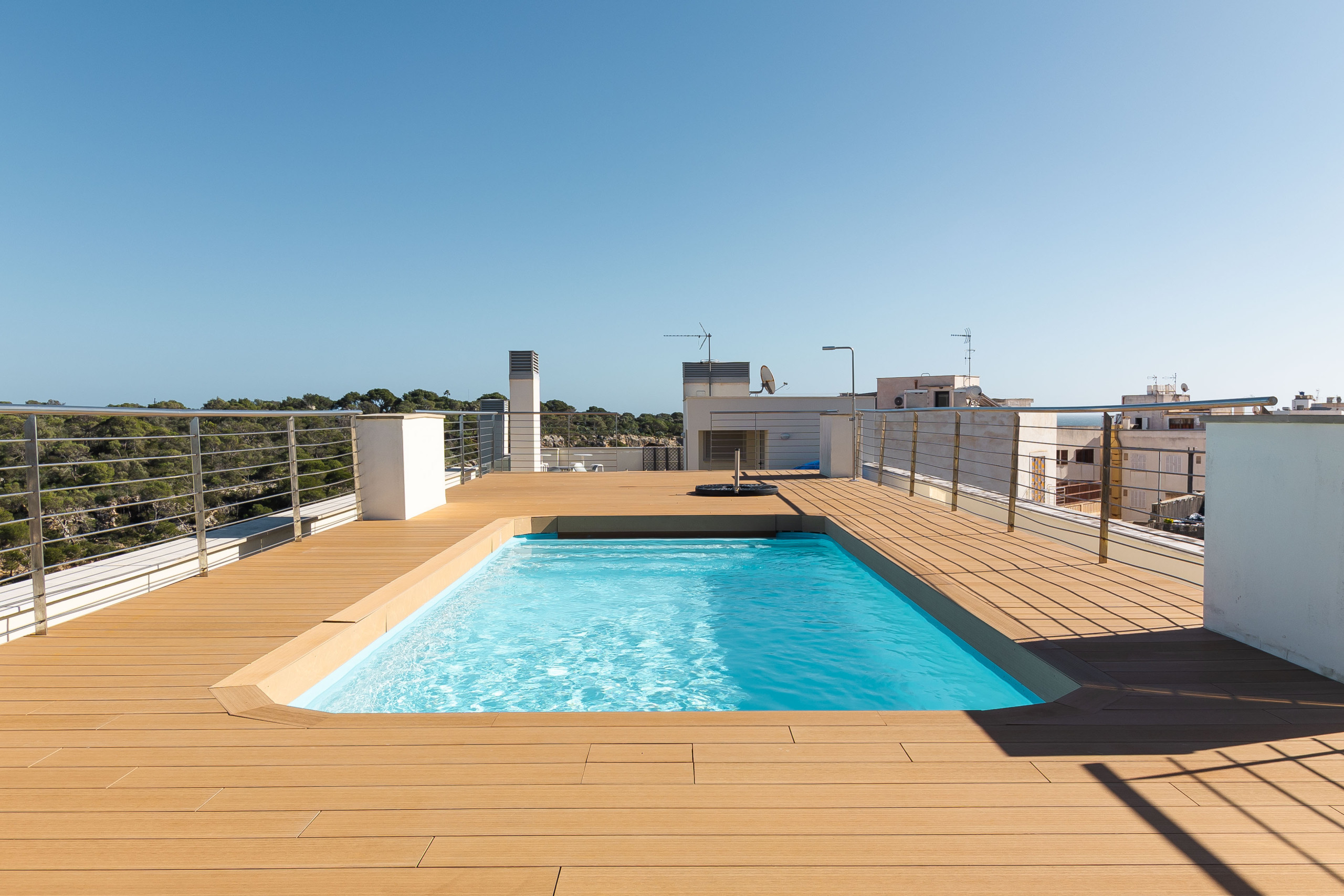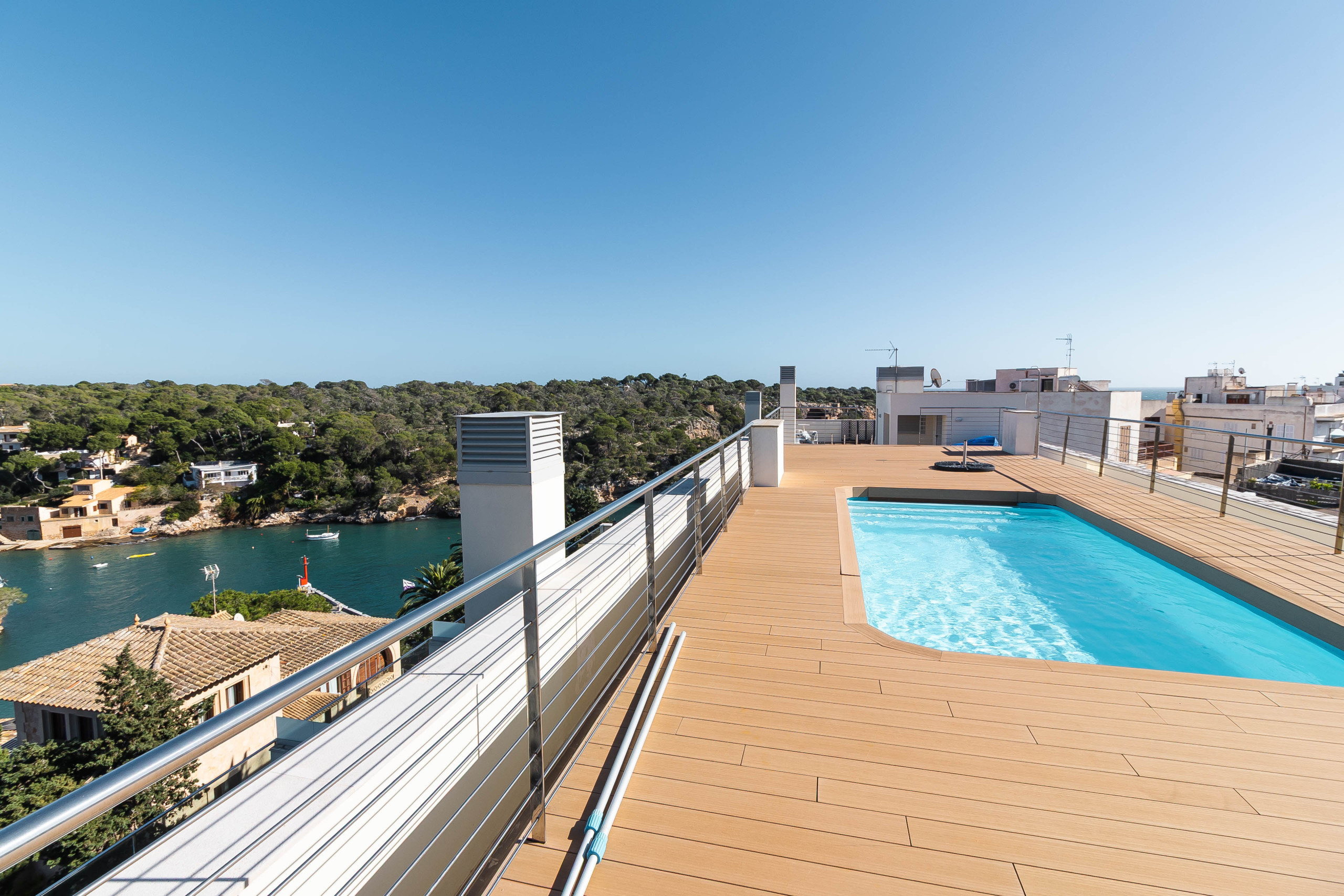 Un punto destacado especial del complejo residencial es la piscina comunitaria en la terraza del ático. Equipada con tumbonas y sombrillas, los residentes disfrutan aquí de horas relajadas sobre los tejados de Cala Figuera y se benefician de un complemento atractivo para su espacio de vivienda privado.