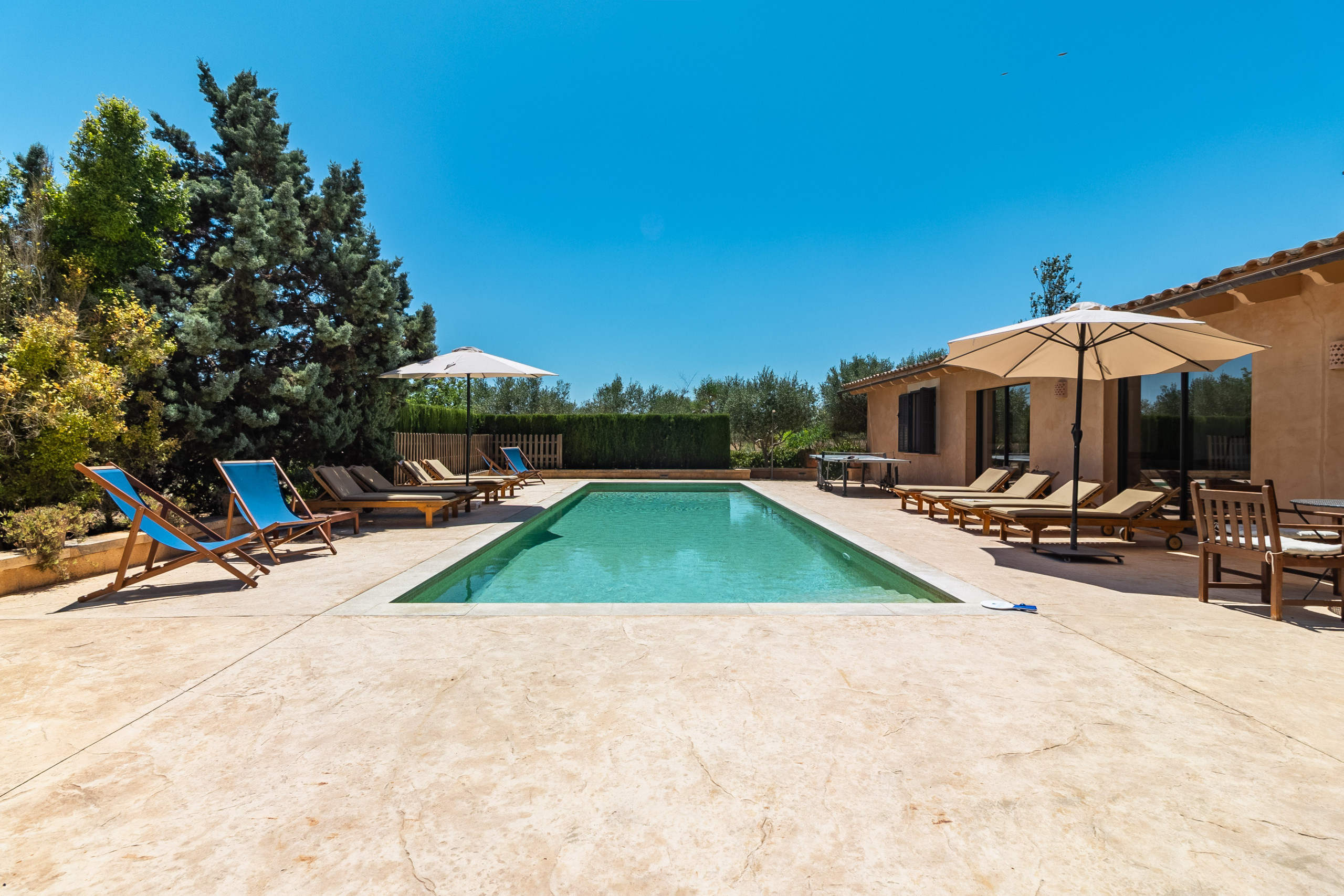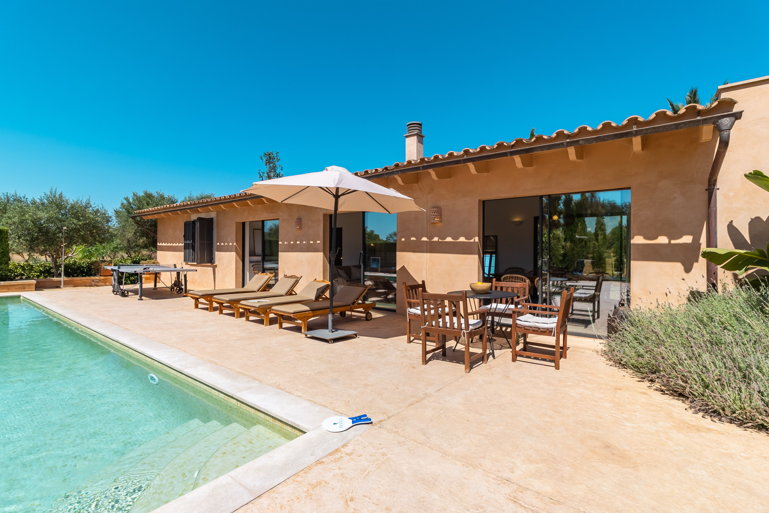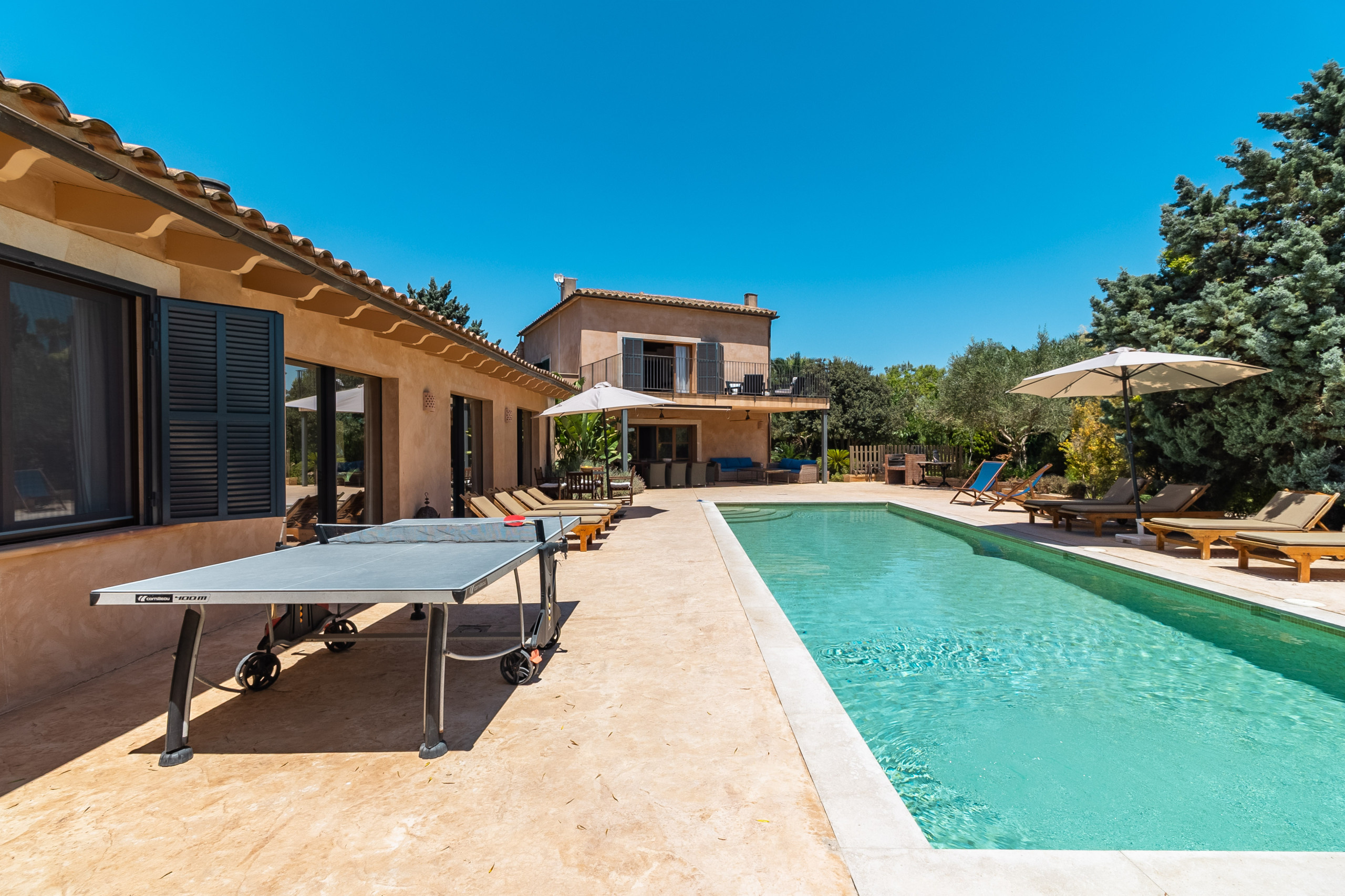 El amplio espacio exterior de la finca es tan acogedor como el interior: Una hermosa piscina de agua salada con azulejos de mosaico turquesa está enmarcada por una generosa terraza solar con tumbonas cómodas. Una terraza cubierta con cocina al aire libre, mesa de ping pong y futbolín hace la vida al aire libre perfecta, ya sea para largas veladas de barbacoa o momentos relajados a la sombra.