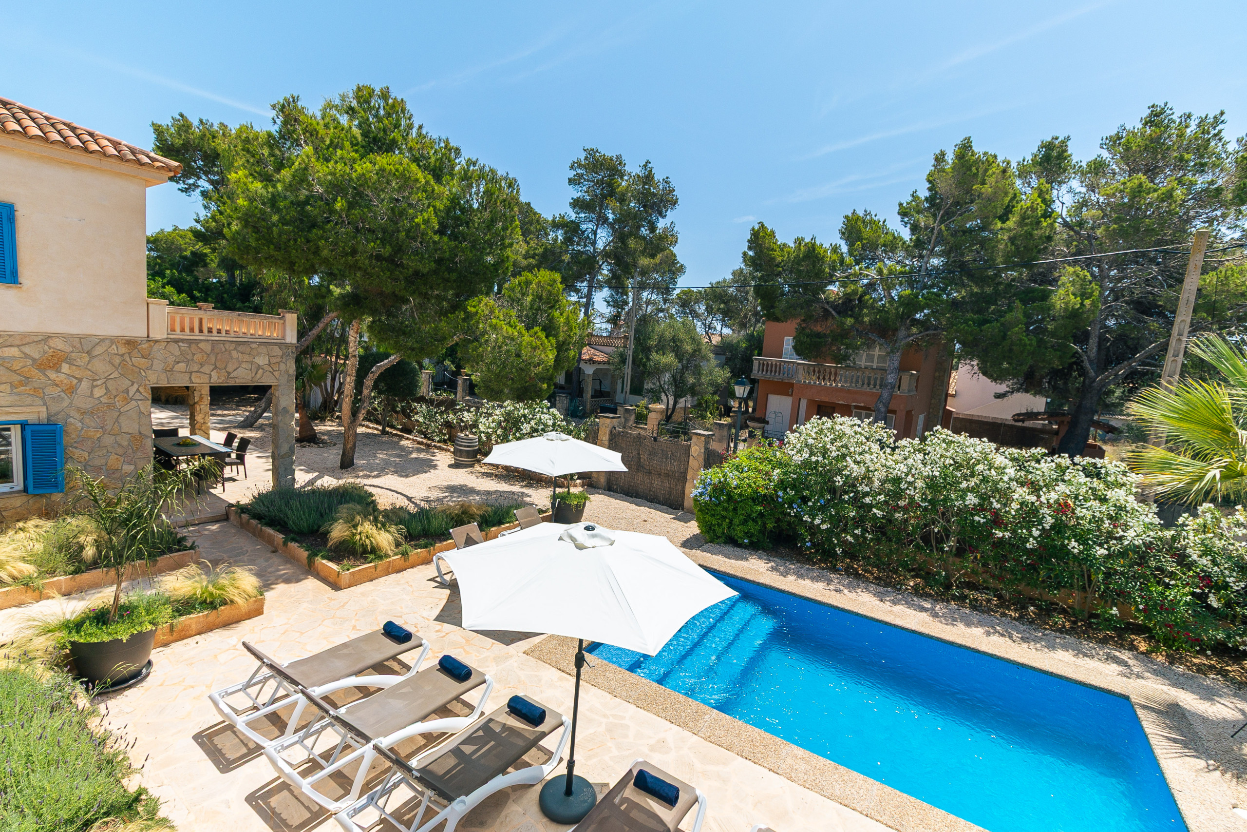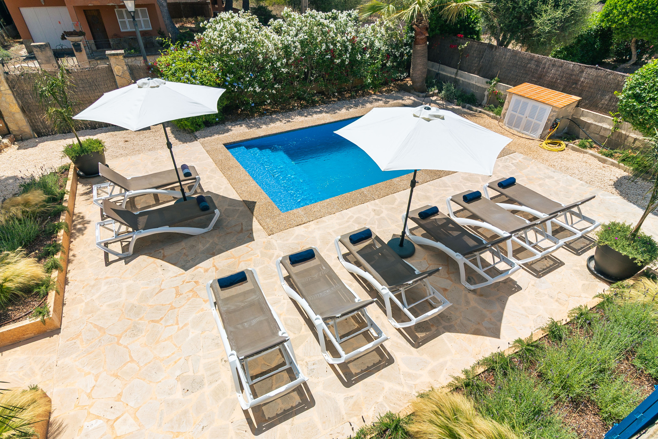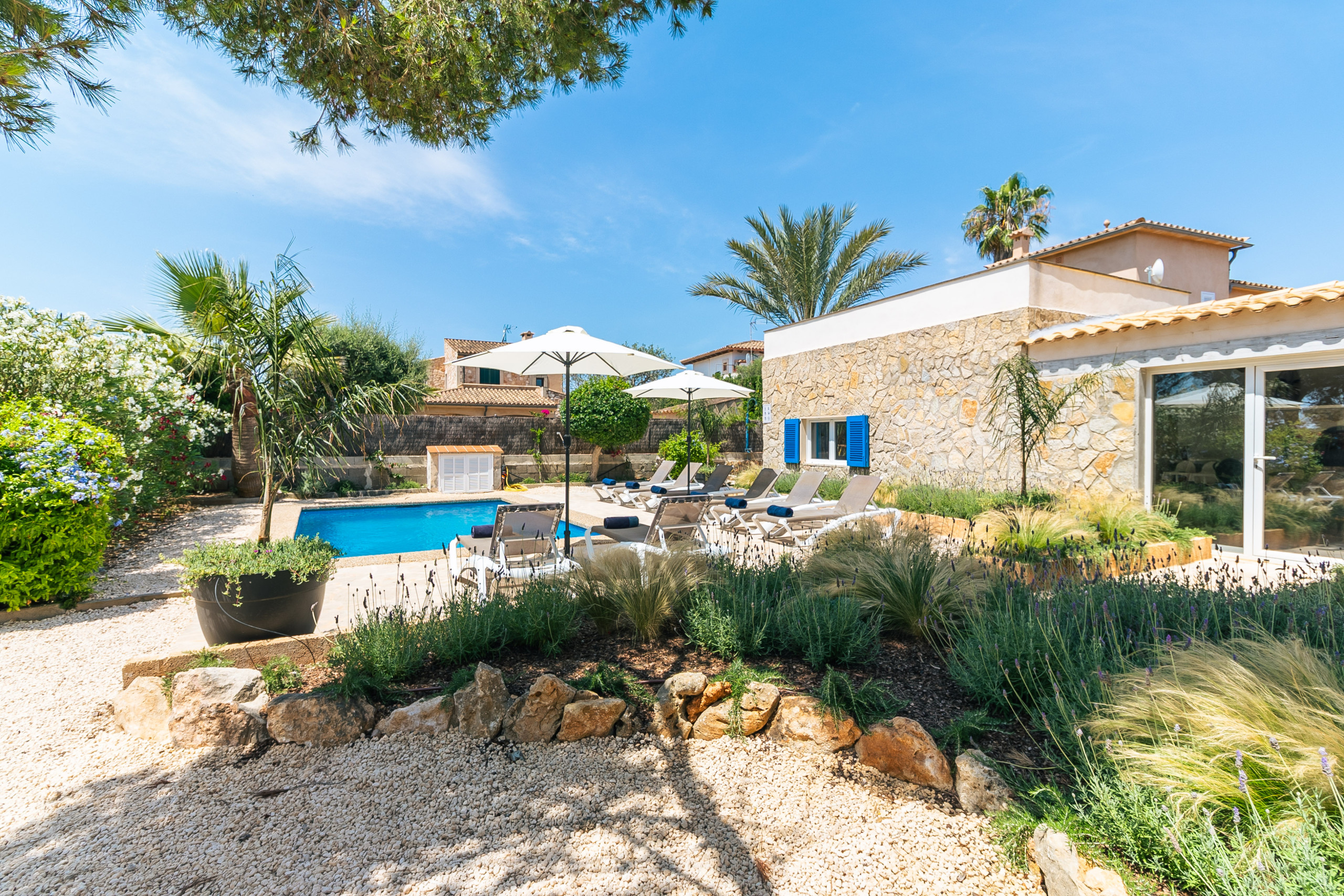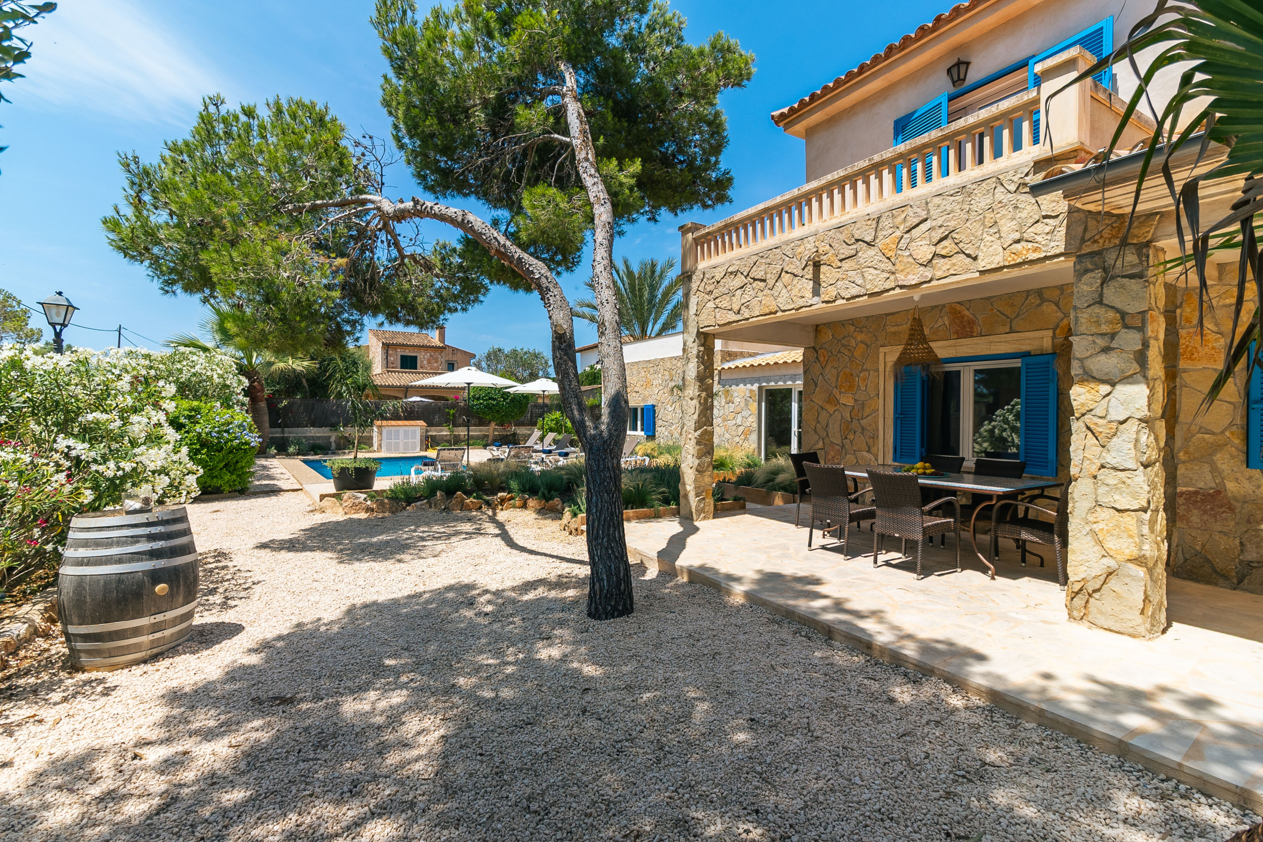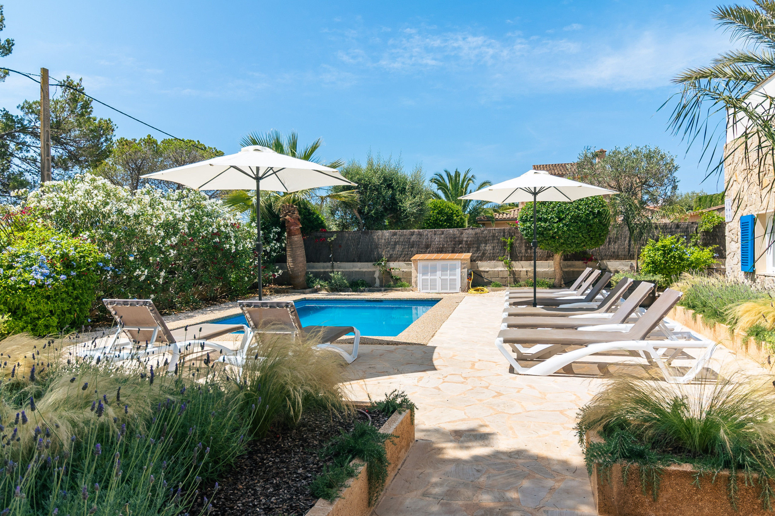 El exterior de la casa invita al relax con una piscina privada y una terraza amueblada. Una zona de barbacoa ofrece la posibilidad de disfrutar de cenas al aire libre en las cálidas noches de verano. El jardín está rodeado de vegetación típica mallorquina, creando un entorno perfecto para desconectar. La propiedad está completamente vallada y cuenta con tres plazas de aparcamiento.