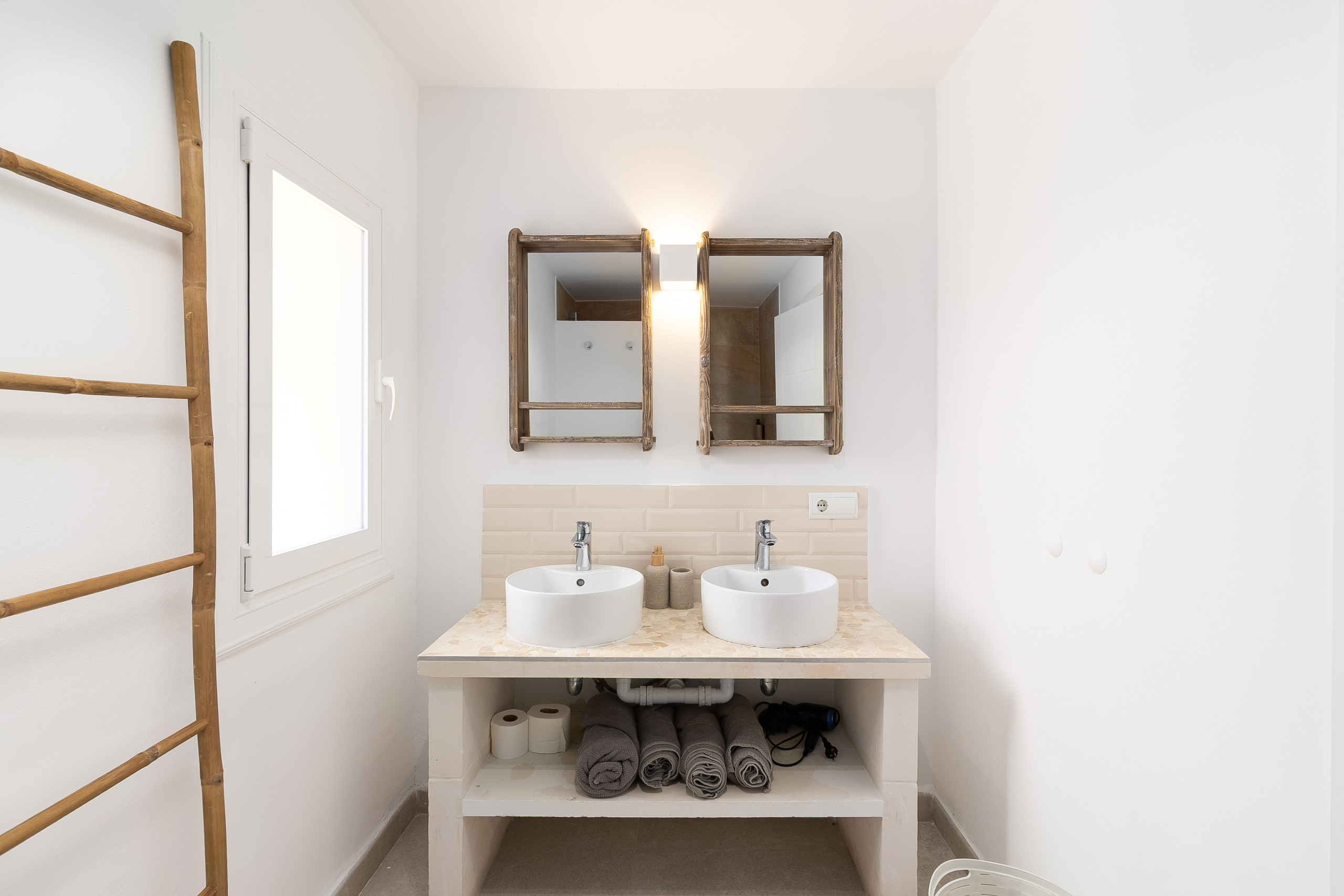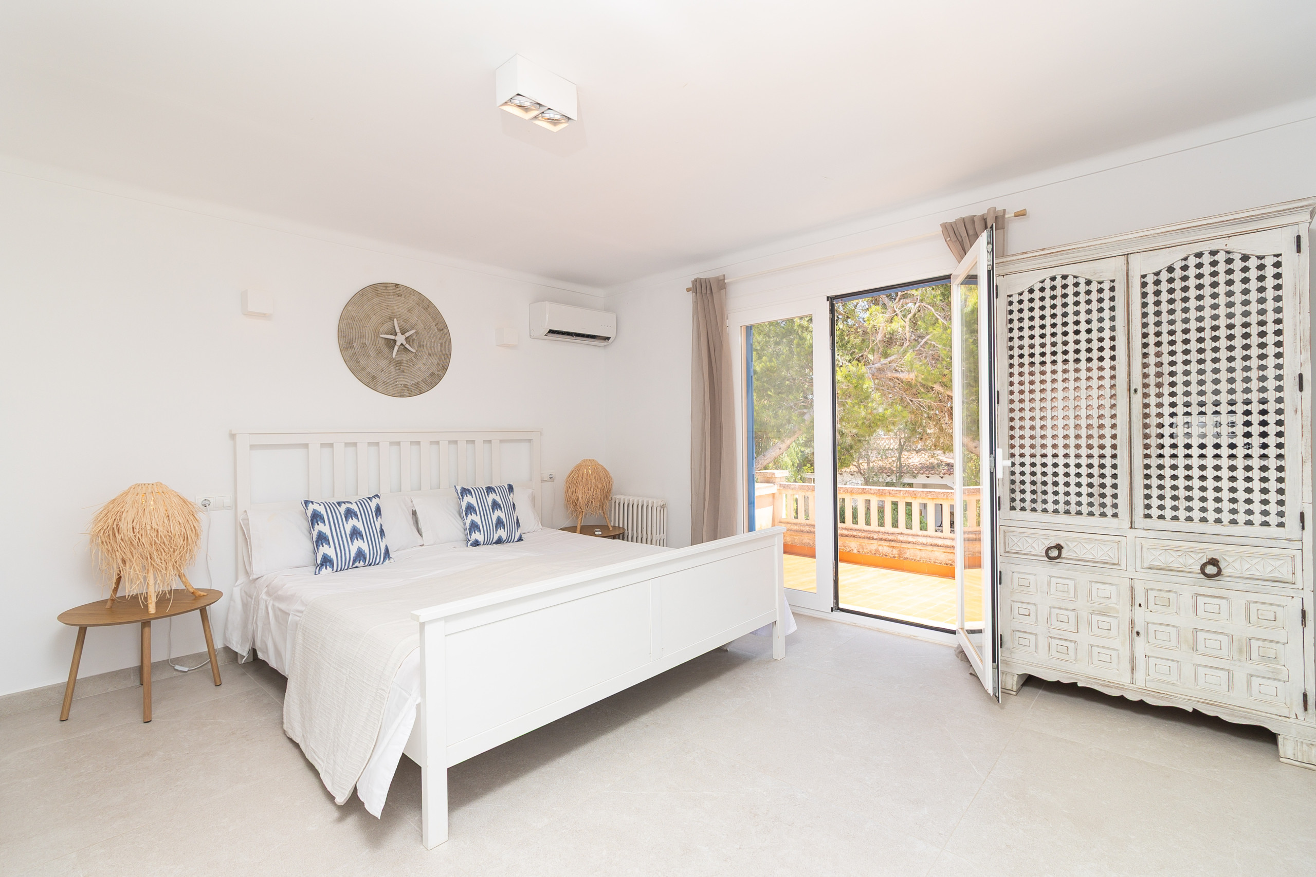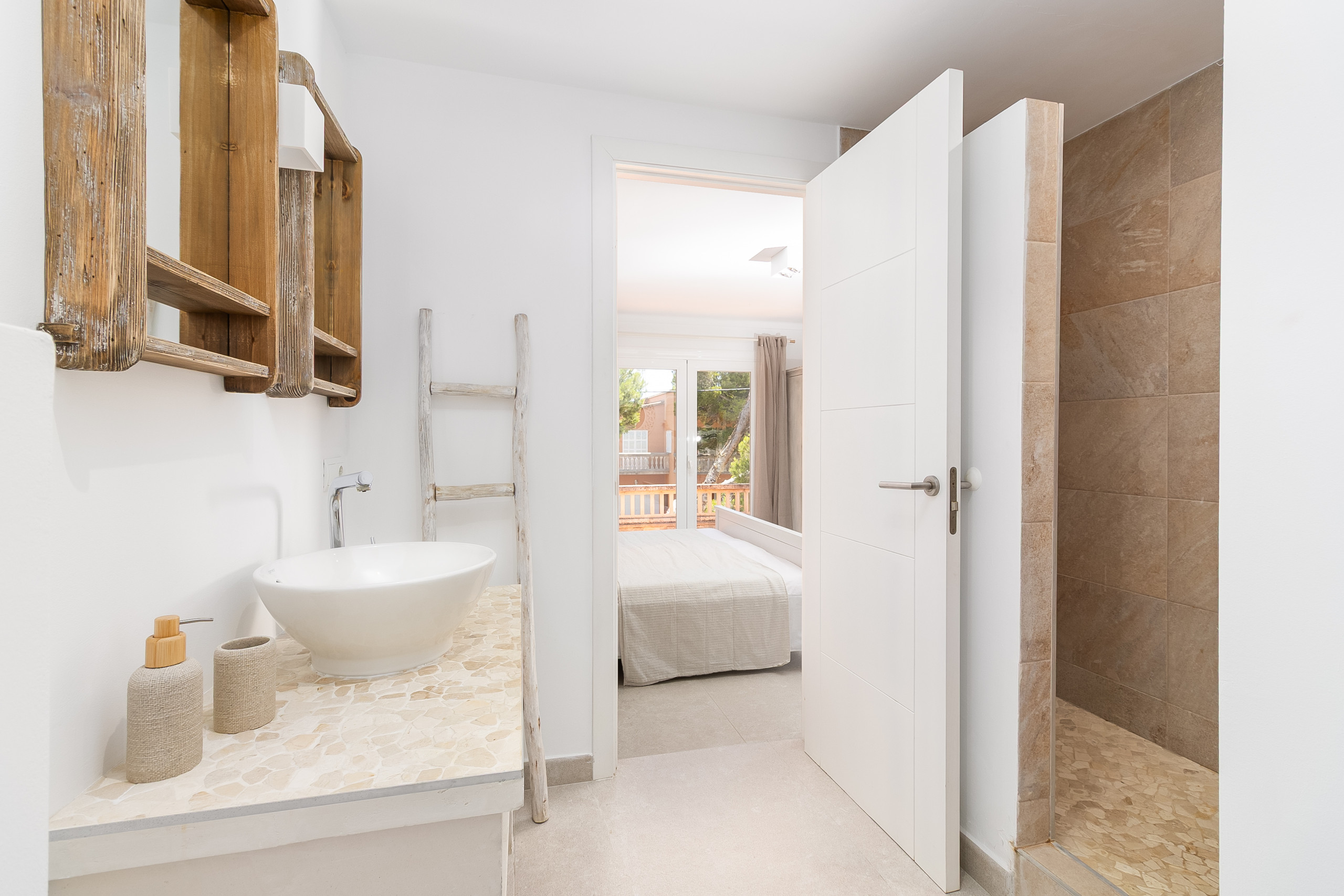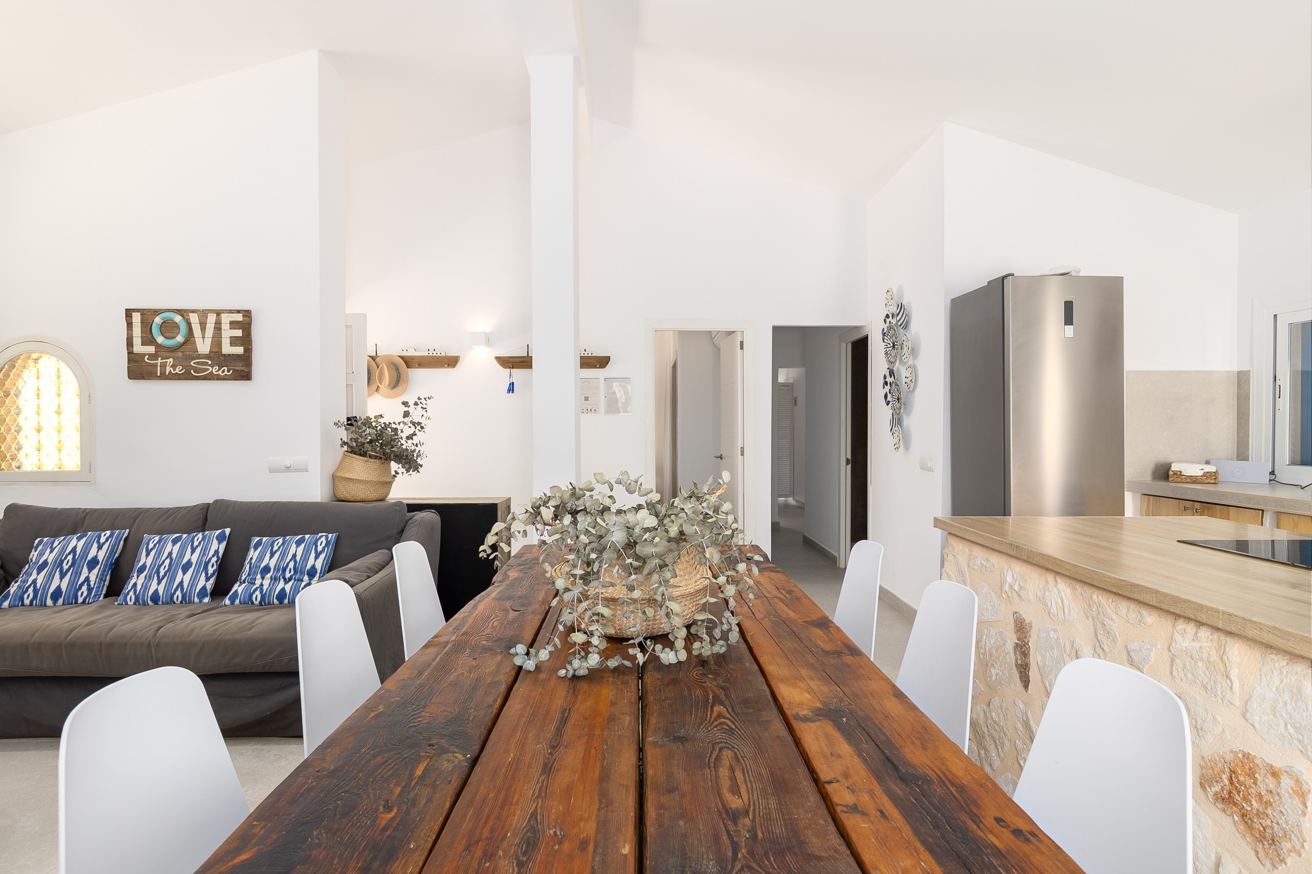 La villa está dividida en tres plantas: en la planta baja hay dos dormitorios que comparten un baño con ducha. En la primera planta se encuentra la luminosa y abierta zona de estar-comedor con cocina adyacente y acceso directo a la terraza con una vista impresionante del mar. La terraza es el lugar ideal para un desayuno acogedor en compañía o para disfrutar de una cena romántica con vistas al mar. Si están muy callados, quizás escuchen el murmullo del mar. En la segunda planta está el espacioso dormitorio principal con baño en suite con ducha. Desde aquí tienen una vista panorámica de toda la bahía de Cala Santanyí y se despiertan cada mañana con un horizonte azul profundo.
