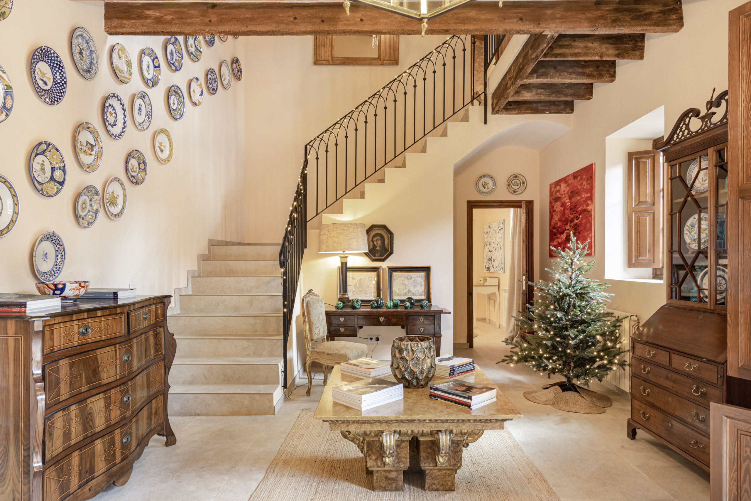 Un camino privado bordeado por más de 200 cipreses conduce a la impresionante casa principal. Los muros de piedra natural, los techos de vigas de madera y los materiales de alta calidad dan a la finca su carácter auténtico y crean al mismo tiempo una atmósfera cálida y elegante.
