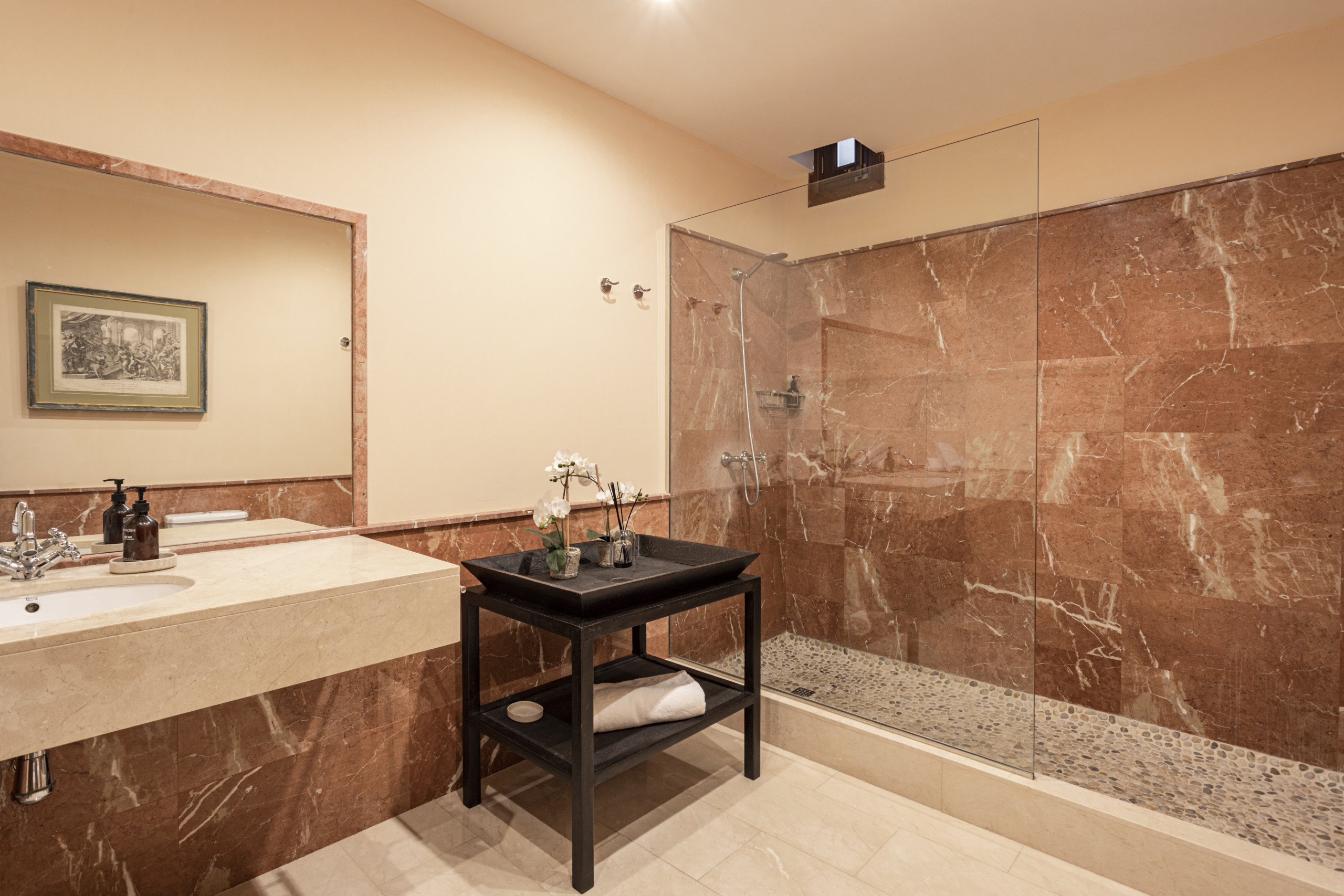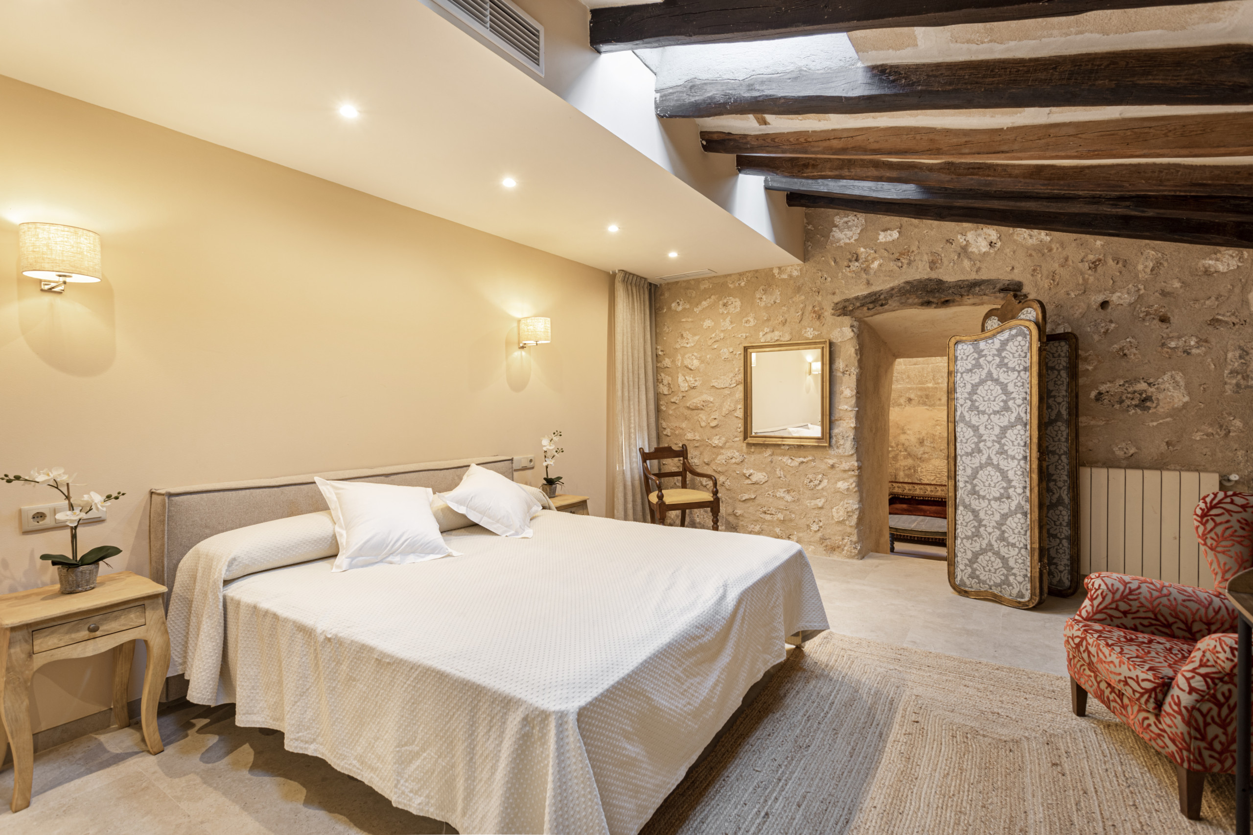 La propiedad cuenta con hasta 11 elegantes suites, cada una con su propio baño con ducha espaciosa. Las habitaciones están equipadas con camas king size, TV inteligente, caja fuerte y aire acondicionado individualmente regulable. Varias suites también disponen de terrazas amuebladas privadas o zonas de vestidor. En total, la propiedad puede albergar hasta 24 huéspedes.