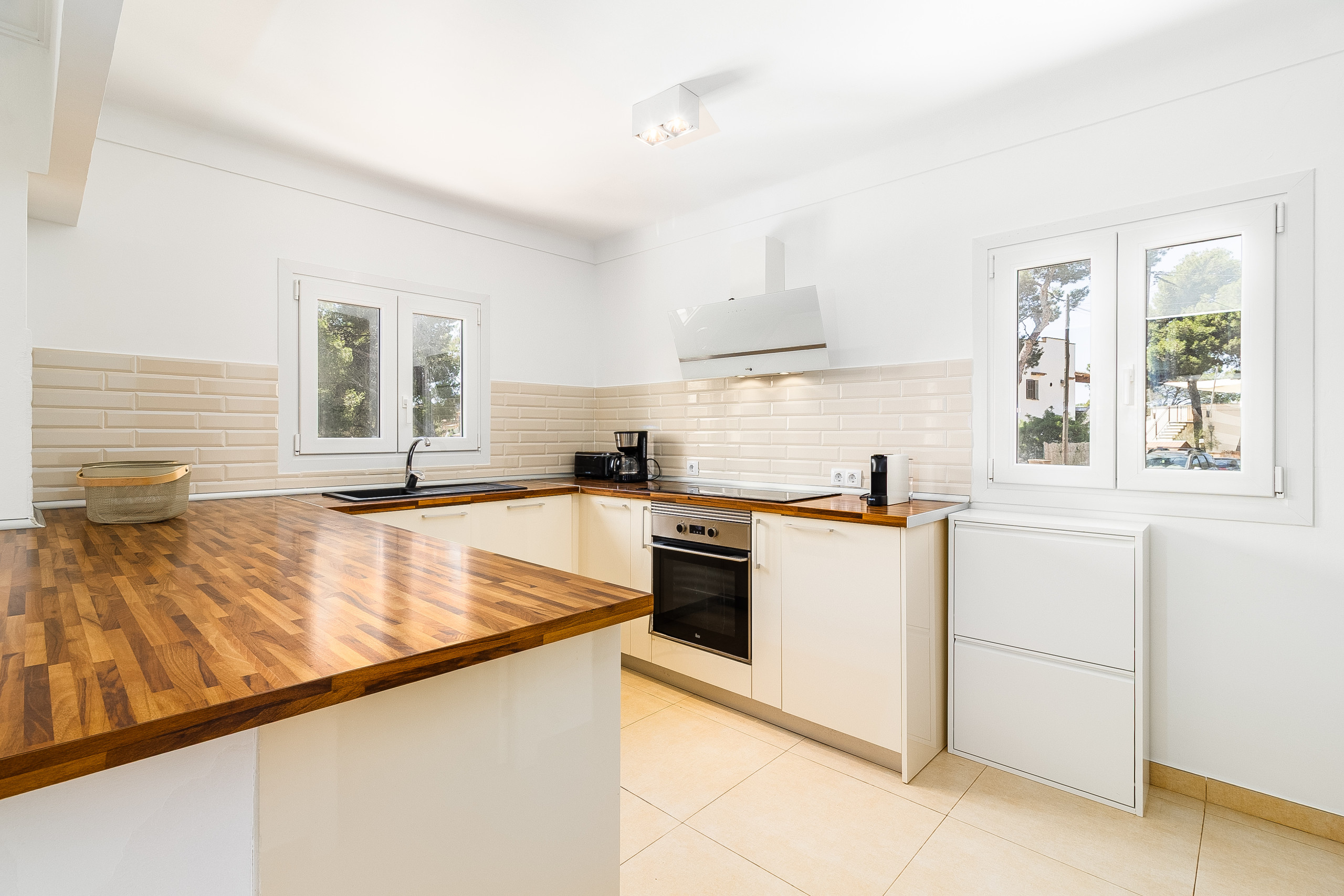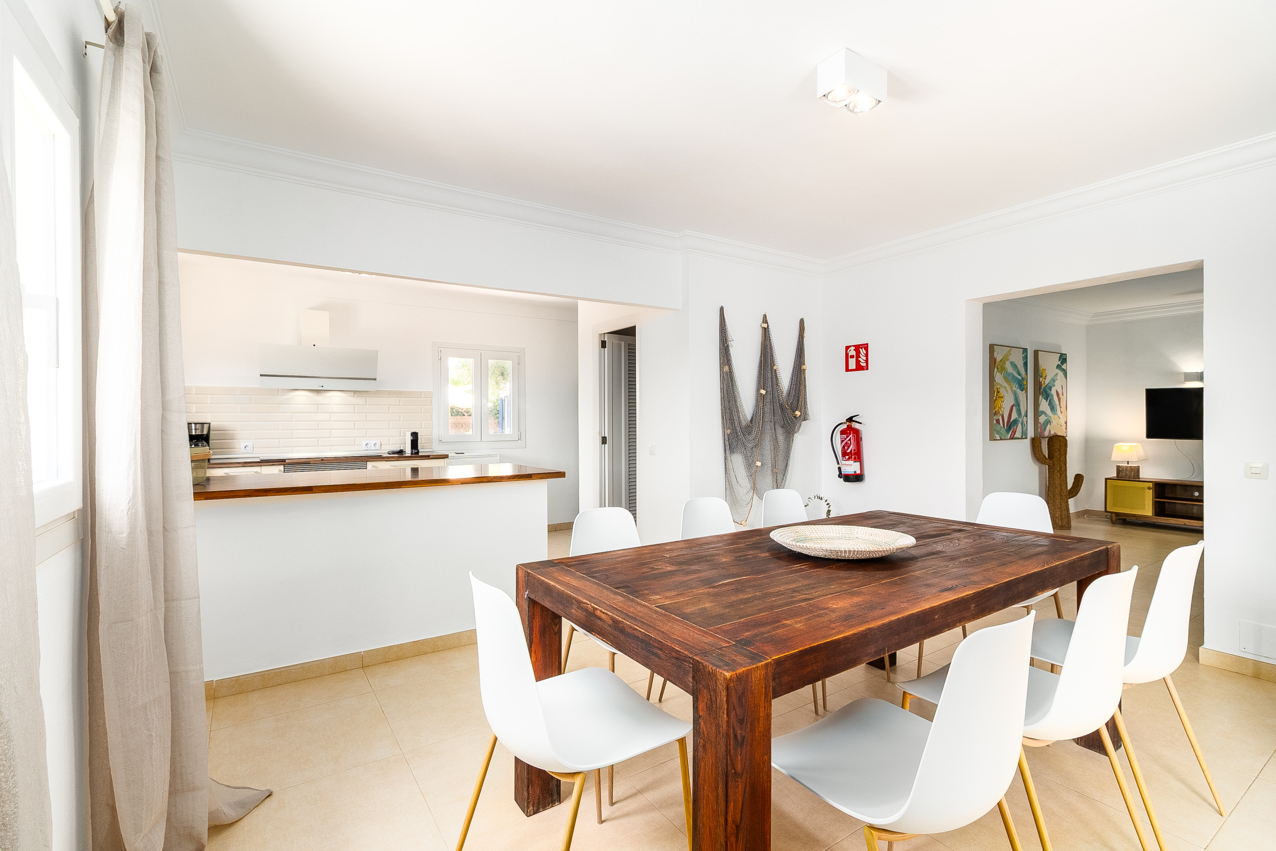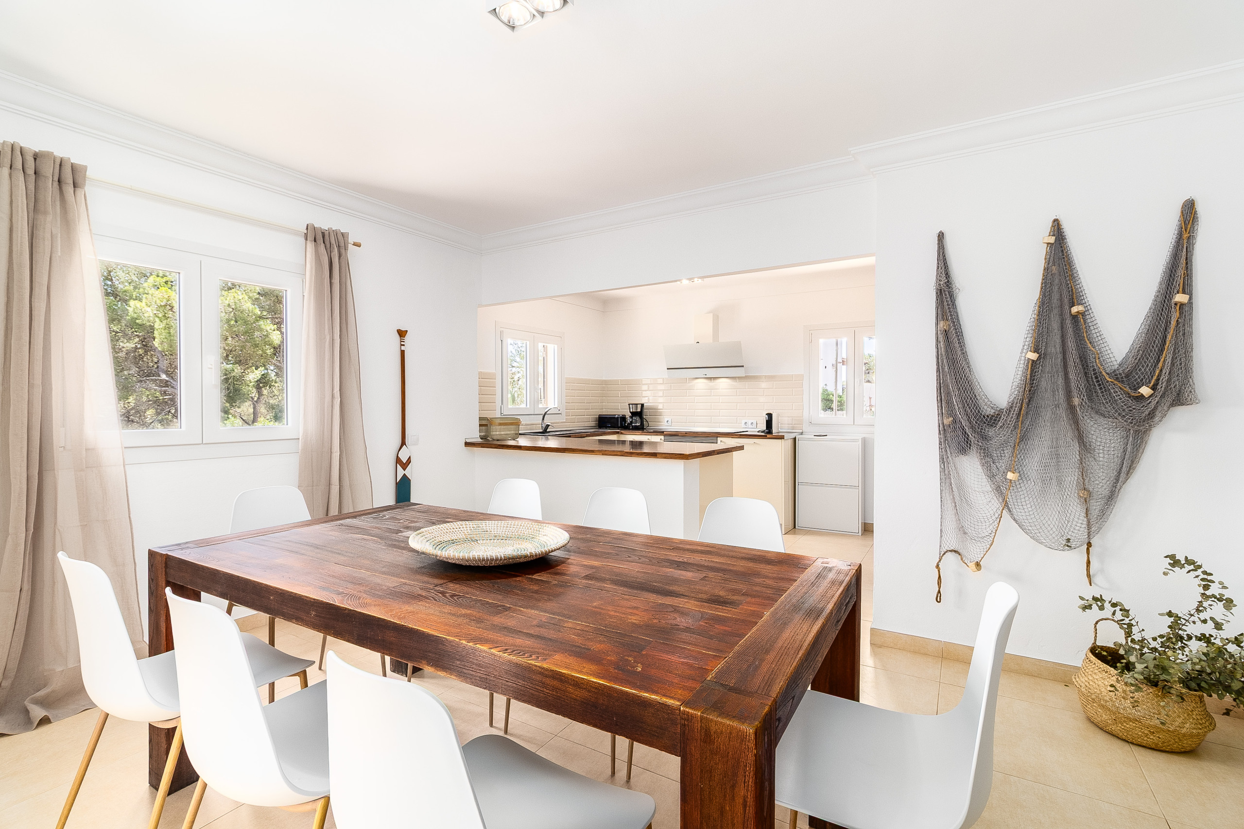 La villa destaca por un interior acogedor y de buen gusto que combina la comodidad moderna con el ambiente mediterráneo. La zona de estar y comedor abierta está diseñada de manera luminosa y espaciosa, creando una atmósfera acogedora que invita a la estancia. La cocina totalmente equipada cumple todos los deseos y ofrece el equipamiento perfecto para disfrutar de comidas en común.