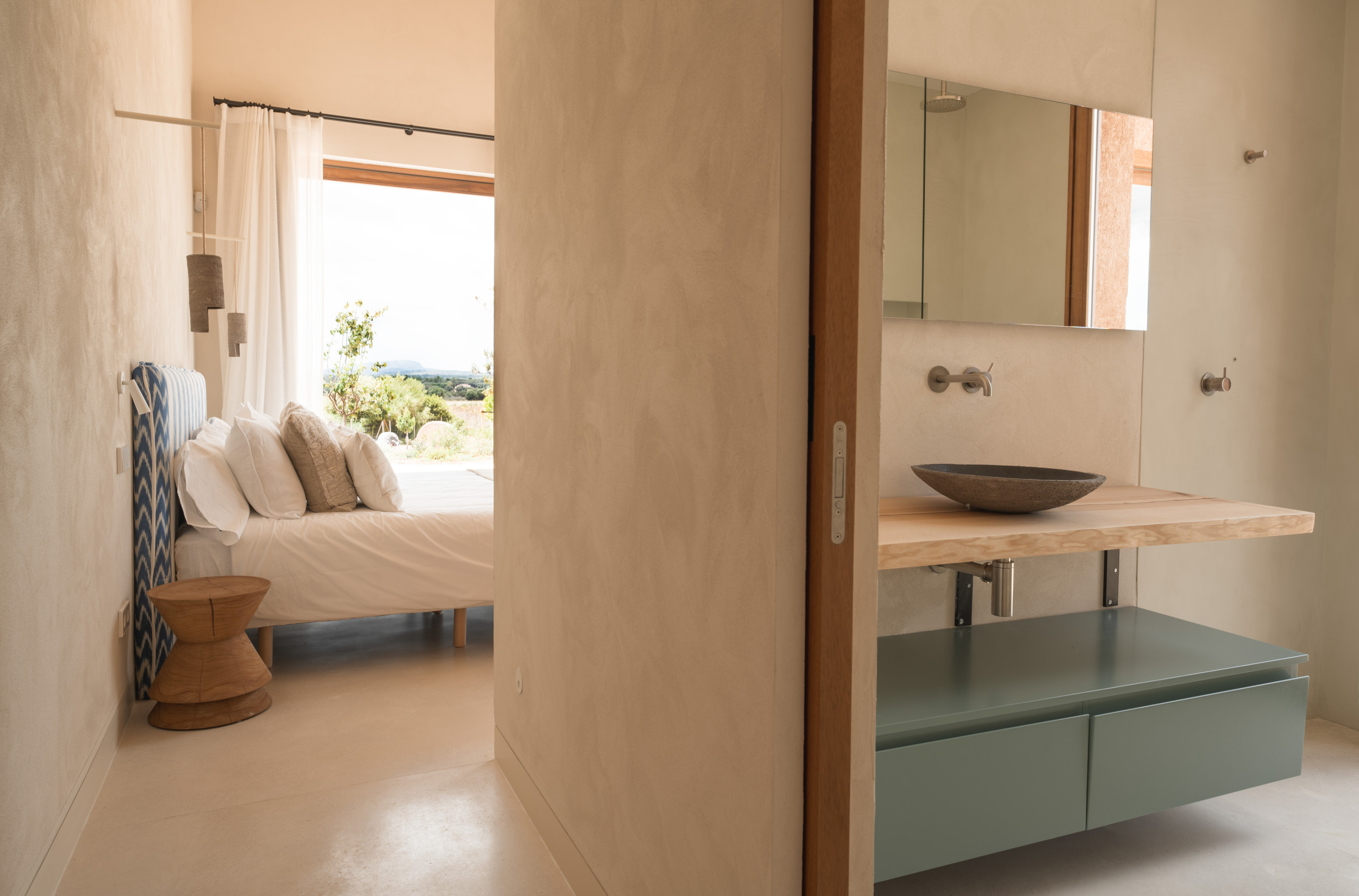 Las habitaciones se distribuyen en dos alas separadas, lo que confiere a la casa una agradable generosidad y estructura. En el ala izquierda se encuentran tres dormitorios luminosos con orientación sur y este, mucha luz natural, armarios empotrados, aire acondicionado y cada uno con su propio baño: dos con bañera y uno con ducha. Esta área se complementa con una acogedora sala de estar con sofá y TV, ideal como lugar de retiro.
