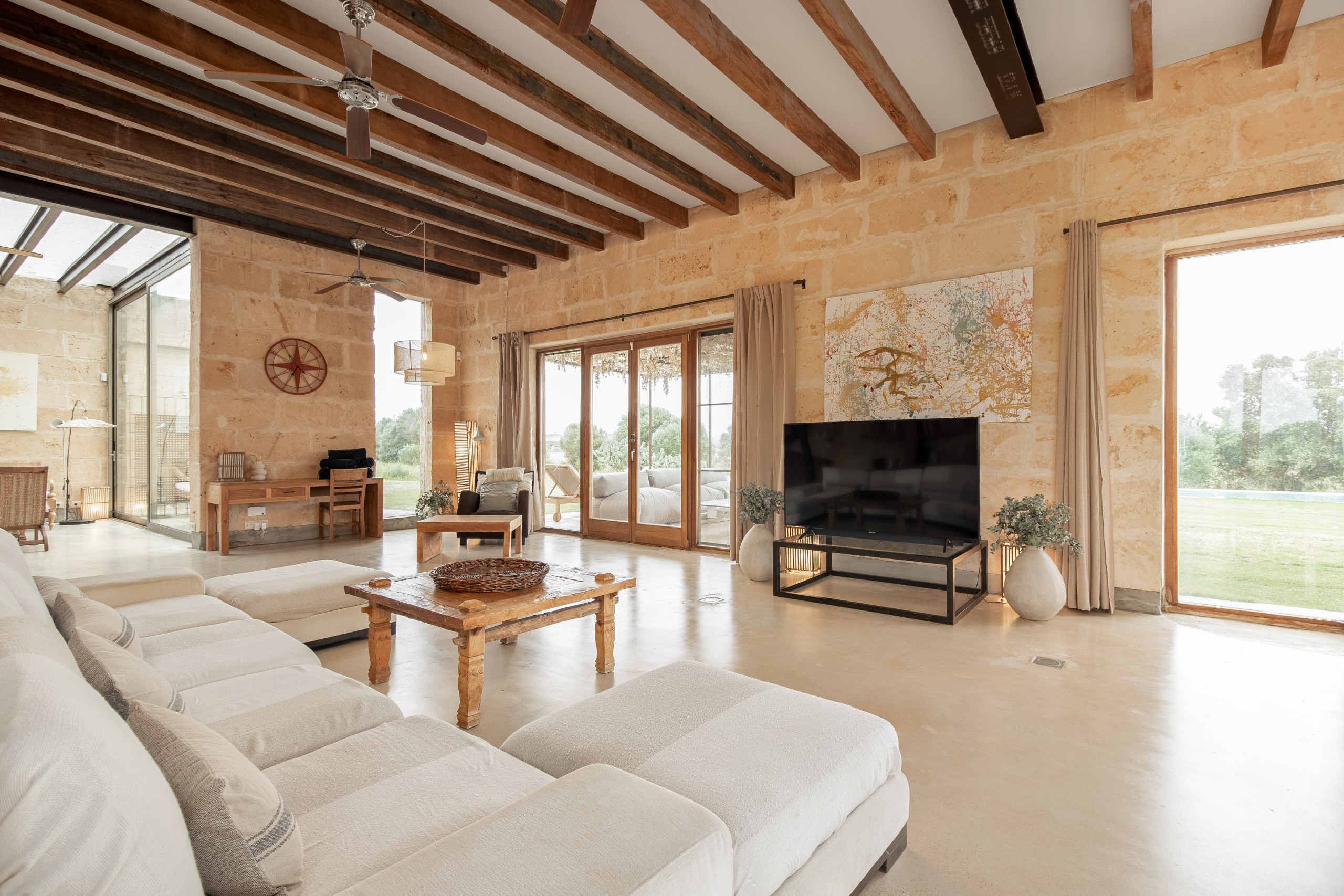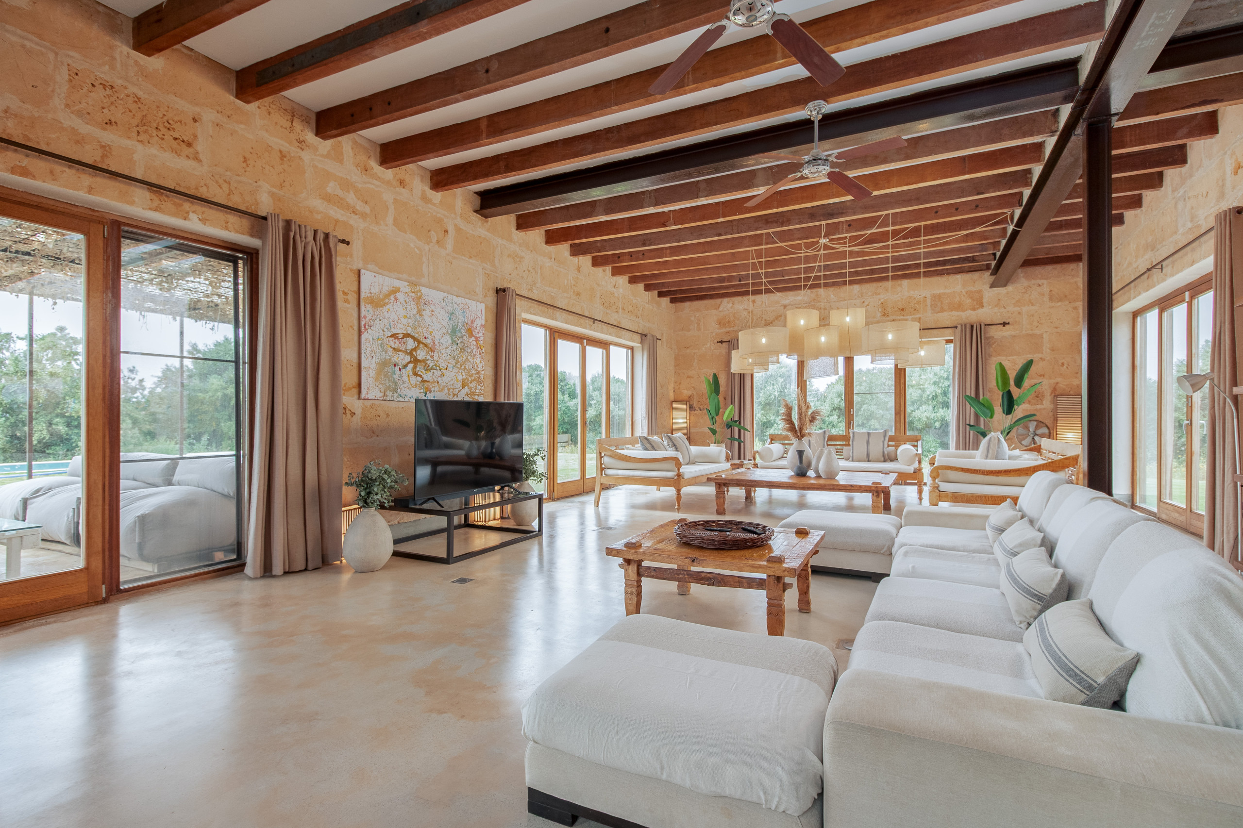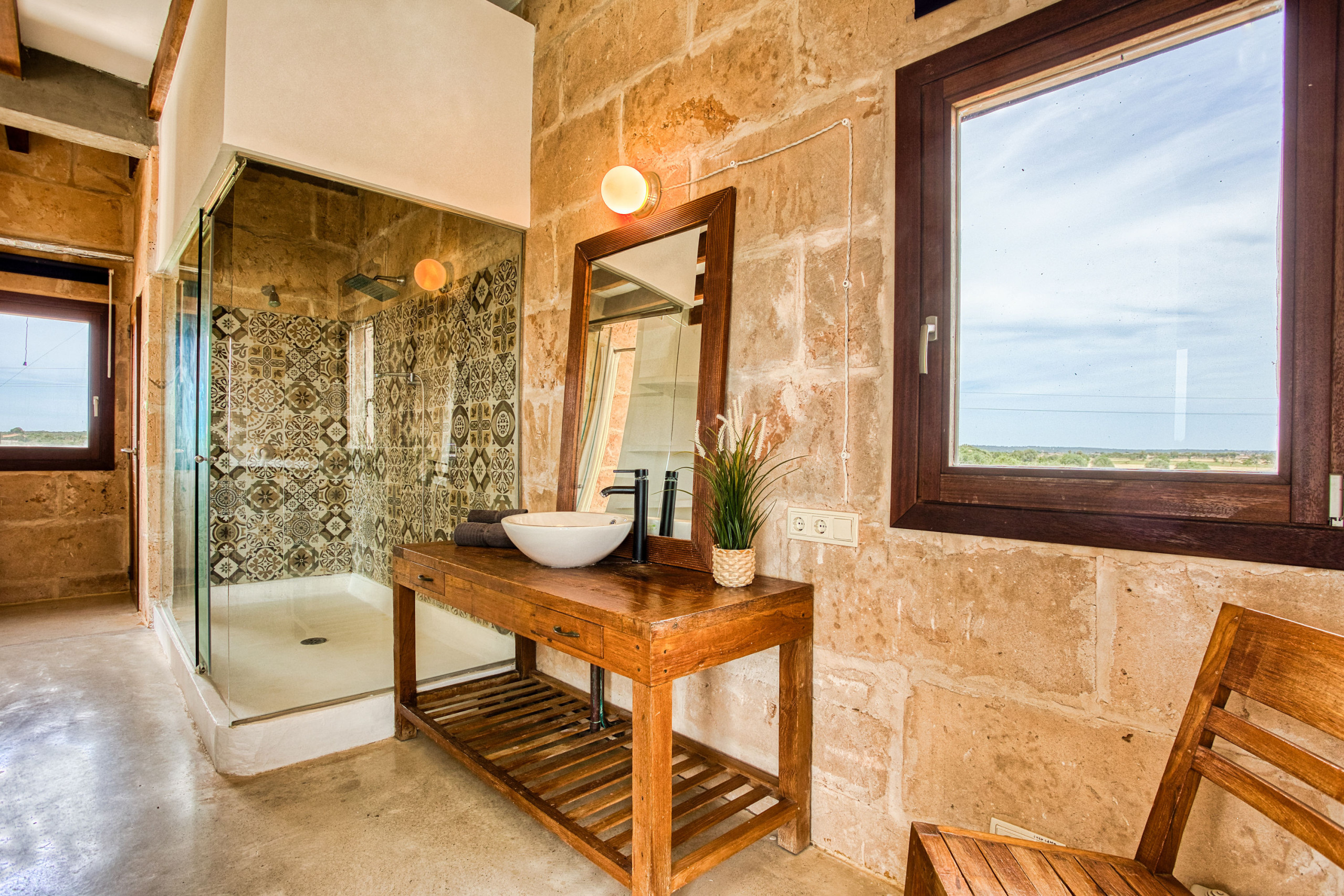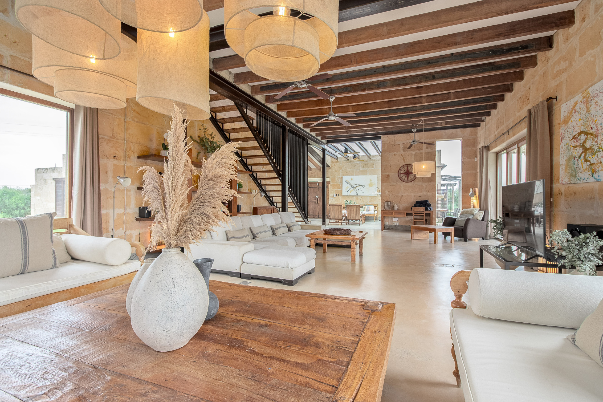 La finca fue construida en estilo tradicional con la típica piedra de Mares y combina el encanto mediterráneo con la comodidad de vivienda moderna. El luminoso salón-comedor convence por sus estructuras abiertas, una cocina totalmente equipada y acceso directo a las terrazas. Grandes superficies acristaladas crean una atmósfera acogedora y conectan el interior y el exterior de manera armoniosa.