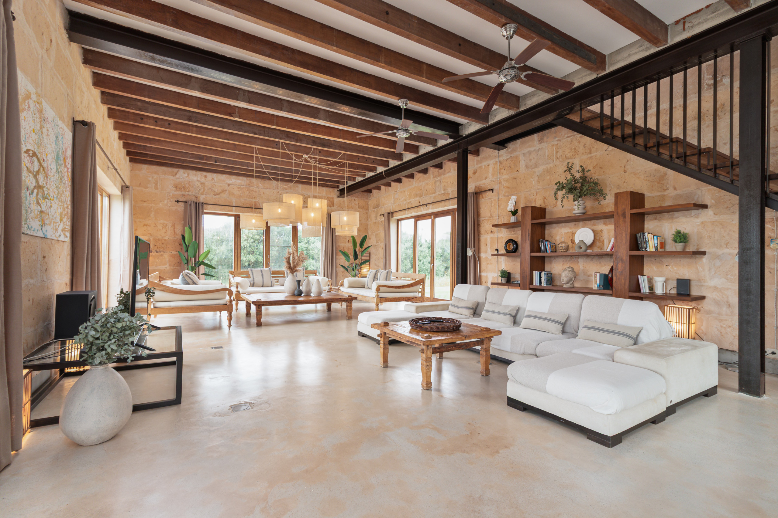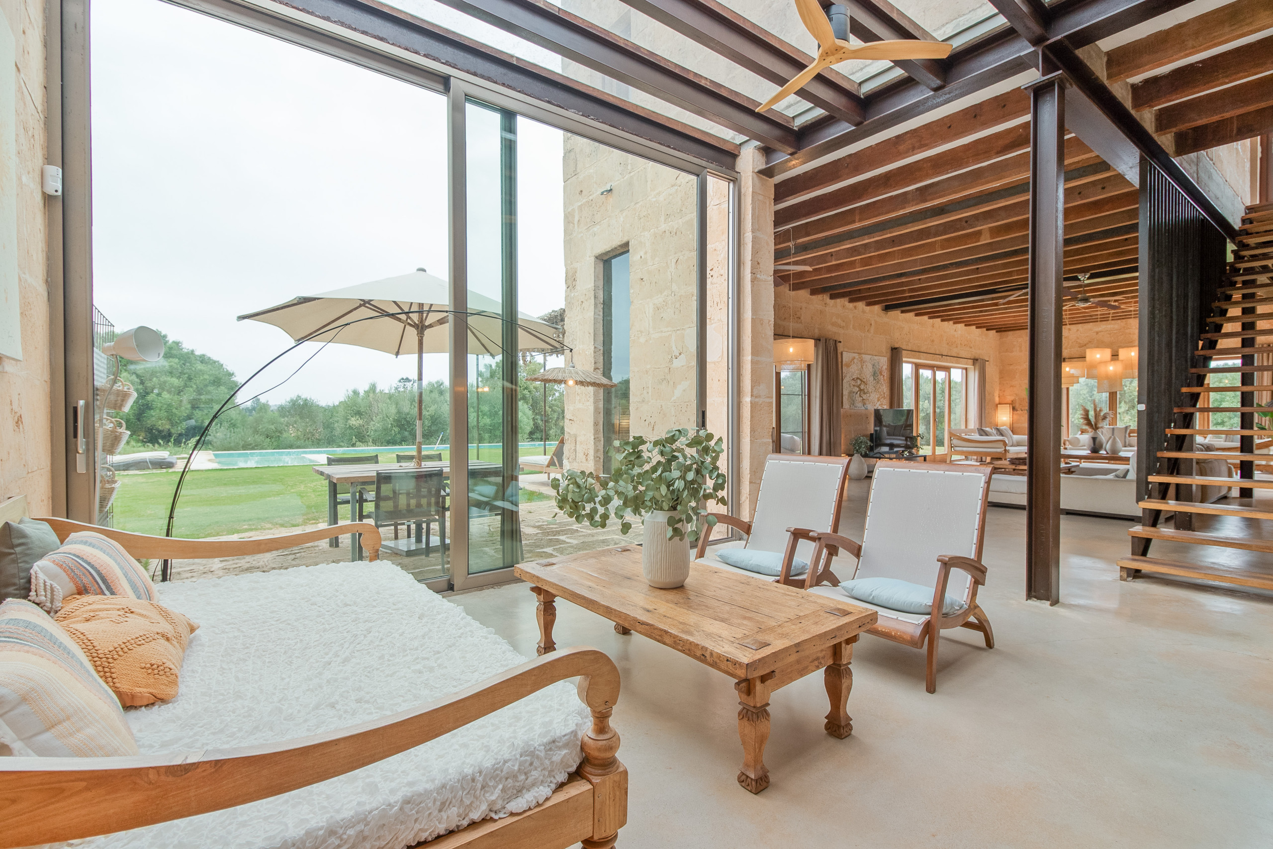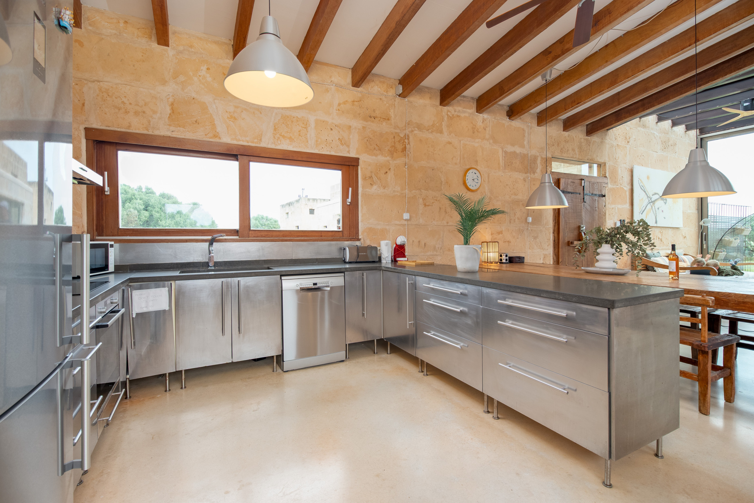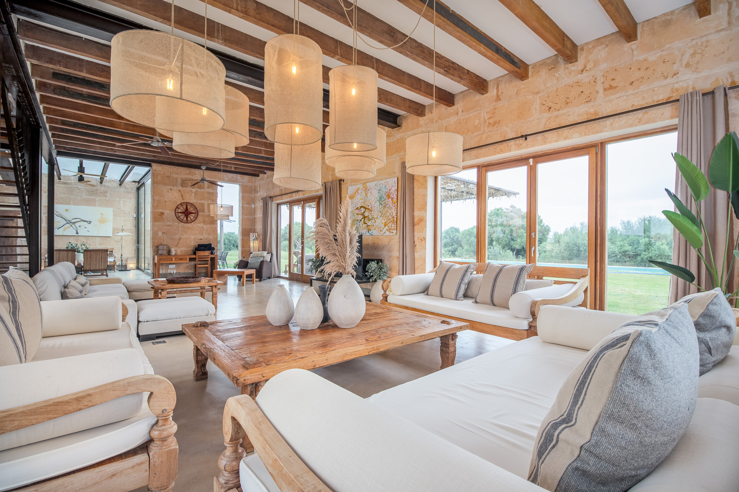 La finca fue construida en estilo tradicional con la típica piedra de Mares y combina el encanto mediterráneo con la comodidad de vivienda moderna. El luminoso salón-comedor convence por sus estructuras abiertas, una cocina totalmente equipada y acceso directo a las terrazas. Grandes superficies acristaladas crean una atmósfera acogedora y conectan el interior y el exterior de manera armoniosa.
