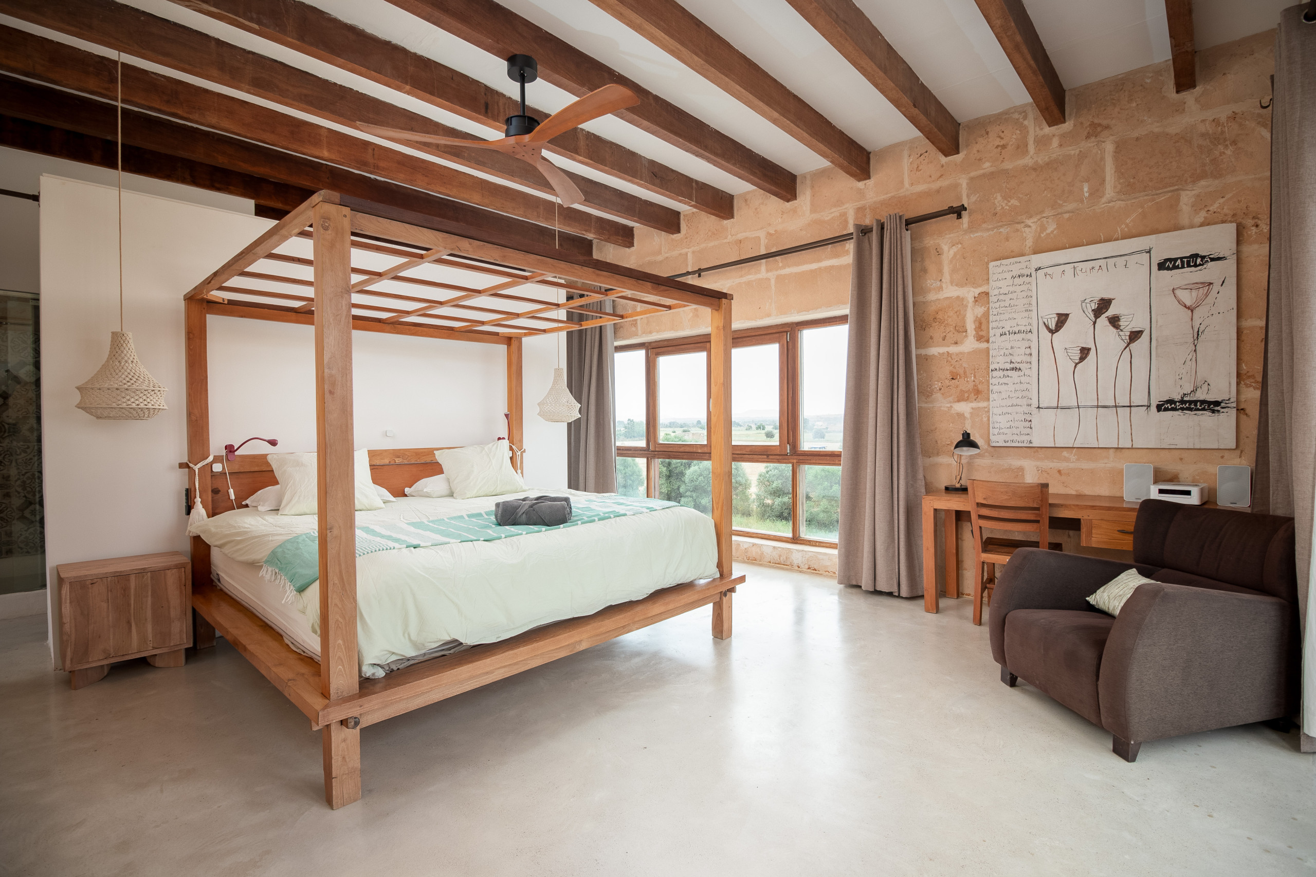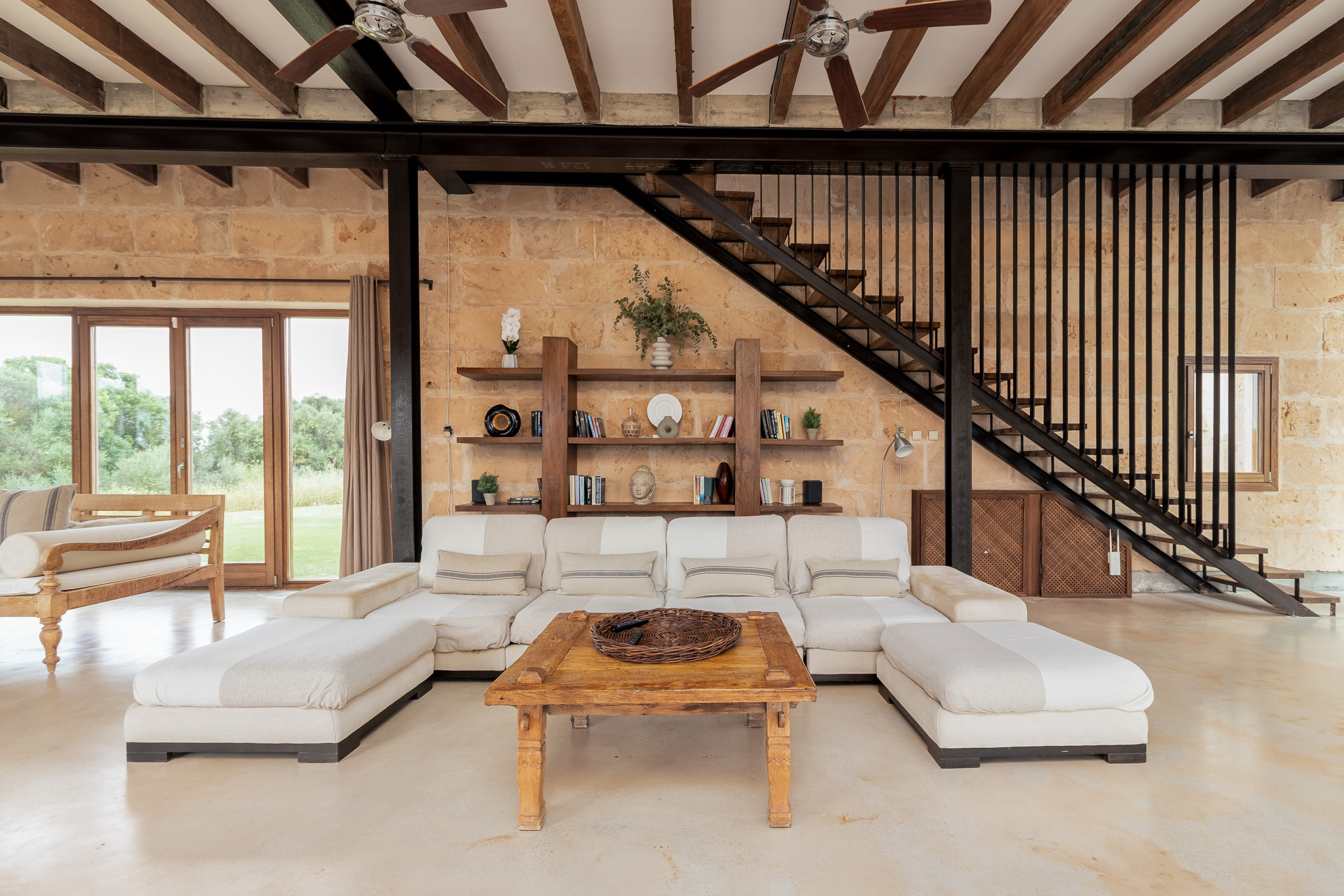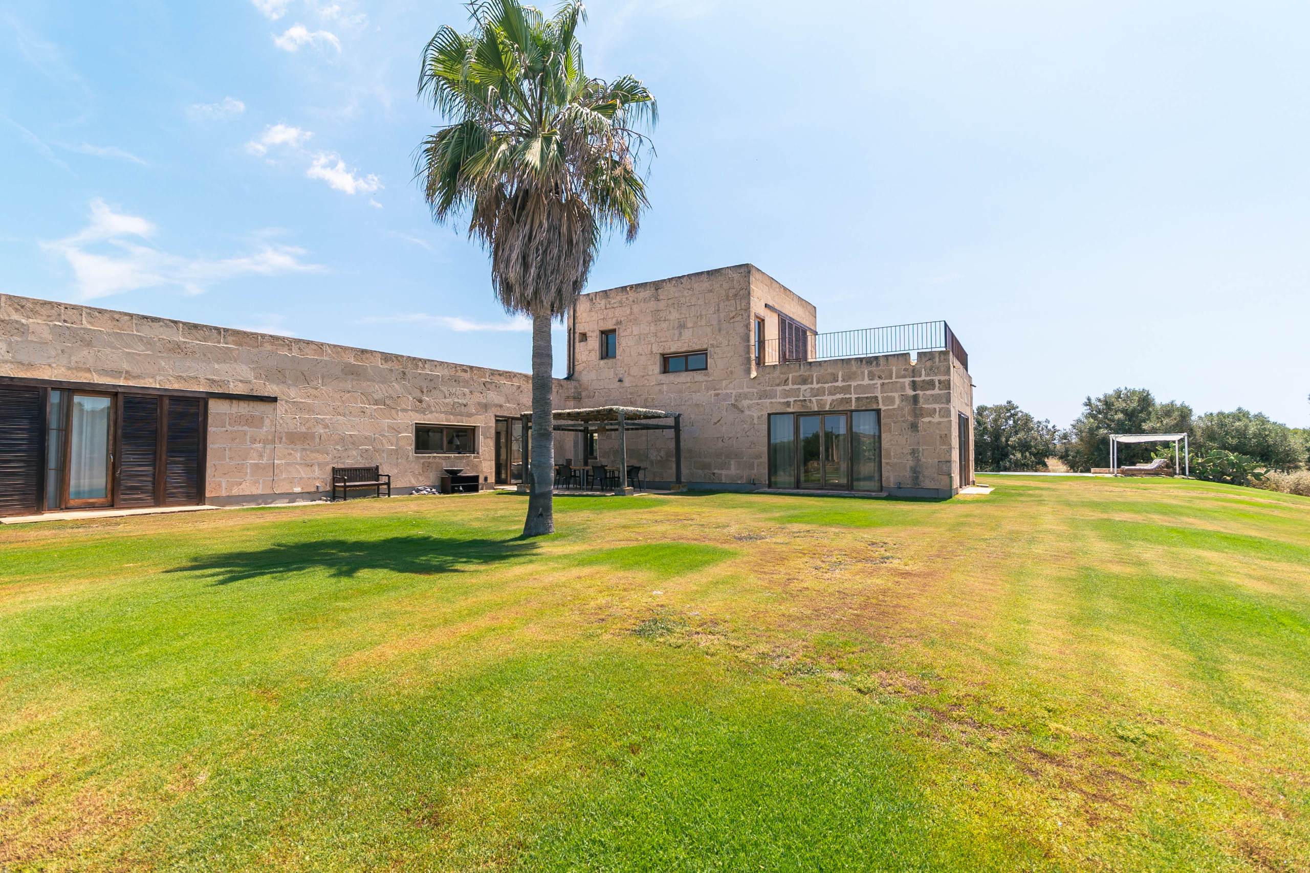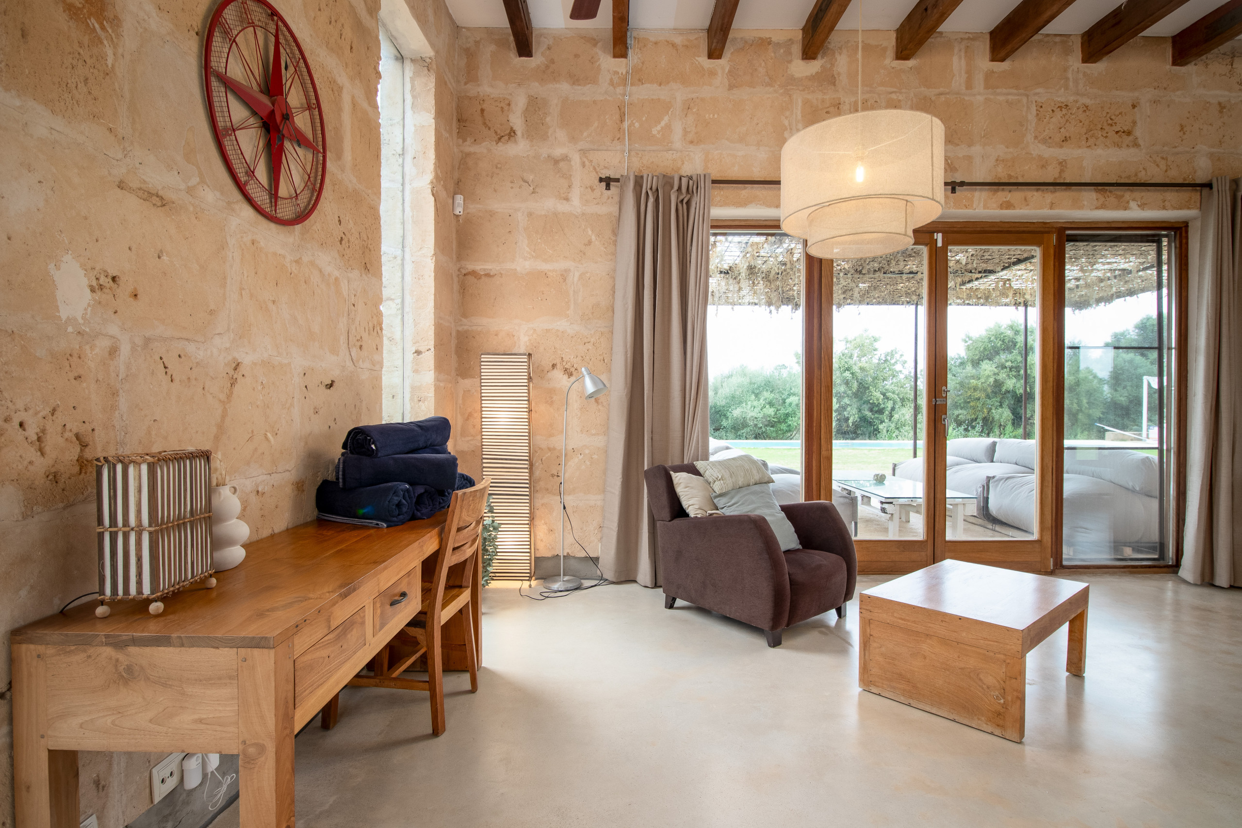 La finca fue construida en estilo tradicional con la típica piedra de Mares y combina el encanto mediterráneo con la comodidad de vivienda moderna. El luminoso salón-comedor convence por sus estructuras abiertas, una cocina totalmente equipada y acceso directo a las terrazas. Grandes superficies acristaladas crean una atmósfera acogedora y conectan el interior y el exterior de manera armoniosa.