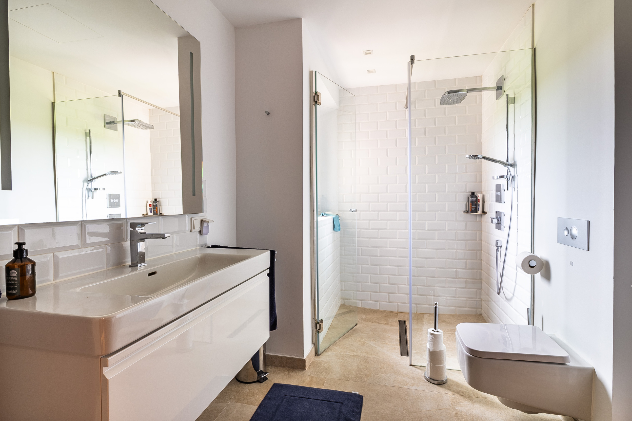 En la planta superior se despliega la zona privada de retiro de la finca. El área principal impresiona por su tamaño extraordinario y generosidad, ofreciendo múltiples posibilidades de diseño que van mucho más allá de un dormitorio clásico. Se complementa con un vestidor así como un espacioso cuarto de baño con bañera. Un segundo dormitorio en esta planta también dispone de su propio cuarto de baño en suite. Además, hay una oficina aquí, que puede utilizarse de forma flexible también como dormitorio adicional. Todas las habitaciones están equipadas con armarios empotrados y ofrecen acceso a balcones con vistas a la naturaleza circundante.