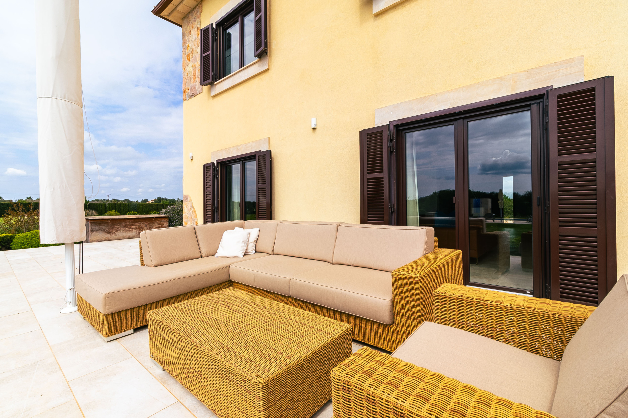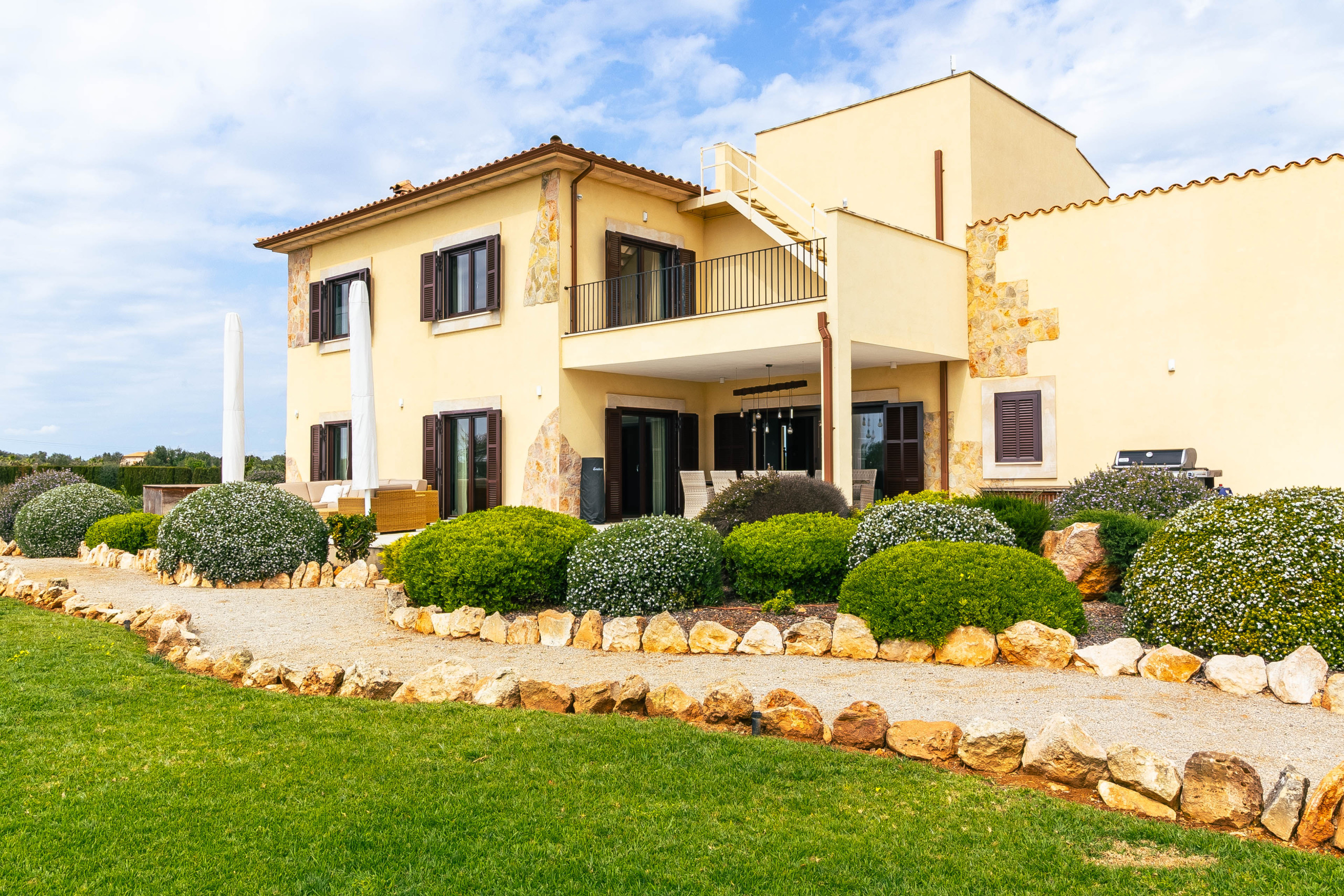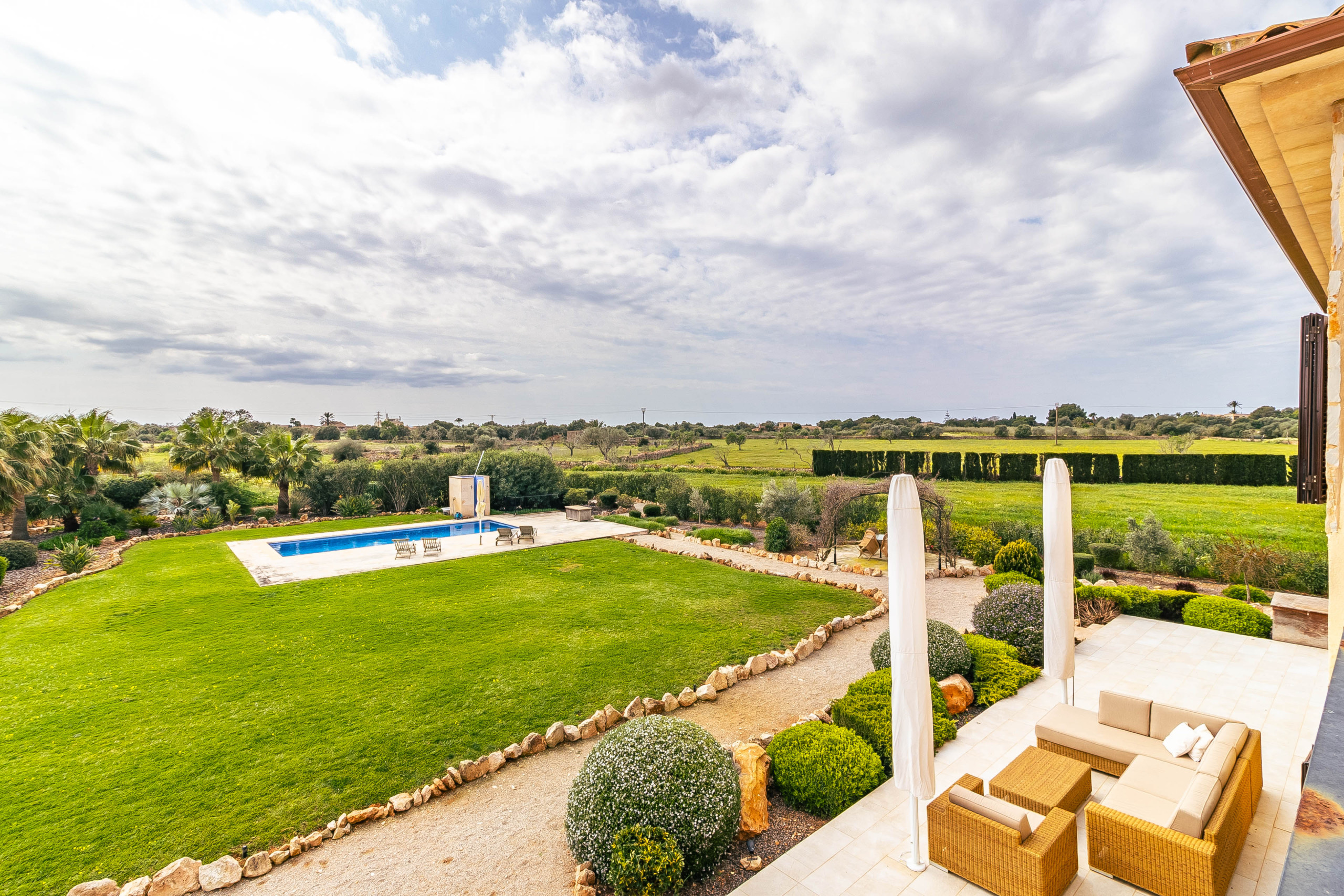 El área exterior es un verdadero punto destacado de esta propiedad. El jardín diseñado de forma extensa crea una atmósfera de tranquilidad y privacidad, mientras que la zona de piscina con una amplia terraza para tomar el sol invita a disfrutar de días relajantes bajo el sol mallorquín. Una terraza parcialmente cubierta con zona de comedor ofrece el marco perfecto para largas veladas al aire libre. Las diferentes áreas exteriores permiten disfrutar del día una y otra vez según la posición del sol y el estado de ánimo. Además, hay un garaje disponible así como amplios espacios de estacionamiento para varios vehículos. Una sala de equipos separada y otro cobertizo ofrecen almacenamiento práctico.