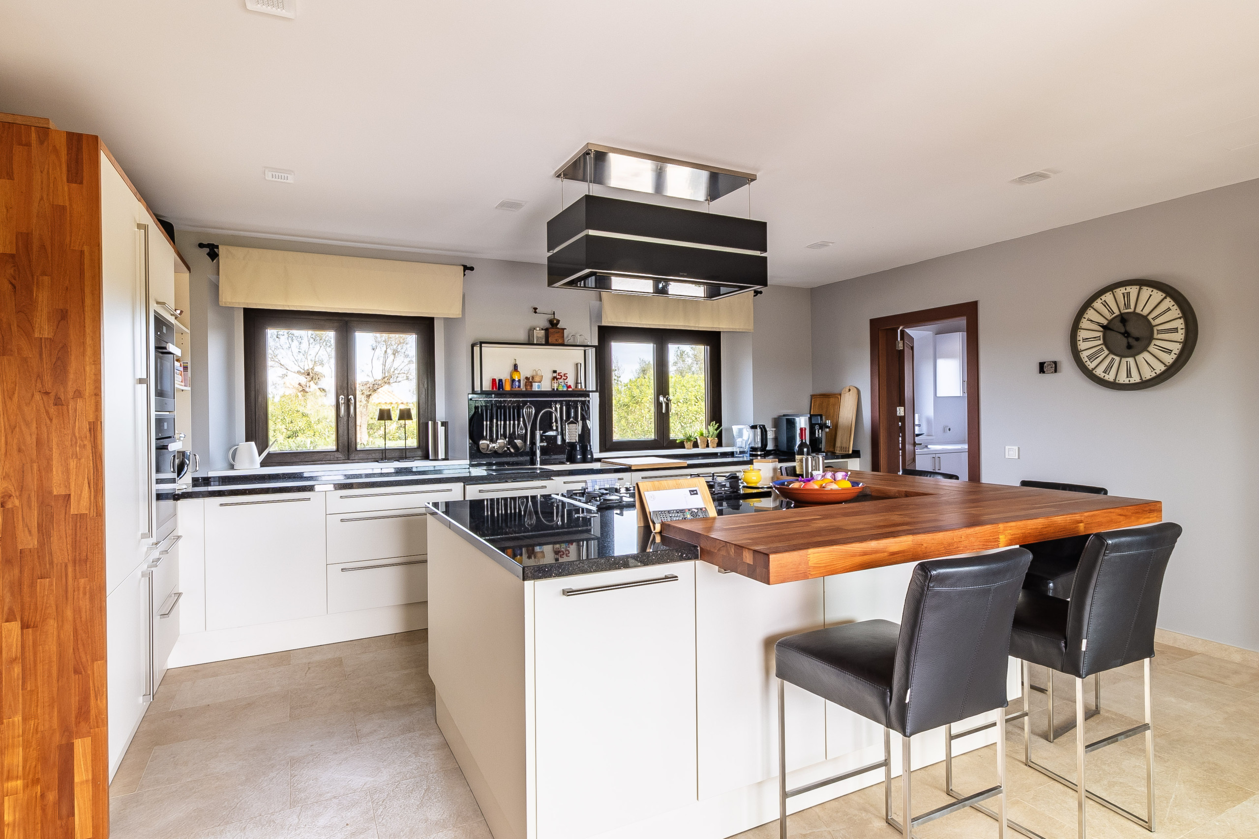 Al entrar en la casa, surge una sensación de amplitud y llegada. La zona de entrada abierta con galería crea una atmósfera acogedora y conduce directamente a la generosa sala de estar y comedor con chimenea, que forma el corazón de la finca. Los grandes ventanales proporcionan mucha luz natural y crean una conexión armoniosa entre el interior y el exterior. La cocina contigua, completamente equipada con una gran cocina de gas, ofrece mucho espacio para cocinar juntos y se complementa con una despensa separada o un cuarto de servicio. En este nivel también hay un dormitorio con baño en suite propio, ideal para huéspedes o como refugio independiente. Un aseo adicional para invitados completa la oferta de espacios en la planta baja.