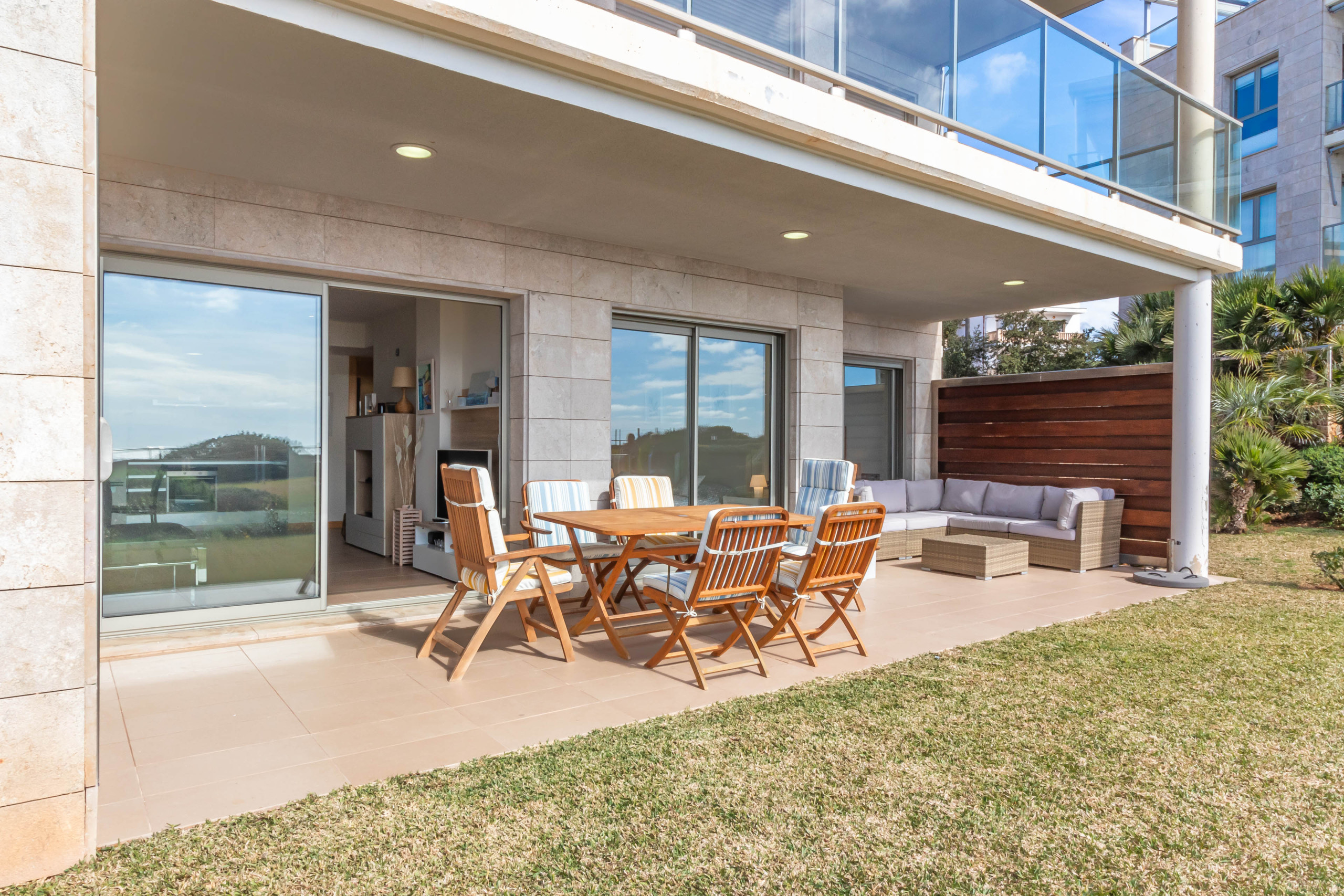 The high-quality kitchen is equipped with an induction hob, fridge, oven, microwave, dishwasher and elegant surfaces. The living room, featuring a comfortable sofa, offers a space to relax and take in the surroundings. From both the living area and the bedrooms, there is direct access to the covered terrace, which is fitted with a dining table and comfortable lounge furniture. The adjacent garden, bordered by hedges, offers privacy and a tranquil setting for outdoor living.