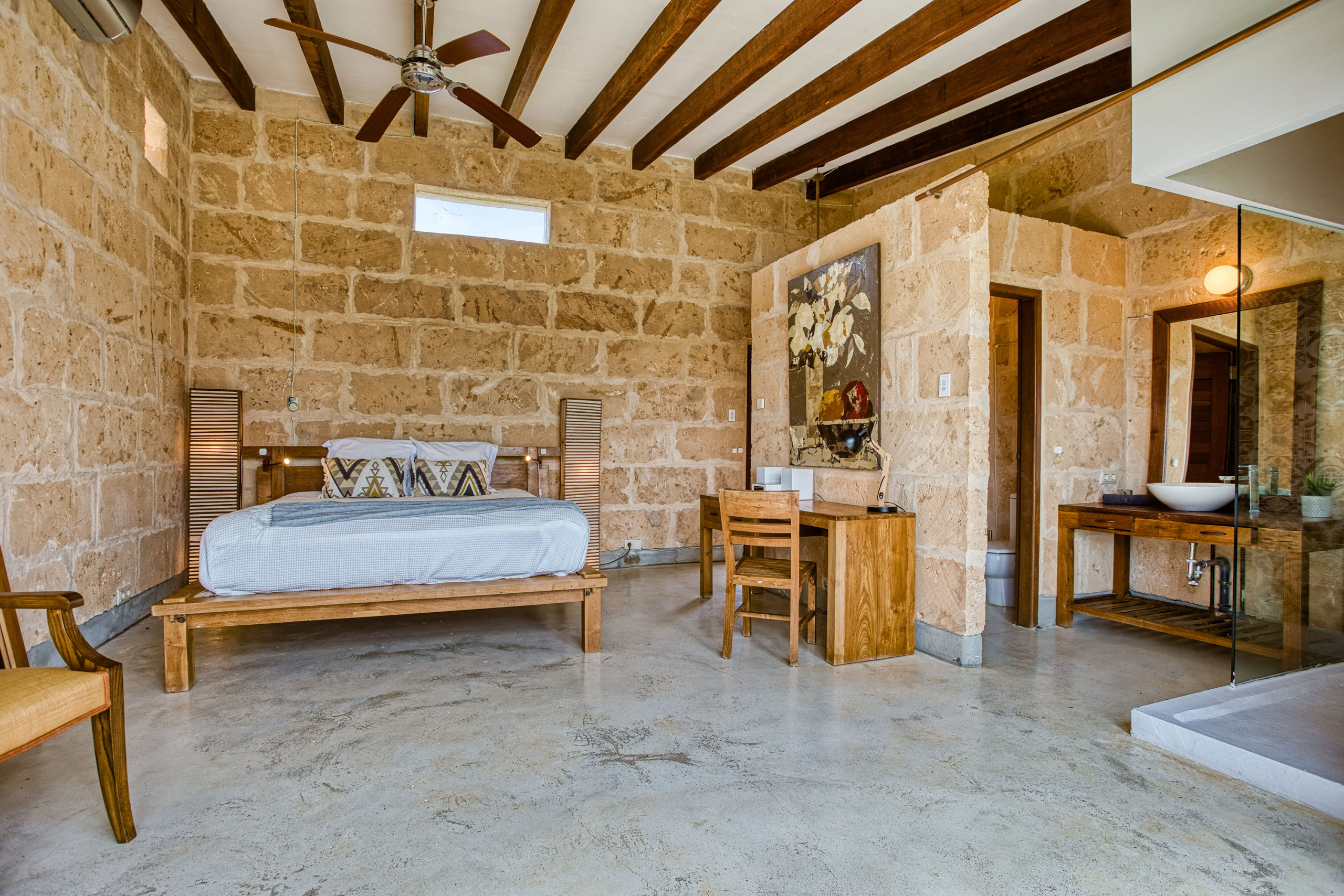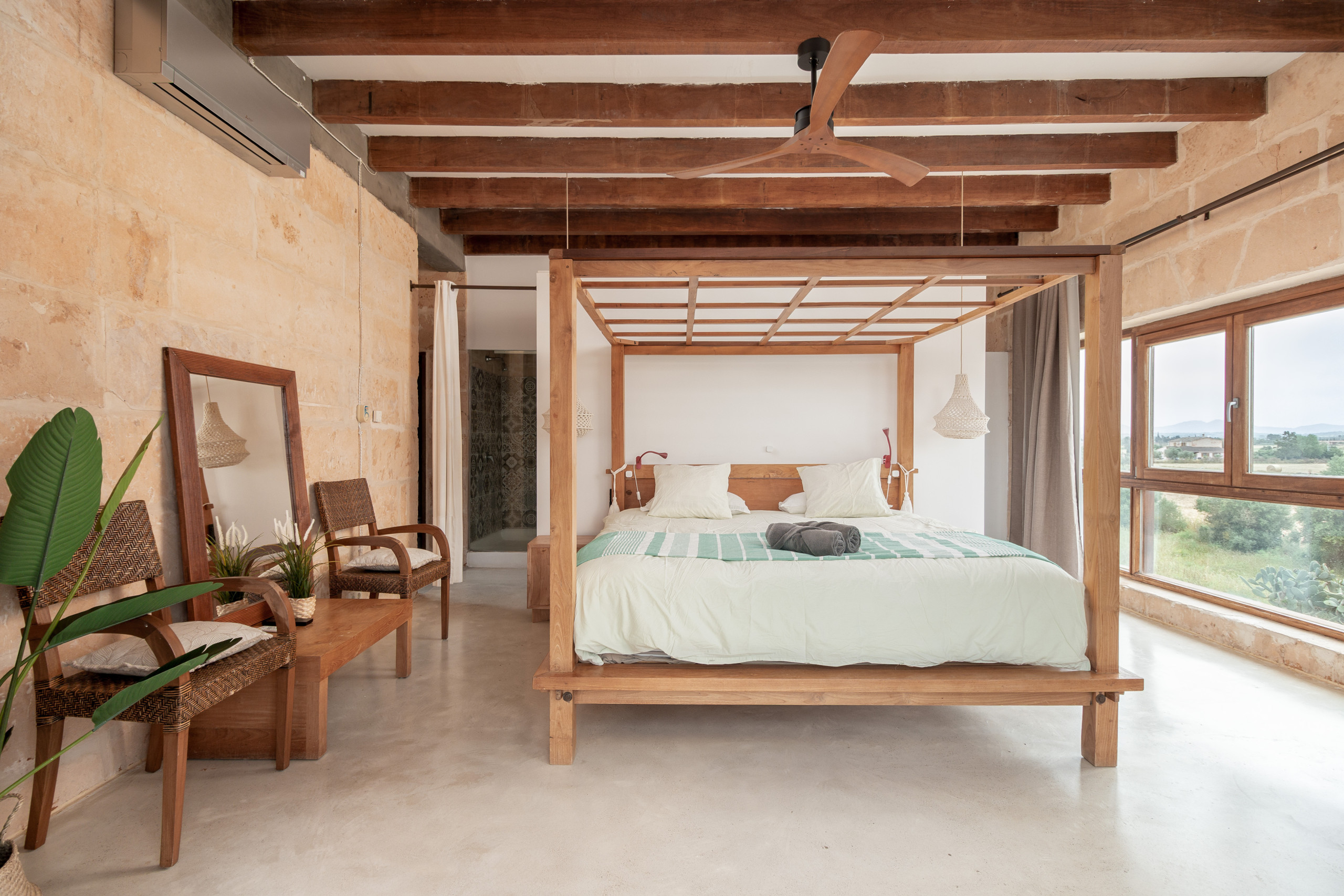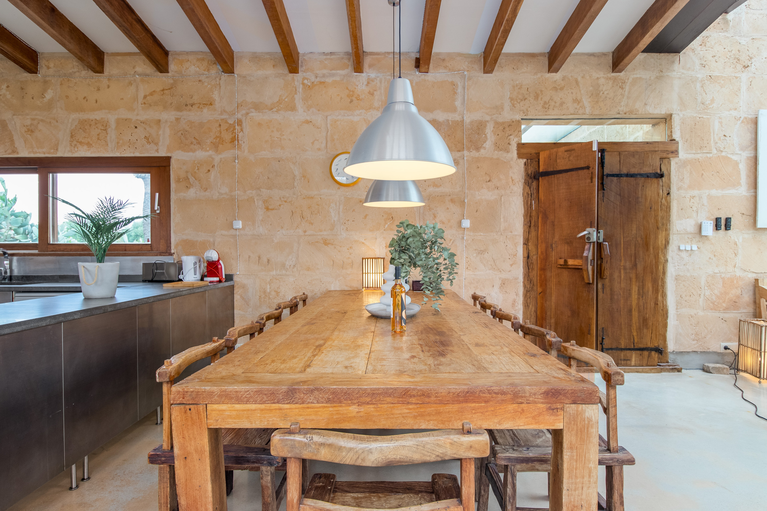 The finca was built in traditional construction using typical Mares stone and combines Mediterranean charm with modern living comfort. The bright living and dining area impresses with open structures, a fully equipped kitchen and direct access to the terraces. Large glass fronts create a friendly atmosphere and harmoniously connect the interior and exterior areas.