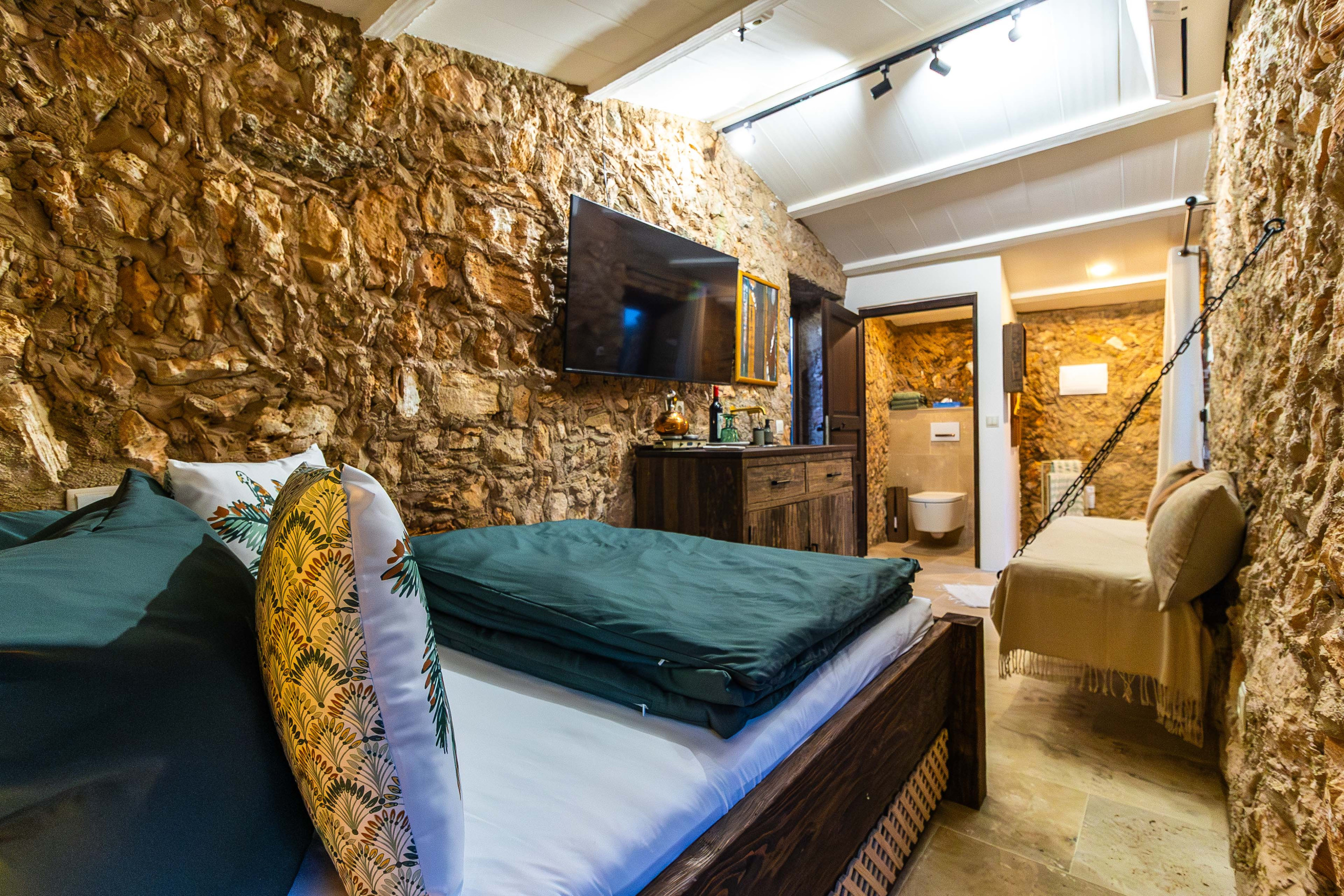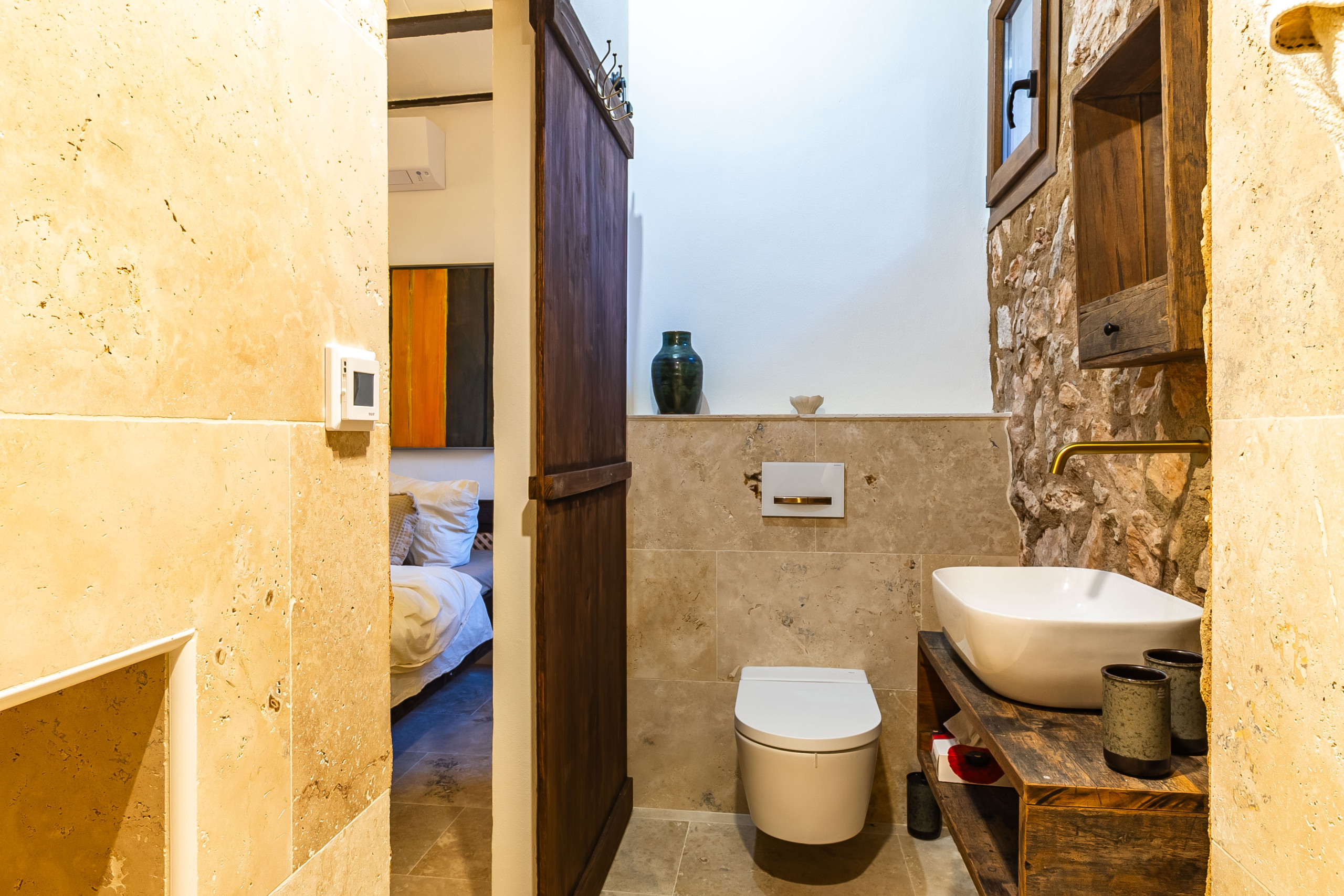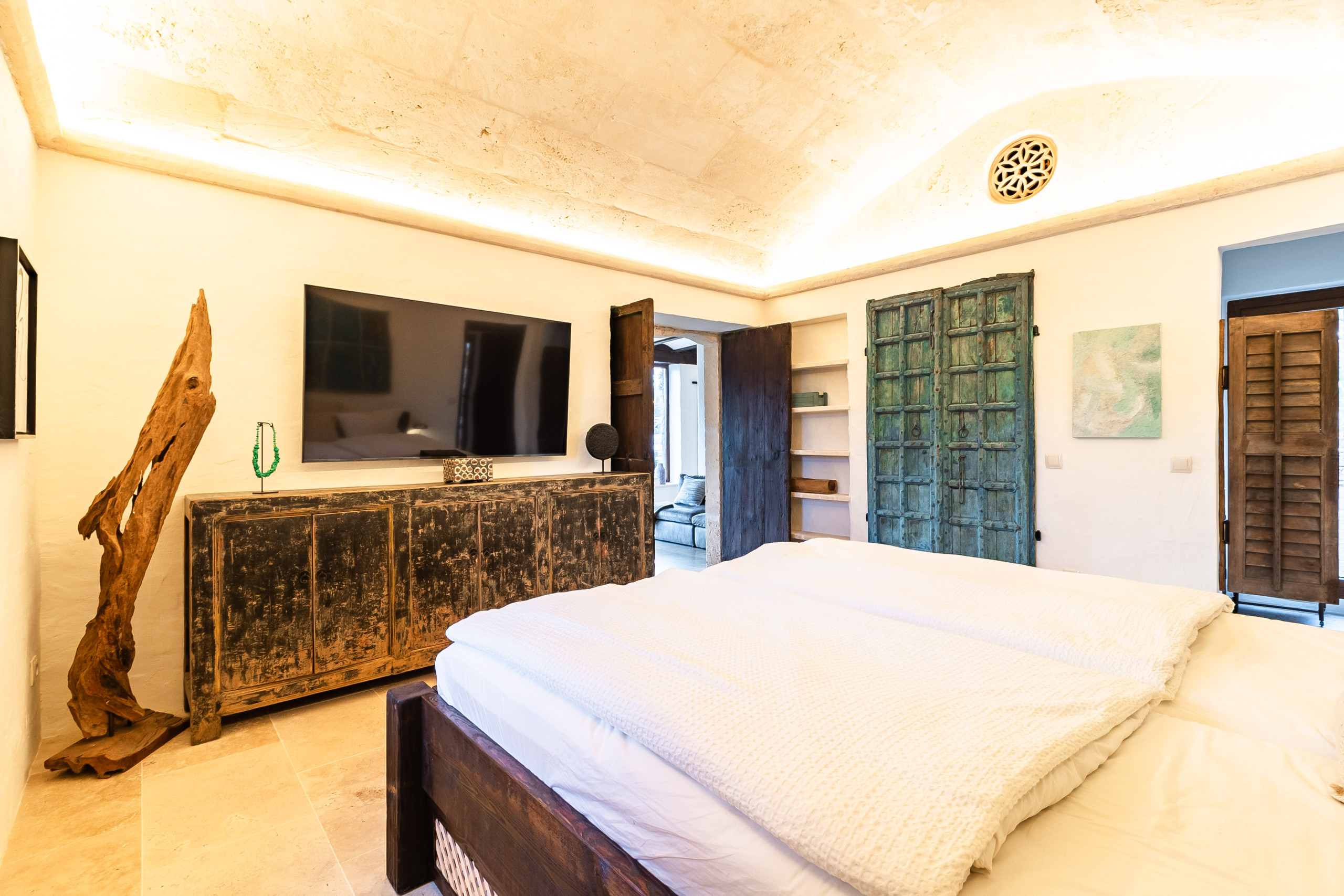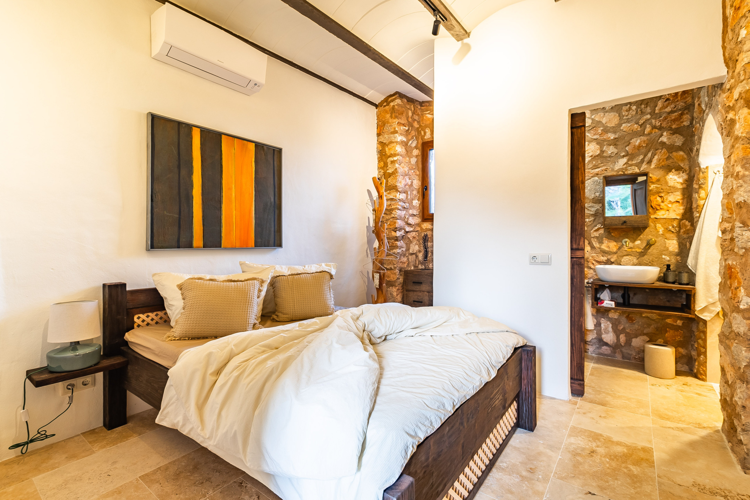 On approximately 175 m² of living space, you can also expect two comfortable bedrooms with double beds and each with its own en-suite bathroom. The main bedroom features a spacious bathroom with shower and bathtub, while the second bathroom is equipped with a shower and toilet. Natural stone elements, vaulted ceilings and warm materials give the finca its distinctive Mediterranean character. An utility room provides additional practical comfort in everyday life.