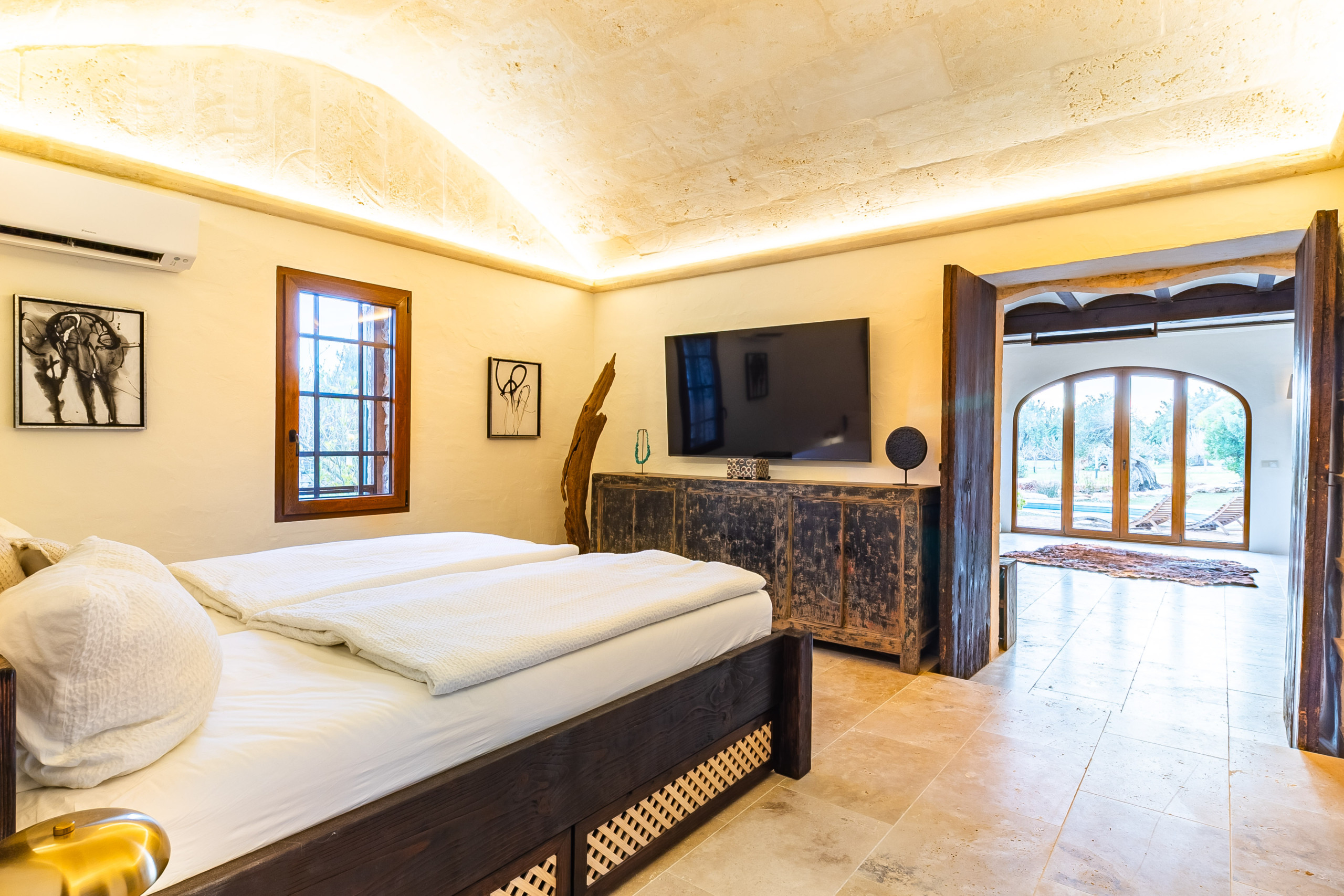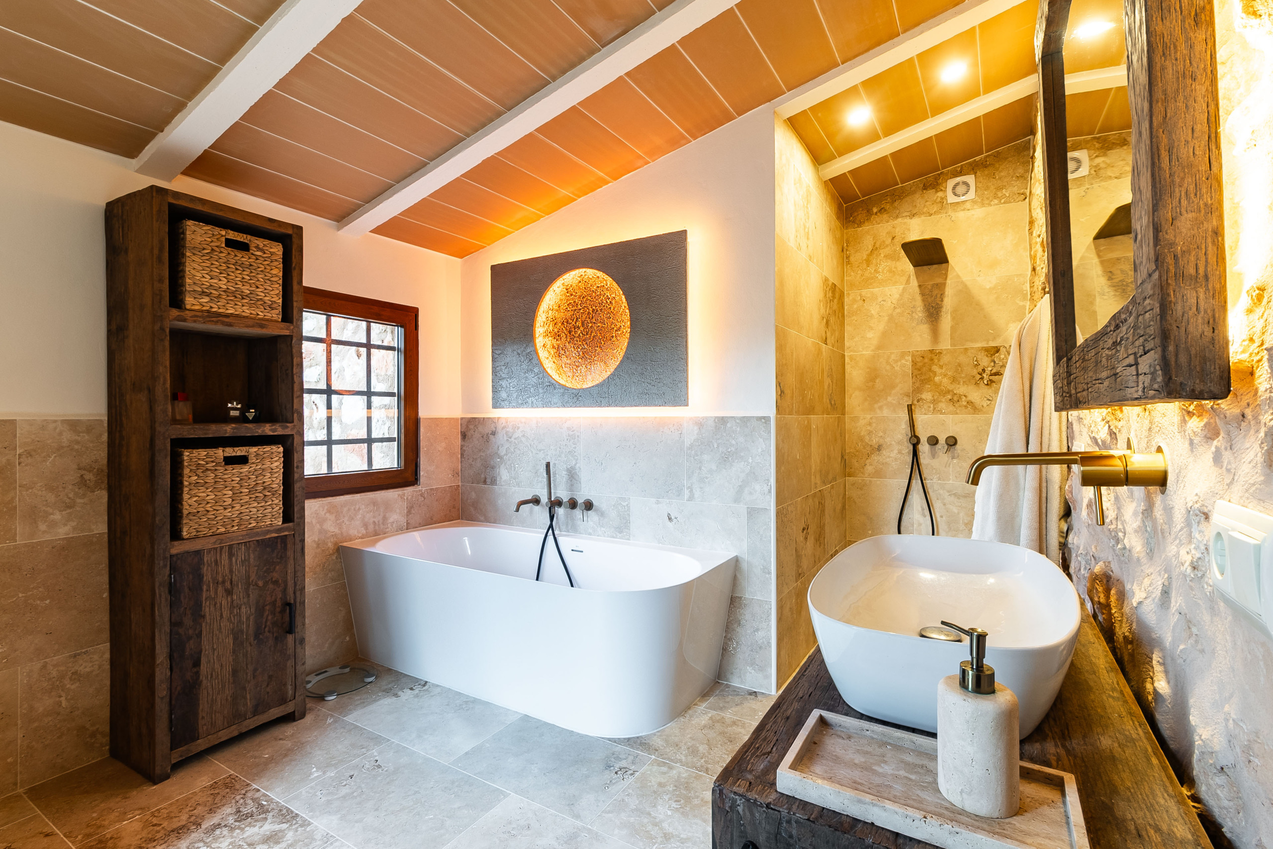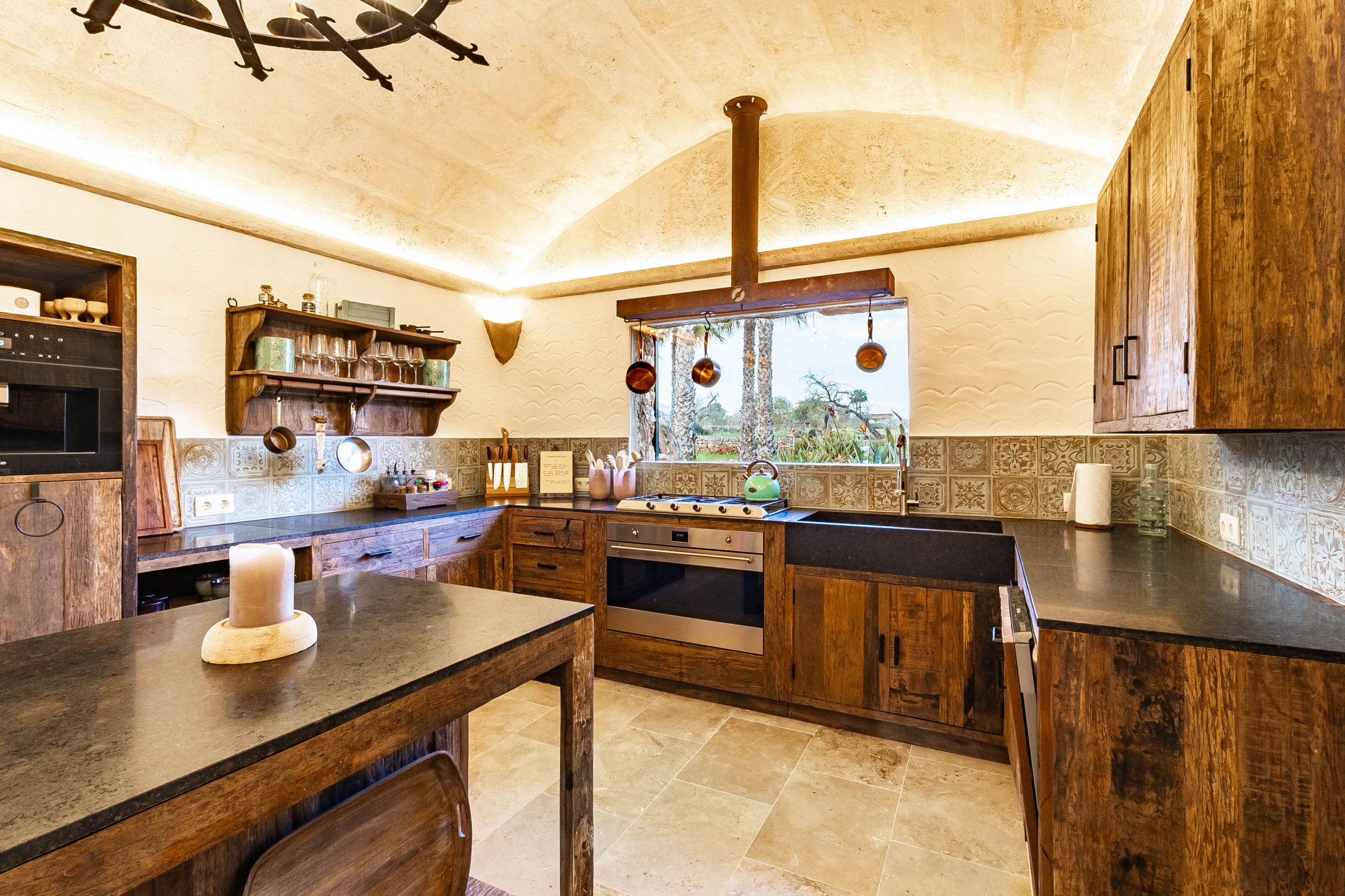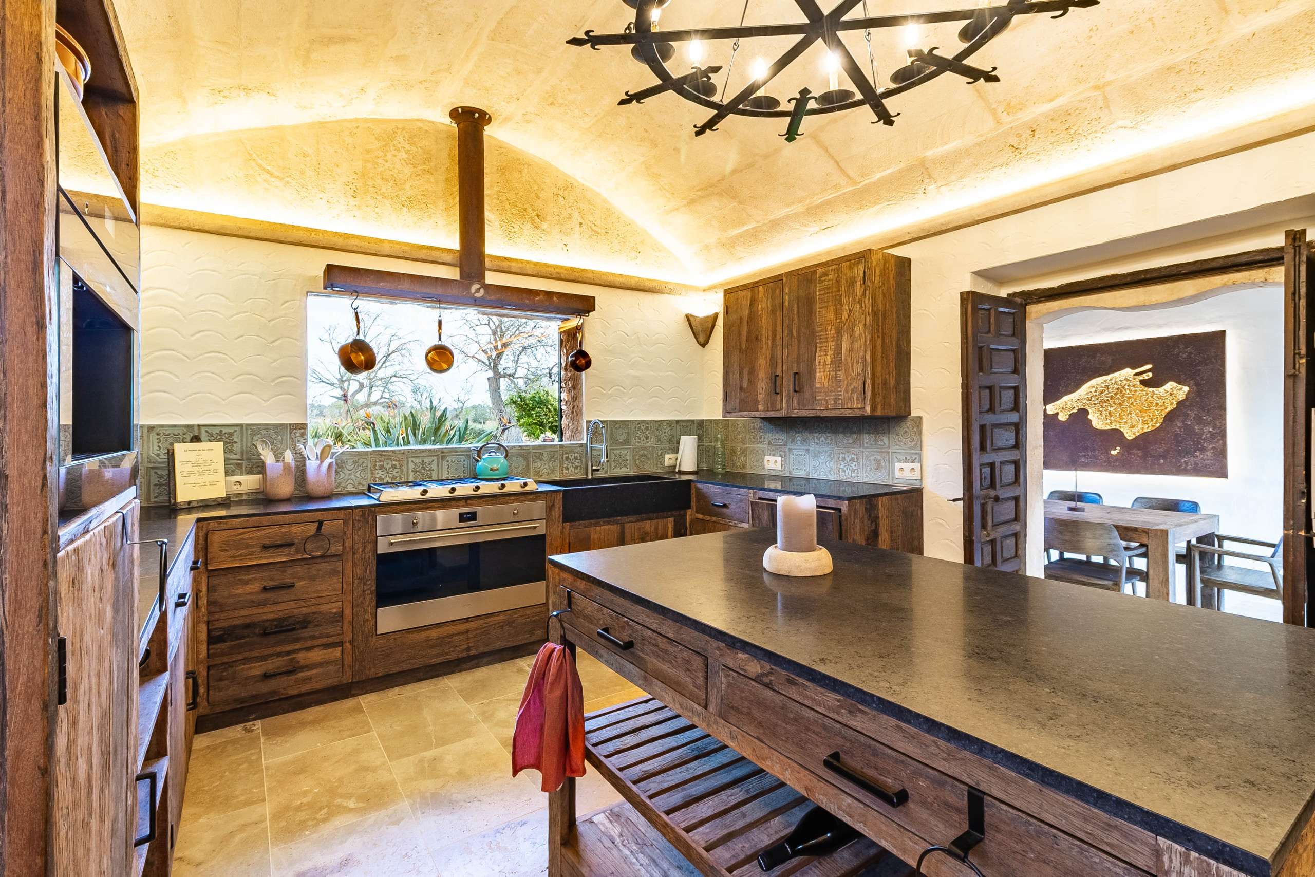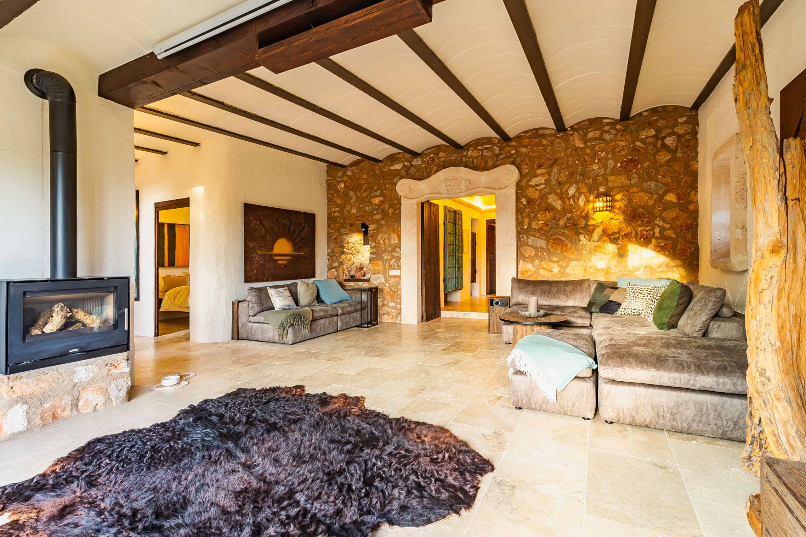 The heart of the finca is the cosily furnished living area with a heating fireplace, which creates a warm and inviting atmosphere. Large windows open up a beautiful view of the garden and pool and connect the indoor and outdoor areas in a harmonious way. The adjacent dining area invites you to sociable evenings, while the separate kitchen with its charming design and functional equipment is ideal for enjoyable hours with family and friends.